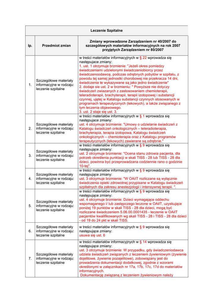 Leczenie Szpitalne lp. Przedmiot zmian Zmiany wprowadzone Zarządzeniem nr 40/2007 do szczegółowych materiałów informacyjnych na rok 2007 przyjętych Zarządzeniem nr 80/2007 w treści materiałów informacyjnych w § 22 wprowadza się następujace zmiany: 1. ust. 1 otrzymuje brzmienie: "Jeżeli okres pomiedzy świadczeniami udzielonymi świadczeniobiorcy przez świadczenoodawcę, podczas odrębnych pobytów w szpitalu, z powodu tej samej jednostki chorobowej nie przekracza 14 dni, świadczenia te wykazywane są jako jedno świadczenie" 2. dodaje sie ust. 2 w brzmieniu: " Powyższe nie dotyczy świadczeń zwiazanych z zastosowaniem chemioterapii, teleradioterapii, brachyterapii, terapii izotopowej i substancji czynnej, ujętej w Katalogu substancji czynnych stosowanych w programach terapeutycznych (lekowych), a także związanego z tym leczenia objawowego. 3. ust. 2 staje się ust. 3. w treści materiałów informacyjnych w § 1 wprowadza się następujace zmiany: ust. 4 otrzymuje brzmienie: "Umowy o udzielanie świadczeń z Katalogu świadczeń onkologicznych – teleradioterapia, brachyterapia, terapia izotopowa, Katalogu świadczeń onkologicznych – chemioterapia oraz z Katalogu programów terapeutycznych (lekowych) zawierane są odrębnie." w treści materiałów informacyjnych w § 9 wprowadza się następujące zmiany: ust. 2 otrzymuje brzmienie: "Ocena stanu zdrowia pacjenta, dla potrzeb określenia punktacji w skali TISS - 28 lub TISS - 28 dla dzieci, powinna być przeprowadzana codziennie rano o godzinie 10-tej". w treści materiałów informacyjnych w § 9 wprowadza się następujące zmiany: ust. 3 otrzymuje brzmienie: "W OAiIT rozliczane są wyłącznie świadczenia opieki zdrowotnej przypisane w Katalogu świadczeń szpitalnych dla zakresu anestezjologii i intensywnej terapii. ". w treści materiałów informacyjnych w § 9 wprowadza się następujące zmiany: ust. 4 otrzymuje brzmienie: Dzieci wymagające oddechu wspomaganego i/ lub zastępczego leczone w OAiIT, uzyskujące poniżej 19 punktów w skali TISS - 28 dla dzieci, mogą być rozliczane świadczeniem 5.06.00.0001435 - leczenie w OAiIT pacjentów kwalifikowanych wg skali TISS - 28 i TISS - 28 dla dzieci - od 19 do 24 pkt w skali TISS. 1. Szczegółowe materiały informacyjne w rodzaju: leczenie szpitalne 2. Szczegółowe materiały informacyjne w rodzaju: leczenie szpitalne 3. Szczegółowe materiały informacyjne w rodzaju: leczenie szpitalne 4. Szczegółowe materiały informacyjne w rodzaju: leczenie szpitalne 5. Szczegółowe materiały informacyjne w rodzaju: leczenie szpitalne 6. Szczegółowe materiały informacyjne w rodzaju: leczenie szpitalne w treści materiałów informacyjnych w § 9 wprowadza się następujące zmiany: usuwa się ust. 6 Szczegółowe materiały informacyjne w rodzaju: leczenie szpitalne w treści materiałów informacyjnych w § 14 wprowadza się następujące zmiany: ust. 3 otrzymuje brzmienie: W przypadku, gdy świadczeniodawca udziela świadczeń związanych z leczeniem żywieniowym (żywienie dojelitowe, żywienie pozajelitowe), zobowiązany jest do prowadzenia dokumentacji dodatkowej, zgodnie z wzorami określonymi w załącznikach nr 17a, 17b, 17c, 17d do materiałów informacyjnych. Dokumentację związaną z leczeniem żywieniowym należy 7. archiwizować w historii choroby. 8. Szczegółowe materiały informacyjne w rodzaju: leczenie szpitalne 9. Szczegółowe materiały informacyjne w rodzaju: leczenie szpitalne Szczegółowe materiały 10. informacyjne w rodzaju: leczenie szpitalne Szczegółowe materiały 11. informacyjne w rodzaju: leczenie szpitalne 12. Zał. nr 13 do mat. inf. w rodzaju SZP 13. Zał. nr 13 do mat. inf. w rodzaju SZP 14. Zał. nr 13 do mat. inf. w rodzaju SZP w treści materiałów informacyjnych w § 17 wprowadza się następujące zmiany: 1. usuwa się ust. 9; 2. ust. 10 staje się ust. 9 i otrzymuje brzmienie:"w przypadku świadczeń związanych z diagnostyką i leczeniem (operacyjnym i nieoperacyjnym) urazowych uszkodzeń wielomiejscowych (wielonarządowych), do rozliczenia można je łączyć zgodnie z następującą zasadą: jedno z udzielonych świadczeń – 100% wartości punktowej, kolejne w następujących proporcjach - 60% wartości, 30% wartości, 10% wartości". w treści materiałów informacyjnych w § 17 wprowadza się następujące zmiany: ust. 11 staje się ust. 10 i otrzymuje brzmienie:"dzień przyjęcia do leczenia oraz dzień jego zakończenia wykazywany jest do rozliczenia jako jeden osobodzień z wyjątkiem świadczeń udzielanych w trybie jednodniowym". w treści materiałów informacyjnych w § 17 wprowadza się następujące zmiany: ust. 12 staje się ust. 11 i otrzymuje brzmienie:"w przypadku świadczeń, do których kwalifikuje się na podstawie oceny w skali TISS - 28 lub TISS - 28 dla dzieci, świadczeniodawca do rozliczenia wykazać może świadczenie o wyższej wartości punktowej spośród dni, o których mowa w punkcie 10". w treści materiałów informacyjnych w § 23 wprowadza się następujace zmiany: 1. ust. 1 otrzymuje brzmienie: "Na umotywowany wniosek świadczeniodawcy, dyrektor oddziału wojewódzkiego Funduszu może wyrazić zgodę na wprowadzenie zmian w indywidualnym pakiecie świadczeniodawcy w systemie informatycznym, dotyczących uprawnień do rozliczania świadczeń w określonym zakresie lub sumowania świadczeń." 2. dodaje sie ust. 2 w brzmieniu: "Nie dopuszcza się wprowadzania zmian w indywidualnym pakiecie świadczeniodawcy, polegających na możliwości rozliczania w OAiIT świadczeń innych niż określone w Katalogu świadczeń szpitalnych dla zakresu anestezjologii i intensywnej terapii". 3. Nie dopuszcza się zmian w indywidualnym pakiecie świadczeniodawcy, polegających na możliwości rozliczania świadczeń, dla których określono warunki udzielania wyłącznie w ramach hospitalizacji do wykonywania w trybie jednodniowym. w poz. nr 1 świadczenie 5.06.00.0000070 - zakrzepica naczyniow