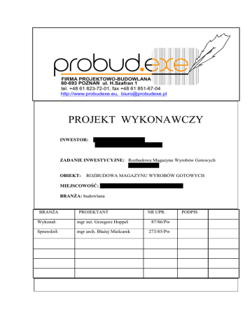 FIRMA PROJEKTOWO-BUDOWLANA 60-693 POZNAŃ ul. H.Szafran 1 tel. +48 61 823-72-01, fax +48 61 851-67-04 http://www.probudexe.eu, [email protected] PROJEKT WYKONAWCZY INWESTOR: „AMICA WRONKI S.A.” 64-510 Wronki ul.Mickiewicza 52 ZADANIE INWESTYCYJNE: Rozbudowa Magazynu Wyrobów Gotowych Fabryki Kuchni OBIEKT: ROZBUDOWA MAGAZYNU WYROBÓW GOTOWYCH MIEJSCOWOŚĆ: WRONKI, ul.Mickiewicza 52, dz. nr 1729 BRANŻA: budowlana BRANŻA PROJEKTANT NR UPR. Wykonał: mgr inż. Grzegorz Hoppel 87/86/Pw Sprawdził: mgr arch. Błażej Mielcarek 273/85/Pw PODPIS AMICA WRONKI S.A. – ROZBUDOWA MAGAZYNU WYROBÓW GOTOWYCH FABRYKI KUCHNI SPIS TREŚCI 1.Strona tytułowa 2.Spis treści opracowania 3.Opis techniczny. 4.Rysunki : 00. Inwentaryzacja budowlana. 01. Rzut fundamentów. 02. Rzut przyziemia. 03. Przekroje. 04. Schemat obudowy. 05. Kolejność robót rozbiórkowo-montażowych. 06. Stopy fundamentowe F1-F3, cokoły żelbetowe. Zestawienie stali zbrojeniowej. 07. Słupy stalowe S1L, S1P, S2L, S2P, SS1, SS2, SS3, SH. 08. Podciąg stalowy PH, dźwigary dachowe D1, D2, D3, słupki stężeń ST1ST3, krzyżulce stężeń K1-K2, nadproża nadbramowe N1-N2. 09. Element kratowy R1, element ścienny R2. 5.Zestawienie stali profilowej. PROBUD.EXE – październik 2008 PROJEKT WYKONAWCZY – Opis techniczny - strona 2 AMICA WRONKI S.A. – ROZBUDOWA MAGAZYNU WYROBÓW GOTOWYCH FABRYKI KUCHNI OPIS TECHNICZNY 1. Przedmiot opracowania Przedmiotem opracowania jest projekt wykonawczy rozbudowy magazynu wyrobów gotowych Fabryki Kuchni. Rozbudowę przewidziano na działce nr 1729 na, terenie Zakładu AMICA WRONKI S.A. przy ul.Mickiewicza 52 we Wronkach. 2. Podstawy opracowania 1. Zlecenie Inwestora nr 93/INW/08 z dnia 01.09.2008 r. 2. Projekt powykonawczy architektoniczno-konstrukcyjny „Magazyn wyrobów gotowych Fabryki Kuchni” opracowany przez CDF Architekci - Biuro Projektowe, ul.Marcelińska 90 PGK Centrum, 60-324 Poznań, w październiku 2005 r. 3. Projekt budowlany, wielobranżowy „Rozbudowa magazynu wyrobów gotowych Fabryki Kuchni” opracowany przez CDF Architekci - Biuro Projektowe, ul.Marcelińska 90 PGK Centrum, 60-324 Poznań, w styczniu 2007 r. 4. Pomiary inwentaryzacyjne istniejącego magazynu wyrobów gotowych wraz z bezpośrednim otoczeniem w rejonie rozbudowy, przeprowadzone w dniach 28 stycznia i 25 września 2008 r. 5. Uzgodnienia z inwestorem. 6. Obowiązujące normy i przepisy budowlane. 3. Charakterystyka budowlana obiektu Zaprojektowano rozbudowę istniejącego magazynu wyrobów gotowych w postaci przybudówki wokół tzw. strefy załadunku wagonu. Zaprojektowano obiekt parterowy, niepodpiwniczony o konstrukcji stalowej. Budynek posiada ustrój jednonawowej hali z symetrycznym dwuspadowym dachem o nachyleniu 5% i kalenicy prostopadłej do bocznej ściany magazynu, do którego ma zostać dobudowany. Fundamenty zaprojektowano w postaci stóp i cokołów żelbetowych, monolitycznych. Obudowę ścian w postaci kaset wypełnionych wełną mineralną z wykończeniem blachą trapezową. Konstrukcję dachu stanowi blacha trapezowa w układzie bezpłatwiowym ocieplona wełną mineralną i wykończona papą termozgrzewalną. Dodatkową trudność stanowiła konieczność przeprowadzenia przez kubaturę rozbudowy wiązki rur biegnących na estakadzie przy ścianie magazynu. Problem ten rozwiązano projektując wewnątrz budynku rodzaj poziomego tunelu obejmującego rury w sposób umożliwiający ich niezależną pracę. Zasadnicze wymiary rozbudowy: • Długość – 9.265 m (mierzona prostopadle do ściany magazynu) • Szerokość – 8.93 m (rozpiętość modularna konstrukcji – 8.33 m) • Wysokość – 8.70 m (do okapu), 8.93 m do kalenicy Pozostałe parametry techniczne: • powierzchnia zabudowy – 82.70 m2 • powierzchnia użytkowa – 75.68 m2 • kubatura – 733.79 m3 PROBUD.EXE – październik 2008 PROJEKT WYKONAWCZY – Opis techniczny - strona 3 AMICA WRONKI S.A. – ROZBUDOWA MAGAZYNU WYROBÓW GOTOWYCH FABRYKI KUCHNI 4. Warunki gruntowo-wodne Na podstawie informacji zawartych w projekcie budowlanym w podłożu pod zaprojektowanym magazynem występują następujące warstwy gruntowe: • • • • • nasypy o miąższości 0.50-0.80 m piaski i pospółki średniozagęszczone – Id=0.45 gliny zwałowe w postaci glin piaszczystych o stopniu plastyczności Il=0.00-0.05 pyły i gliny pylaste o stopniu plastyczności Il=0.25 iły z przewarstwieniami piasków pylastych o stopniu plastyczności Il=0.05 Woda gruntowa o napiętym zwierciadle stabilizowała się w roku 2004 roku na poziomie 1.70 do 2.50 m poniżej poziomu terenu. Ze względu na lokalizację rozbudowy bezpośrednio przy magazynie wyrobów gotowych, hali Fabryki Kuchni i estakadzie z rurociągami, należy się spodziewać występowania w podłożu gruntów nasypowych użytych do zasypania wykopów fundamentowych powstałych podczas realizacji tych obiektów. Wytyczne wykonania robót fundamentowych zawarto w pnkt.11 niniejszego opisu. 5. Rzędna odniesienia Jako rzędną odniesienia przyjęto poziom posadzki przyziemia w istniejącym magazynie wyrobów gotowych tj. ±0.00=51.66 mnpm. Rzędną projektowanego terenu wokół budynku przewidziano na poziomie –0.02 m (powierzchnie utwardzone) i -0.10 m (trawnik). 6. Opis poszczególnych elementów konstrukcyjnych 6.1.Fundamenty Fundamenty budynku zaprojektowano w postaci: • • • • stóp fundamentowych F1 z betonu B-25 zbrojonych dołem siatką z prętów #12 ze stali klasy A-III 34GS o oczkach 15x15 cm, o wymiarach BxLxh = 1.00x1.80x0.50 m (patrz rysunek nr 06) stóp fundamentowych F2 i F3 z betonu B-25 zbrojonych dołem siatką z prętów #12 ze stali A-III 34GS o oczkach 15x15 cm, o wymiarach BxLxh = 1.50x1.50x0.50 m (patrz rysunek nr 06) belek cokołowych zewnętrznych z betonu B-25 o przekroju 0.15x1.00 m zbrojonych dwustronnie siatkami Q188 (patrz rys. nr 06) belek cokołowych wewnętrznych z betonu B-25 o przekroju 0.15x1.20 m zbrojonych dwustronnie siatkami Q188 