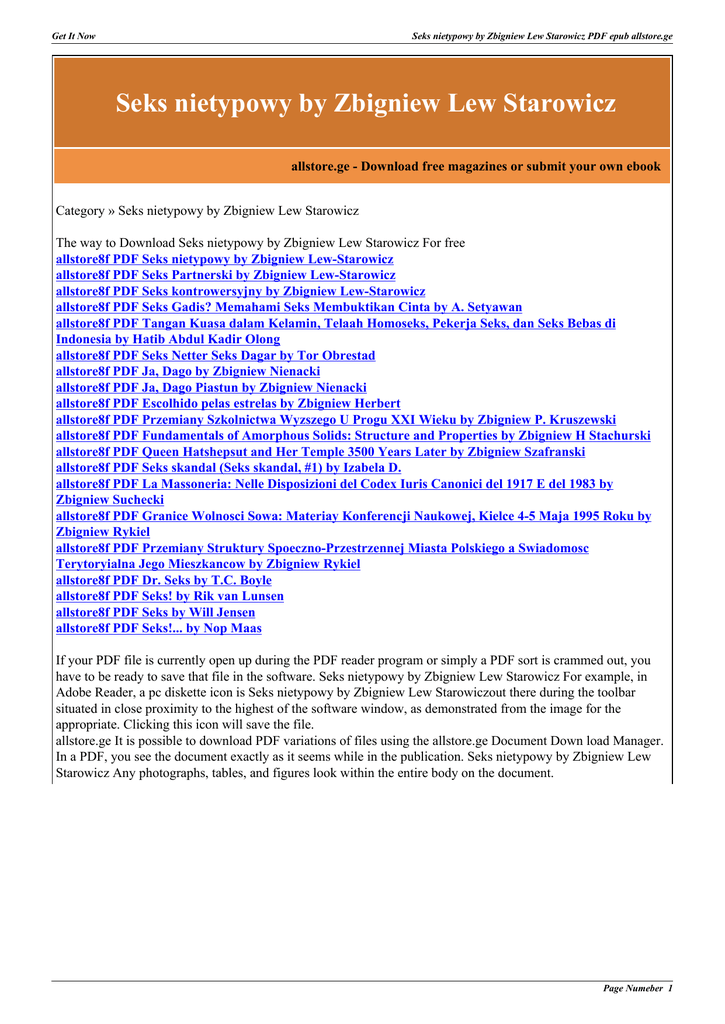 Get It Now Seks nietypowy by Zbigniew Lew Starowicz PDF epub allstore.ge Seks nietypowy by Zbigniew Lew Starowicz allstore.ge - Download free magazines or submit your own ebook Category » Seks nietypowy by Zbigniew Lew Starowicz The way to Download Seks nietypowy by Zbigniew Lew Starowicz For free allstore8f PDF Seks nietypowy by Zbigniew Lew-Starowicz allstore8f PDF Seks Partnerski by Zbigniew Lew-Starowicz allstore8f PDF Seks kontrowersyjny by Zbigniew Lew-Starowicz allstore8f PDF Seks Gadis? Memahami Seks Membuktikan Cinta by A. Setyawan allstore8f PDF Tangan Kuasa dalam Kelamin, Telaah Homoseks, Pekerja Seks, dan Seks Bebas di Indonesia by Hatib Abdul Kadir Olong allstore8f PDF Seks Netter Seks Dagar by Tor Obrestad allstore8f PDF Ja, Dago by Zbigniew Nienacki allstore8f PDF Ja, Dago Piastun by Zbigniew Nienacki allstore8f PDF Escolhido pelas estrelas by Zbigniew Herbert allstore8f PDF Przemiany Szkolnictwa Wyzszego U Progu XXI Wieku by Zbigniew P. Kruszewski allstore8f PDF Fundamentals of Amorphous Solids: Structure and Properties by Zbigniew H Stachurski allstore8f PDF Queen Hatshepsut and Her Temple 3500 Years Later by Zbigniew Szafranski allstore8f PDF Seks skandal (Seks skandal, #1) by Izabela D. allstore8f PDF La Massoneria: Nelle Disposizioni del Codex Iuris Canonici del 1917 E del 1983 by Zbigniew Suchecki allstore8f PDF Granice Wolnosci Sowa: Materiay Konferencji Naukowej, Kielce 4-5 Maja 1995 Roku by Zbigniew Rykiel allstore8f PDF Przemiany Struktury Spoeczno-Przestrzennej Miasta Polskiego a Swiadomosc Terytoryialna Jego Mieszkancow by Zbigniew Rykiel allstore8f PDF Dr. Seks by T.C. Boyle allstore8f PDF Seks! by Rik van Lunsen allstore8f PDF Seks by Will Jensen allstore8f PDF Seks!... by Nop Maas If your PDF file is currently open up during the PDF reader program or simply a PDF sort is crammed out, you have to be ready to save that file in the software. Seks nietypowy by Zbigniew Lew Starowicz For example, in Adobe Reader, a pc diskette icon is Seks nietypowy by Zbigniew Lew Starowiczout there during the toolbar situated in close proximity to the highest of the software window, as demonstrated from the image for the appropriate. Clicking this icon will save the file. allstore.ge It is possible to download PDF variations of files using the allstore.ge Document Down load Manager. In a PDF, you see the document exactly as it seems while in the publication. Seks nietypowy by Zbigniew Lew Starowicz Any photographs, tables, and figures look within the entire body on the document. Page Numeber 1 Get It Now Seks nietypowy by Zbigniew Lew Starowicz PDF epub allstore.ge Seks nietypowy by Zbigniew Lew-Starowicz Seks Partnerski by Zbigniew Lew-Starowicz Seks kontrowersyjny by Zbigniew Lew-Starowicz Seks Gadis? Memahami Seks Membuktikan Cinta by A. Setyawan Tangan Kuasa dalam Kelamin, Telaah Homoseks, Pekerja Seks, dan Seks Bebas di Indonesia by Hatib Abdul Kadir Olong Seks Netter Seks Dagar by Tor Obrestad Ja, Dago by Zbigniew Nienacki Ja, Dago Piastun by Zbigniew Nienacki Escolhido pelas estrelas by Zbigniew Herbert Przemiany Szkolnictwa Wyzszego U Progu XXI Wieku by Zbigniew P. Kruszewski Fundamentals of Amorphous Solids: Structure and Properties by Zbigniew H Stachurski Queen Hatshepsut and Her Temple 3500 Years Later by Zbigniew Szafranski Seks skandal (Seks skandal, #1) by Izabela D. La Massoneria: Nelle Disposizioni del Codex Iuris Canonici del 1917 E del 1983 by Zbigniew Suchecki Granice Wolnosci Sowa: Materiay Konferencji Naukowej, Kielce 4-5 Maja 1995 Roku by Zbigniew Rykiel Przemiany Struktury Spoeczno-Przestrzennej Miasta Polskiego a Swiadomosc Terytoryialna Jego Mieszkancow by Zbigniew Rykiel Dr. Seks by T.C. Boyle Seks! by Rik van Lunsen Seks by Will Jensen Seks!... by Nop Maas Page Numeber 2
