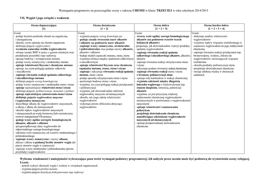 Wymagania programowe na poszczególne oceny z zakresu CHEMII w klasie TRZECIEJ w roku szkolnym 2014/2015 VII. Węgiel i jego związki z wodorem Ocena dopuszczająca [1] Uczeń: – podaje kryteria podziału chemii na organiczną i nieorganiczną – określa, czym zajmuje się chemia organiczna – definiuje pojęcie węglowodory – wymienia naturalne źródła węglowodorów – stosuje zasady BHP w pracy z gazem ziemnym oraz produktami przeróbki ropy naftowej – opisuje budowę i występowanie metanu – podaje wzory sumaryczny i strukturalny metanu – opisuje właściwości fizyczne i chemiczne metanu – opisuje, na czym polegają spalanie całkowite i niecałkowite – zapisuje równania reakcji spalania całkowitego i niecałkowitego metanu – definiuje pojęcie szereg homologiczny – podaje wzory sumaryczne i strukturalne etenu i etynu – opisuje najważniejsze właściwości etenu i etynu – definiuje pojęcia: polimeryzacja, monomer i polimer – opisuje najważniejsze zastosowania etenu i etynu – definiuje pojęcia węglowodory nasycone i węglowodory nienasycone – klasyfikuje alkany do węglowodorów nasyconych, a alkeny i alkiny do nienasyconych – określa wpływ węglowodorów nasyconych i nienasyconych na wodę bromową (lub rozcieńczony roztwór manganianu(VII) potasu) – podaje wzory ogólne szeregów homologicznych alkanów, alkenów i alkinów – przyporządkowuje dany węglowodór do odpowiedniego szeregu homologicznego – odróżnia wzór sumaryczny od wzorów strukturalnego i półstrukturalnego – zapisuje wzory sumaryczne i nazwy alkanu, alkenu i alkinu o podanej liczbie atomów węgla (do pięciu atomów węgla w cząsteczce) – zapisuje wzory strukturalne i półstrukturalne (proste przykłady) węglowodorów Ocena dostateczna [1 + 2] Uczeń: – wyjaśnia pojęcie szereg homologiczny – podaje zasady tworzenia nazw alkenów i alkinów na podstawie nazw alkanów – zapisuje wzory sumaryczne, strukturalne i półstrukturalne oraz podaje nazwy alkanów, alkenów i alkinów – buduje model cząsteczki metanu, etenu, etynu – wyjaśnia różnicę między spalaniem całkowitym a niecałkowitym – opisuje właściwości fizyczne oraz chemiczne (spalanie) metanu, etanu, etenu i etynu – zapisuje i odczytuje równania reakcji spalania metanu, etenu i etynu – podaje sposoby otrzymywania etenu i etynu – porównuje budowę etenu i etynu – wyjaśnia, na czym polegają reakcje przyłączania i polimeryzacji – wyjaśnia, jak doświadczalnie odróżnić węglowodory nasycone od nienasyconych – określa, od czego zależą właściwości węglowodorów – wykonuje proste obliczenia dotyczące węglowodorów Ocena dobra [1 + 2 + 3] Uczeń: – tworzy wzór ogólny szeregu homologicznego alkanów (na podstawie wzorów trzech kolejnych alkanów) –proponuje, jak doświadczalnie wykryć produkty spalania węglowodorów – zapisuje równania reakcji spalania całkowitego i niecałkowitego alkanów, alkenów, alkinów – zapisuje równania reakcji otrzymywania etenu i etynu – odczytuje podane równania reakcji chemicznej – zapisuje równania reakcji etenu i etynu z bromem, polimeryzacji etenu – opisuje rolę katalizatora w reakcji chemicznej – wyjaśnia zależność między długością łańcucha węglowego a właściwościami (np. stanem skupienia, lotnością, palnością) alkanów – wyjaśnia, co jest przyczyną większej reaktywności chemicznej węglowodorów nienasyconych w porównaniu z węglowodorami nasyconymi – opisuje właściwości i zastosowania polietylenu – projektuje doświadczenie chemiczne umożliwiające odróżnienie węglowodorów nasyconych od nienasyconych – opisuje przeprowadzane doświadczenia chemiczne Ocena bardzo dobra [1 + 2 + 3 + 4] Uczeń: – dokonuje analizy właściwości węglowodorów – wyjaśnia wpływ wiązania wielokrotnego w cząsteczce węglowodoru na jego reaktywność chemiczną – zapisuje równania reakcji przyłączania (np. bromowodoru, wodoru, chloru) do węglowodorów zawierających wiązanie wielokrotne – określa produkty polimeryzacji etynu – projektuje doświadczenia chemiczne – stosuje zdobytą wiedzę w złożonych zadaniach Wybrane wiadomości i umiejętności wykraczające poza treści wymagań podstawy programowej; ich nabycie przez ucznia może być podstawą do wystawienia oceny celującej. Uczeń: – potrafi wykryć obecność węgla i wodoru w związkach organicznych – wyjaśnia pojęcie piroliza metanu – wyjaśnia pojęcie destylacja frakcjonowana ropy naftowej – wymienia produkty destylacji frakcjonowanej ropy naftowej – określa właściwości i zastosowania produktów destylacji frakcjonowanej ropy naftowej – omawia jakie skutki dla środowiska przyrodniczego, ma wydobywanie i wykorzystywanie ropy naftowej – wyjaśnia pojęcia: izomeria, izomery – wyjaśnia pojęcie kraking – zapisuje równanie reakcji podstawienia (substytucji) – charakteryzuje tworzywa sztuczne – podaje właściwości i zastosowania wybranych tworzyw sztucznych – wymienia przykładowe oznaczenia opakowań wykonanych z polietylenu VIII. Pochodne węglowodorów Ocena dopuszczająca [1] Uczeń: – dowodzi, że alkohole, kwasy karboksylowe, estry, aminy, aminokwasy są pochodnymi węglowodorów – opisuje budowę pochodnych węglowodorów (grupa węglowodorowa + grupa funkcyjna) – wymienia pierwiastki chemiczne wchodzące w skład pochodnych węglowodorów – klasyfikuje daną substancję organiczną do odpowiedniej grupy związków chemicznych – określa, co to jest grupa funkcyjna – zaznacza grupy funkcyjne w alkoholach, kwasach karboksylowych, estrach, aminach i aminokwasach i podaje ich nazwy – zapisuje wzory ogólne alkoholi, kwasów karboksylowych i estrów – zapisuje wzory sumaryczne i strukturalne prostych alkoholi monohydroksylowych i kwasów karboksylowych (do 2 atomów węgla w cząsteczce) oraz tworzy ich nazwy – zaznacza we wzorze kwasu karb