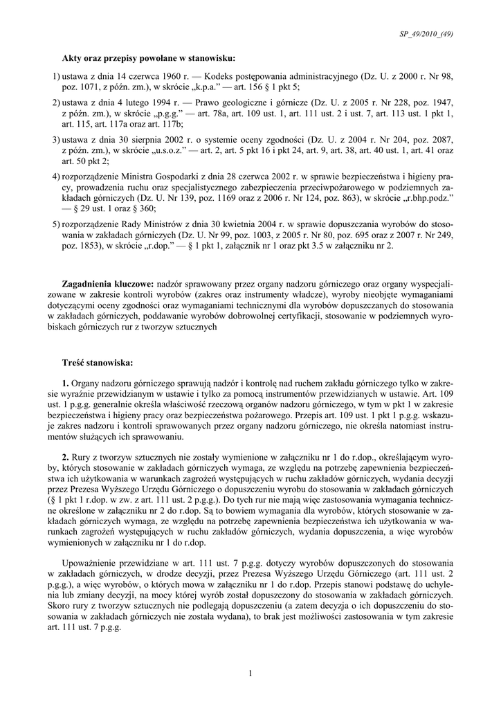 SP_49/2010_(49) Akty oraz przepisy powołane w stanowisku: 1) ustawa z dnia 14 czerwca 1960 r. — Kodeks postępowania administracyjnego (Dz. U. z 2000 r. Nr 98, poz. 1071, z późn. zm.), w skrócie „k.p.a.” –– art. 156 § 1 pkt 5; 2) ustawa z dnia 4 lutego 1994 r. — Prawo geologiczne i górnicze (Dz. U. z 2005 r. Nr 228, poz. 1947, z późn. zm.), w skrócie „p.g.g.” — art. 78a, art. 109 ust. 1, art. 111 ust. 2 i ust. 7, art. 113 ust. 1 pkt 1, art. 115, art. 117a oraz art. 117b; 3) ustawa z dnia 30 sierpnia 2002 r. o systemie oceny zgodności (Dz. U. z 2004 r. Nr 204, poz. 2087, z późn. zm.), w skrócie „u.s.o.z.” — art. 2, art. 5 pkt 16 i pkt 24, art. 9, art. 38, art. 40 ust. 1, art. 41 oraz art. 50 pkt 2; 4) rozporządzenie Ministra Gospodarki z dnia 28 czerwca 2002 r. w sprawie bezpieczeństwa i higieny pracy, prowadzenia ruchu oraz specjalistycznego zabezpieczenia przeciwpożarowego w podziemnych zakładach górniczych (Dz. U. Nr 139, poz. 1169 oraz z 2006 r. Nr 124, poz. 863), w skrócie „r.bhp.podz.” –– § 29 ust. 1 oraz § 360; 5) rozporządzenie Rady Ministrów z dnia 30 kwietnia 2004 r. w sprawie dopuszczania wyrobów do stosowania w zakładach górniczych (Dz. U. Nr 99, poz. 1003, z 2005 r. Nr 80, poz. 695 oraz z 2007 r. Nr 249, poz. 1853), w skrócie „r.dop.” — § 1 pkt 1, załącznik nr 1 oraz pkt 3.5 w załączniku nr 2. Zagadnienia kluczowe: nadzór sprawowany przez organy nadzoru górniczego oraz organy wyspecjalizowane w zakresie kontroli wyrobów (zakres oraz instrumenty władcze), wyroby nieobjęte wymaganiami dotyczącymi oceny zgodności oraz wymaganiami technicznymi dla wyrobów dopuszczanych do stosowania w zakładach górniczych, poddawanie wyrobów dobrowolnej certyfikacji, stosowanie w podziemnych wyrobiskach górniczych rur z tworzyw sztucznych Treść stanowiska: 1. Organy nadzoru górniczego sprawują nadzór i kontrolę nad ruchem zakładu górniczego tylko w zakresie wyraźnie przewidzianym w ustawie i tylko za pomocą instrumentów przewidzianych w ustawie. Art. 109 ust. 1 p.g.g. generalnie określa właściwość rzeczową organów nadzoru górniczego, w tym w pkt 1 w zakresie bezpieczeństwa i higieny pracy oraz bezpieczeństwa pożarowego. Przepis art. 109 ust. 1 pkt 1 p.g.g. wskazuje zakres nadzoru i kontroli sprawowanych przez organy nadzoru górniczego, nie określa natomiast instrumentów służących ich sprawowaniu. 2. Rury z tworzyw sztucznych nie zostały wymienione w załączniku nr 1 do r.dop., określającym wyroby, których stosowanie w zakładach górniczych wymaga, ze względu na potrzebę zapewnienia bezpieczeństwa ich użytkowania w warunkach zagrożeń występujących w ruchu zakładów górniczych, wydania decyzji przez Prezesa Wyższego Urzędu Górniczego o dopuszczeniu wyrobu do stosowania w zakładach górniczych (§ 1 pkt 1 r.dop. w zw. z art. 111 ust. 2 p.g.g.). Do tych rur nie mają więc zastosowania wymagania techniczne określone w załączniku nr 2 do r.dop. Są to bowiem wymagania dla wyrobów, których stosowanie w zakładach górniczych wymaga, ze względu na potrzebę zapewnienia bezpieczeństwa ich użytkowania w warunkach zagrożeń występujących w ruchu zakładów górniczych, wydania dopuszczenia, a więc wyrobów wymienionych w załączniku nr 1 do r.dop. Upoważnienie przewidziane w art. 111 ust. 7 p.g.g. dotyczy wyrobów dopuszczonych do stosowania w zakładach górniczych, w drodze decyzji, przez Prezesa Wyższego Urzędu Górniczego (art. 111 ust. 2 p.g.g.), a więc wyrobów, o których mowa w załączniku nr 1 do r.dop. Przepis stanowi podstawę do uchylenia lub zmiany decyzji, na mocy której wyrób został dopuszczony do stosowania w zakładach górniczych. Skoro rury z tworzyw sztucznych nie podlegają dopuszczeniu (a zatem decyzja o ich dopuszczeniu do stosowania w zakładach górniczych nie została wydana), to brak jest możliwości zastosowania w tym zakresie art. 111 ust. 7 p.g.g. 1 SP_49/2010_(49) 3. Zgodnie z § 29 ust. 1 r.bhp.podz., w zakładzie górniczym stosuje się maszyny, urządzenia, materiały, wyroby z tworzyw sztucznych oraz środki strzałowe i sprzęt strzałowy, które spełniają wymagania określone w rozporządzeniu oraz w odrębnych przepisach, a także zostały oznaczone znakiem zgodności CE lub odpowiednim znakiem dopuszczenia lub zostały odpowiednio dobrane do warunków górniczo-geologicznych i środowiskowych w miejscu ich zastosowania. Przepis § 360 r.bhp.podz. określa m.in. wymagania trudnopalności, antyelektrostatyczności i nietoksyczności, które powinny spełniać wyroby z tworzyw sztucznych stosowane w podziemnych wyrobiskach górniczych. Przepis nie precyzuje „warunków”, jakie muszą być spełnione, aby uznać, iż wyrób z tworzywa sztucznego spełnia wymagania trudnopalności. „Warunków” tych, w przypadku rur z tworzyw sztucznych stosowanych w zakładach górniczych, nie określają również inne powszechnie obowiązujące akty prawne, w odróżnieniu np. od taśm przenośnikowych (pkt 3.5 i nast. w załączniku nr 2 do r.dop.). Naruszenie § 360 r.bhp.podz. zachodziłoby w przypadku ustalenia, iż w wyrobisku górniczym zastosowano wyrób z tworzywa sztucznego, który nie spełnia wymagań trudnopalności, antyelektrostatyczności i nietoksyczności. 4. W literaturze podkreśla się, iż „brzmienie art. 113 ust. 1 pkt 1 pr.g.g. może skłaniać do wniosku, że każde naruszenie przepisów o ruchu zakładu górniczego, pociągające za sobą powstanie "nieprawidłowości", zobowiązuje organ nadzoru górniczego do wydania decyzji nakazującej usunięcie tych nieprawidłowości. Okoliczność bowiem, że naruszenia te stwarzają zagrożenie dla bezpieczeństwa zakładu górniczego, jego pracowników bądź też bezpieczeństwa powszechnego lub środowiska, sama przez się nie ma w tym przypadku decydującego znaczenia. Wydaje się jednak, że regułę wyrażoną w art. 113 ust. 1 pkt 1 pr.g.g. należy inter