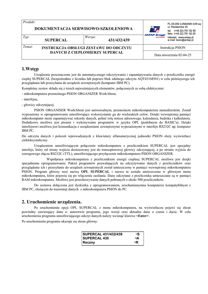 Produkt: DOKUMENTACJA SERWISOWO-SZKOLENIOWA Typ: Temat: SUPERCAL Wersja: 431/432/439 Instrukcja PSION INSTRUKCJA OBSŁUGI ZESTAWU DO ODCZYTU DANYCH Z CIEPŁOMIERZY SUPERCAL Data utworzenia 02-04-25 1.Wstęp Urządzenie przeznaczone jest do automatycznego odczytywania i zapamiętywania danych z przelicznika energii cieplej SUPERCAL (bezpośrednio z licznika lub poprzez blok zdalnego odczytu AQT431M501) w celu późniejszego ich przeglądania lub przesyłania do urządzeń zewnętrznych (komputer IBM PC). Kompletny zestaw składa się z trzech najważniejszych elementów, połączonych ze sobą elektrycznie: - mikrokomputera przenośnego PSION ORGANIZER WorkAbout, - interfejsu, - głowicy odczytującej. PSION ORGANISER WorkAbout jest uniwersalnym, przenośnym mikrokomputerem menedżerskim. Został wyposażony w oprogramowanie umożliwiające wykorzystanie go do wielorakich celów. Dzięki wewnętrznej pamięci mikrokomputer może zapamiętywać rekordy danych, pełnić rolę notesu adresowego, kalendarza, budzika i kalkulatora. Dodatkowo możliwe jest pisanie i wykonywanie programów w języku OPL (podobnym do BASIC'a). Dzięki interfejsowi możliwa jest komunikacja z urządzeniami zewnętrznymi wyposażonymi w interfejs RS232C np. komputer IBM PC. Do odczytu danych i poleceń wprowadzanych z klawiatury alfanumerycznej jednostki PSION służy wyświetlacz ciekłokrystaliczny. Urządzeniem umożliwiającym połączenie mikrokomputera z przelicznikiem SUPERCAL jest specjalny interfejs, który od strony wejścia dostosowany jest do transoptorowej głowicy odczytującej, a po stronie wyjścia do szeregowego złącza RS232C (TTL), umożliwiającego przyłączenie mikrokomputera PSION ORGANIZER. Współpraca mikrokomputera z przelicznikiem energii cieplnej SUPERCAL możliwa jest dzięki specjalnemu oprogramowaniu. Pakiet programów pozwalających na odczytywanie danych z przeliczników oraz przeglądanie ich i przesyłanie do urządzeń zewnętrznych został umieszczony w pamięci wewnętrznej mikrokomputera PSION. Program główny nosi nazwę OPL SUPERCAL i nazwa ta została umieszczona w głównym menu mikrokomputera, które pojawia się po włączeniu zasilania. Dane odczytane z przelicznika umieszczane są w pamięci RAM mikrokomputera. Możliwe jest przechowywanie danych pobranych z około 500 przeliczników. Do zestawu dołączona jest dyskietka z oprogramowaniem, uruchamianymna komputerze kompatybilnym z IBM PC, służącym do transmisji danych z mikrokomputera PSION do PC. 2. Uruchomienie urządzenia. Po uruchomieniu opcji OPL SUPERCAL z menu mikrokomputera, na wyświetlaczu pojawi się ekran powitalny zawierający dane o: autorstwie programu, jego wersji oraz aktualne dane o czasie i dacie. W celu uruchomienia programu umożliwiającego odczyt danych należy wcisnąć klawisz <Enter>. Po uruchomieniu programu ukazuje się ekran główny: SUPERCAL 431/432/439 SUPERCAL 430 Reczny ∪ S A ∪ R ∪ ODCZYT DANE TRANSMISJA dostępne są 3 rodzaje pracy: ODCZYT, DANE, i TRANSMISJA ODCZYT to rodzaj pracy służący do odczytu danych z ciepłomierzy w reżimie automatycznym, z dodatkowym rozróżnieniem modelu ciepłomierza SUPERCAL, lub ręcznie poprzez przepisanie wartości z wyświetlacza dowolnego ciepłomierza. DANE to rodzaj pracy umożliwiający przeglądanie danych zapisanych w pamięci zestawu inkasenckiego oraz kasowanie z niego danych (po przegraniu ich na komputer główny). TRANSMISJA to rodzaj pracy umożliwiający transmisję danych z zestawu inkasenckiego do komputera. Tu znajduje się również polecenie kończące pracę programu. W celu wyboru właściwego rodzaju pracy należy posłużyć się żółtymi przyciskami klawiatury opisanymi symbolem strzałek. Opcje rodzaju pracy DANE oraz TRANSMISJA dostępne będą dopiero wtedy, gdy w pamięci mikrokomputera będą znajdowały się dane, odczytane wcześniej z przeliczników. Wciśnięcie klawisza <OnEsc> spowoduje powrót do menu powitalnego. 3. Odczyt danych z ciepłomierza. Po wybraniu rodzaju pracy ODCZYT mamy dostępne 2 opcje wyboru modelu przelicznika SUPERCAL do odczytu automatycznego oraz opcję odczytu ręcznego: ∪ SUPERCAL 431/432/439 SUPERCAL 430 Ręczny S A ∪ R ∪ W celu wyboru właściwej opcji należy posłużyć się klawiszami strzałek i podświetlaną opcję uruchomić naciskając <Enter> lub ciskając kombinację klawiszy <∪> i odpowiedniej litery. Wciśnięcie klawisza <On/Esc> spowoduje powrót do poprzedniego menu. 3.1. Automatyczny odczyt danych z przelicznika. Opcja umożliwia automatyczne odczytywanie danych z ciepłomierzy SUPERCAL wyposażonych w możliwość przekazywania danych przez złącze opto. W celu dokonania odczytu należy wybrać strzałkami opcję SUPERCAL 431/432/439 lub SUPERCAL 430, a następnie nacisnąć klawisz <Enter> lub nacisnąć kombinacje klawiszy odpowiednią do modelu ciepłomierza <∪S> lub <∪A> Na wyświetlaczu pojawi się ekran: SUPERCAL 431/432/439 Ciepłomierz Nr xxx gotowy (T/N) ? Nie N Tak T Nr xxx to kolejny numer zapisywanego ciepłomierza. Dla modelu SUPERCAL 430 pierwsza linia tekstu przyjmie postać SUPERCAL 430 Przygotowanie ciepłomierz do odczytu polega na nałożeniu głowicy odczytującej na przelicznik, zwracając uwagę, aby bolce ustalające trafiły w odpowiednie otwory, a zatrzask głowicy zaskoczył za zaczep oraz obudzenie ciepłomierza przez wciśnięcie jego pomarańczowego przycisku – powinien zaświecić się wyświetlacz. Po wykonaniu tych czynności można na klawiaturze PSIONA nacisnąć klawisz <T>. (Wciśnięcie klawisza <N> spowoduje powrót do poprzedniego menu). Następuje odczyt automatyczny przelicznika. Pojawia się ekran zawierający napis Trwa odczyt proszę czekać ... oraz pasek opisujący postęp odczytu. Po pomyślnym odczycie danych ukazuje się ekran z prośbą o wpisanie stanu wodomierza: Wodomierz Stan wodom. [m3] : | Należy tu wpisać wartość objętości odczytanej z liczydła przetwornika przepływu, która 