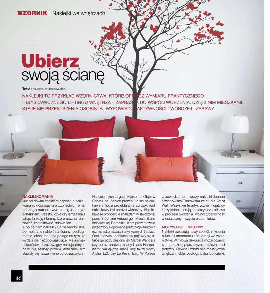 WZORNIK I Naklejki we wnętrzach Ubierz swoją ścianę Tekst I Katarzyna Andrzejczyk-Briks NAKLEJKI TO PRZYKŁAD WZORNICTWA, KTÓRE OPRÓCZ WYMIARU PRAKTYCZNEGO – BŁYSKAWICZNEGO LIFTINGU WNĘTRZA – ZAPRASZA DO WSPÓŁTWORZENIA. DZIĘKI NIM MIESZKANIE STAJE SIĘ PRZESTRZENIĄ OSOBISTEJ WYPOWIEDZI, AKTYWNOŚCI TWÓRCZEJ I ZABAWY. NAKLEJKOMANIA Już od dawna chciałam napisać o naklejkomanii, która ogarnęła wzornictwo. Temat naszego numeru wydaje się idealnym pretekstem. Krzesło, łóżko czy lampa mają jakąś funkcję i formę, które można realizować, kontestować, odświeżać. A po co nam naklejki? Są wszędobylskie, bo można je nakleić na ściany, podłogi, meble, okna. Ich urok polega na tym, że wydają się niezobowiązujące. Mają smak dzieciństwa, czasów, gdy naklejaliśmy je na biurka, zeszyty, piórniki, które dzięki nim stawały się nasze – inne od pozostałych. 44 Na jesiennych targach Maison et Objet w Paryżu, na których prezentują się najciekawsi młodzi projektanci z Europy, nurt naklejkowy był bardzo widoczny. Najciekawsze propozycje znalazłam w stworzonej przez Stéphane Arriubergé i Massimiliano Iorio kolekcji Domestic, która prezentowała przedmioty sygnowane przez projektantów z różnych stron świata i artystycznych tradycji. Obok nazwisk debiutantów pojawiły się tu takie gwiazdy designu jak Marcel Wanders czy coraz bardziej znany Klaus Haapaniemi. Naklejkowej manii ulegli także twórcy Atelier LZC czy Le Pre d`Eau. W Polsce z powodzeniem tworzy naklejki Joanna Szachowska-Tarkowska ze studia Art of Wall. Wszystkie te artystyczne inicjatywy łączy jedno: oferują odbiorcy uczestnictwo w procesie tworzenia i wolność/dowolność w ostatecznym użyciu przedmiotów. MOTYWACJE I MOTYWY Naklejki pokazują nowy sposób myślenia o funkcji ornamentu i dekoracji we wzornictwie. Winylowa dekoracja może pojawić się na każdej płaszczyźnie, zależnie od potrzeb. Ożywia i zdobi minimalistyczne wnętrza, meble, podłogi, lustra lub kafelki, Naklejki we wnętrzach I WZORNIK 2 3 4 5 1,2,5) Autorka naklejek: Joanna Szachowska-Tarkowska, fot. materiały prasowe www.artofwall.com.pl, 3,4 )Frog and the moon oraz Deer, Klaus Haapaniemi, fot. materiały prasowe www.domestic.fr ale nie jest z nimi trwale związana. Znika, gdy się zużyje, opatrzy, znudzi. Efemeryczna ozdoba stworzy nastrój wnętrza, ale nie musi zadomawiać się na dłużej niż jeden sezon. Spojrzenie na kalejdoskop propozycji, jaki oferują naklejkomaniacy, jest niezwykle inspirujące. Oderwane od swoich historycznych kontekstów motywy stare i zupełnie nowoczesne, orientalne, roślinne i animalistyczne mieszają się z postaciami z filmów i kreskówek czy ikonkami komputerowymi. Stickersi uwielbiają zabawę. Proponują naklejone na ściany wieszaki na ubrania lub klucze, na których nic nie można powiesić czy meble, na których nie da się usiąść. Możemy dokleić naszym meblom cienie lub dodać ścianom dodatkowe drzwi, jeśli akurat mamy potrzebę ich posiadania. Dla wiecznie nieobecnych w domu niewiędnące kwiaty w doniczkach i domowe zwierzaki posłusznie czekające na nasz powrót. Dla kidultów cała menażeria dziecięcych stworków i dziwaczków. Dla najbardziej wymagających motywy projektowane na zamówienie. Dla poszukujących czegoś więcej naścienna poezja w postaci ulubionych fragmentów, cytatów lub małych form poetyckich połączonych z plastycznym komentarzem. Wielu artystów dotychczas realizujących się w ilustracji czy grafice wypowiada się w większej skali. Oddają w ręce użytkowników postaci i wątki ze swoich dzieł, obdarowując je wolnością, jakiej nie mają ograniczone kartką papieru czy ramą obrazu. Naklejki to jeszcze jedno z mediów wypowiedzi. Joanna Szachowska-Tarkowska, która od kilku lat ubiera ściany w stworzonym przez siebie studiu Art of Wall, mówi: Idea naklejek jest mi bliska z racji moich graficzno-ilustratorskich i wnętrzarskich pasji, spaja ona wszystkie moje umiejętności. Daje możliwość kreacji nie na papierze, nie na płótnie, ale na ścianie, suficie, meblu lub szybie okiennej. PROJEKT OTWARTY Sentyment projektantów do naklejek wynika z poszukiwania odpowiedzi na pytanie: jak sprawić, by produkt seryjny miał cechy indywidualne? Donald A. Norman w książce The Design of Everyday Things pisze: Niemożliwe jest, aby masowo produkowane obiekty spełniały indywidualne oczekiwania każdego użytkownika. Designerom nie wystarcza więc tworzenie gotowych przedmiotów. Szukają sposobów na znalezienie projektów elastycznych, dopasowujących się do upodobań i potrzeb klientów. Ważne jest otwarcie na komentarz i działanie odbiorców. Naklejka to przykład takiego wzornictwa, które zaprasza odbiorcę do zabawy, współtworzenia i aktywności. Z gotowych naklejkowych zestawów możemy tworzyć własne opowieści i kompozycje. Mieszkanie staje się przestrzenią osobistej wypowiedzi, twórczej ekspresji, kreatywności. Naklejka zmusza nas wręcz do wzięcia sprawy w swoje ręce. Musimy przełamać wewnętrzny opór, który mówi nam, że nie umiemy rysować, malować, tworzyć. Naklejka nas ośmiela, stajemy na chwilę w sytuacji projektanta: wybierając motywy, miejsce, kolor, podejmujemy twórcze decyzje. Naklejkowe kompozycje pokazują, że umiemy się bawić przestrzenią i tworzyć ściany na miarę naszych marzeń. DLA POSZUKIWACZY: • • • • • • grupa Le Pre d`Eau, www.le-pre-deau.com Domestic, www.domestic.fr Atelier LZC, www.atelierlzc.fr Joanna Szachowska-Tarkowską – Art of Wall, www.artofwall.com Joanna Szachowska-Tarkowska – ilustracje, www.joannaszachowska.com targi Maison et Objet, www.maison-objet.com KATARZYNA ANDRZEJCZYK-BRIKS – historyk sztuki; pasjonuje się fotografią. Lubi stare paryskie zdjęcia Eugene Adgeta, a także Julię Margaret Cameron oraz Brassai’a. Jest mamą dwójki dzieci, dzięki którym stała się pasjonatką psychologii – w szczególnoś