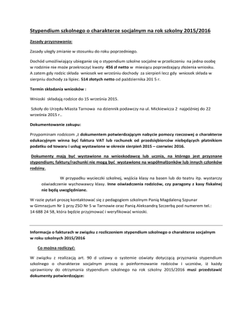 Stypendium szkolnego o charakterze socjalnym na rok szkolny 2015/2016 Zasady przyznawania: Zasady uległy zmianie w stosunku do roku poprzedniego. Dochód umożliwiający ubieganie się o stypendium szkolne socjalne w przeliczeniu na jedna osobę w rodzinie nie może przekroczyć kwoty 456 zł netto w miesiącu poprzedzający złożenia wniosku. A zatem gdy rodzic składa wniosek we wrześniu dochody za sierpień lecz gdy wniosek składa w sierpniu dochody za lipiec. 514 złotych netto od października 201 5 r. Termin składania wniosków : Wnioski składają rodzice do 15 września 2015. Szkoły do Urzędu Miasta Tarnowa na dziennik podawczy na ul. Mickiewicza 2 najpóźniej do 22 września 2015 r.. Dokumentowanie zakupu: Przypominam rodzicom ,ż dokumentem potwierdzającym nabycie pomocy rzeczowej o charakterze edukacyjnym winna być faktura VAT lub rachunek od przedsiębiorców niebędących płatnikiem podatku od towaru i usług wystawione w okresie sierpień 2015 – czerwiec 2016. Dokumenty mają być wystawione na wnioskodawcę lub ucznia, na którego jest przyznane stypendium; faktury/rachunki nie mogą być wystawione na współmałżonków lub innych członków rodziny. W przypadku wycieczki szkolnej, wyjścia klasy na basen lub do teatru itp. wystarczy oświadczenie wychowawcy klasy. Inne oświadczenia rodziców, czy paragony z kasy fiskalnej nie będą uwzględniane. W razie pytań proszę kontaktować się z pedagogiem szkolnym Panią Magdaleną Szpunar w Gimnazjum Nr 1 przy ZSO Nr 5 w Tarnowie oraz Panią Aleksandrą Szczerbą pod numerem tel.: 14 688 24 58, która będzie przyjmować i weryfikować wnioski. Informacja o fakturach w związku z rozliczeniem stypendium szkolnego o charakterze socjalnym w roku szkolnych 2015/2016 Co można rozliczyć: W związku z realizacją art. 90 d ustawy o systemie oświaty dotyczącą przyznania stypendium szkolnego o charakterze socjalnym proszę o poinformowanie rodziców i uczniów, iż każdy uprawniony do otrzymania stypendium szkolnego na rok szkolny 2015/2016 musi przedstawić dokumenty potwierdzające: zakup podręczników (z wyłączeniem podręczników, które były refundowane w ramach wyprawki szkolnej) , lektur szkolnych, encyklopedii, słowników, atlasów; zakup przyborów, zeszytów i pomocy szkolnych,( np. tornister, plecak); zakup instrumentów muzycznych, mikroskopu, lunety (pod warunkiem uczestnictwa w zajęciach zorganizowanych); zakup odzieży sportowej z przeznaczeniem na zajęcia z wychowania fizycznego (spodenki, dres tzn.: spodnie dresowe i bluza dresowa, podkoszulek, tenisówki bądź buty sportowe); strój związany z rozwojem zdolności ucznia (np. kimono dla ucznia trenującego karate), strój szkolny związany z regulaminem szkoły (mundurek szkolny, mundury w klasach wojskowych, policyjnych itp.); zakup sprzętu sportowego dla uczniów, którzy uczęszczają na dodatkowe zajęcia sportowe, ( np. piłka ręczna , nożna, siatkowa); zakup tuszu, tonera, pendrive’a, programu komputerowego o charakterze edukacyjnym, abonament za Internet za okres wrzesień 2015 czerwiec 2016r.; udziału w zajęciach pozalekcyjnych w szczególności: językowych, wyrównawczych, komputerowych; udziału w zajęciach pozaszkolnych ( np. basen - zajęcia zorganizowane), taniec, rytmika, nauka gry na instrumencie muzycznym, itd. (zajęcia wykraczające poza plan lekcji); udziału w „Zielonej Szkole” – bez kosztów dojazdu i przyjazdu, obozy sportowe dla uczniów klas sportowych; udziału w wycieczce szkolnej; wyjścia do kina, teatru zorganizowane przez szkołę; zakupu biletów przewozowych związanych z dojazdem do szkoły dla uczniów szkół ponadgminazjalnych poza miejsce zamieszkania; zakwaterowania w bursie lub w internacie. Nie można przedstawić dokumentów na: zakup odzieży codziennego użytku, (np. kurtka, spodnie, obuwie zimowe); zakup mebli (tzn. biurko, krzesło, lampka); naprawę komputera; zakup łyżew, sanek, sprzętu narciarskiego, roweru; zakup okularów; zakup lekarstw; zakup komputera, laptopa, tabletu oraz części i naprawę w/w; zakup biletów do kina czy teatru kupowane indywidualnie; obozy, inne niż wyżej wymienione; kolonie; strój komunijny; strój na studniówkę; opłaty za komitet rodziców czy ubezpieczenie. Opr. : PEDAGOG Magdalena Szpunar Tarnów; 12.08.2015 r. W załączniku dostępny wzór wniosku : (pobierz)
