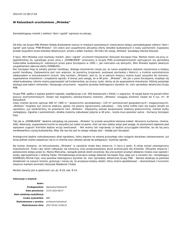 2014-07-15 08:17:04 W Koluszkach uruchomiono „Mrówkę” Samoobsługowy market z sektora "dom i ogród" zaprasza na zakupy. Od kilku lat Grupa PSB (Polskie Składy Budowlane) tworzy w miastach powiatowych nowoczesne sklepy samoobsługowe sektora "dom i ogród" pod nazwą "PSB-Mrówka". Ich celem jest uzupełnienie aktualnej oferty składów budowlanych o nowy asortyment, kupowany przede wszystkim przez klientów detalicznych, prosto z półek marketu. Od kilku dni swoją „Mrówkę” posiadają również Koluszki. 5 lipca Mini Mrówkę czyli markowy market „dom i ogród” uruchomił mieszkaniec Koluszek Szczepan Feja. Market mieści się przy ul. Jagiellońskiej 2a, sąsiadując przez ulicę z „DOMBUDEM” (zrzeszony w Grupie PSB) przedsiębiorstwem zajmującym się sprzedażą materiałów budowlanych, założonym przez pana Szczepana w 1995 r. Jak nietrudno się domyślić, Mini Mrówka będzie idealnym uzupełnieniem obecnej oferty DOMBUDU. Pan Szczepan Feja to solidny partner handlowy, dlatego niezmiernie cieszę się, że nasza współpraca zostanie rozszerzona o kolejny punkt handlowy. Zadowolenie jest tym większe, że jesteśmy krajanami, ponieważ pochodzę z Rokicin, a średnie wykształcenie zdobywałem w koluszkowskim liceum. Siłą marketu „Mrówka” jest to, że w jednym miejscu można kupić wszystko do remontu, wyposażenia mieszkania i urządzenia ogrodu. A biorąc pod uwagę, że w 90 proc. „Mrówek”, tak jak u pana Szczepana, znajduje się skład budowlany, klienta można poprowadzić od fundamentów, po ściany, tynki, dachy aż do wyposażenia mieszkania. Później pozostaje obsługa pod kątem remontów i bieżącego utrzymania - wyjaśnia Jarosław Dobrogoszcz dyrektor ds. sieci sprzedaży detalicznej Grupy PSB. Grupa PSB, spółka o typowo polskim kapitale, współpracuje z ok. 500 dostawcami z Polski i z zagranicy. W swojej bazie ma ponad milion pozycji asortymentowych. Dzięki tak bogatemu zatowarowaniu markety „Mrówka” osiągają wielkość nawet do 5 tys. m². W Koluszkach nowy market łącznie zajmuje 480 m² (360 m ² powierzchni sprzedażowej i 120 m² pomieszczeń gospodarczych i magazynowych). „Mrówka” mogłaby być jeszcze większa, gdyby nie pewne ograniczenia zabudowy. – Gdy tylko trafiło nam się kupno działki po sąsiedzku, już wiedzieliśmy że powstanie tam „Mrówka”. Gdybyśmy jednak dysponowali większą powierzchnią, market byłby rozleglejszy. Zgodnie z parametrami, działkę możemy zabudować jedynie w 40 proc., reszta musi pozostać wolna – tłumaczy Szczepan Feja. Tak jak w „DOMBUDZIE” idealnie odnajdują się panowie, „Mrówka” to przede wszystkim domena kobiet. Akcesoria kuchenne, chemia, AGD, dekoracje, wyposażenie kuchni to wszystko już czeka na panie, choć od razu należy wziąć pod uwagę, że asortyment zapewne pod wpływem sugestii klientów będzie wciąż ewoluował. – Nie wiemy tak naprawdę co będzie przyciągało klientów, bo do tej pory handlowaliśmy czystą budowlanką. Więc dla nas też jest to swego rodzaju test – dodaje pan Szczepan. Analogicznie będzie rozbudowywany dział ogrodowy, który dopiero na wiosnę przyszłego roku osiągnie docelowe zatowarowanie. Już teraz jednak można zaopatrzyć się tu w chemię oraz ciekawy sprzęt do pielęgnacji i wystroju ogrodu. Na koniec dodajmy, że koluszkowska „Mrówka” w zasadzie miała dwa otwarcia. 5 lipca o godz. 8 sklep został udostępniony mieszkańcom. Przez cały dzień odbywały się konkursy oraz przeprowadzano akcje promocyjne dla klientów. Oficjalne otwarcie i poświecenie sklepu przez ks. Marka Mielcarka, nastąpiło jednak dzień wcześniej. Na uroczystość przybyli włodarze miasta oraz sąsiedzi i osoby zaprzyjaźnione z rodziną Fejów. Pamiątkowego przecięcia wstęgi dokonali Szczepan Feja, jego syn a zarazem dyr. zarządzający DOMBUDU Michał Feja, oraz Jarosław Dobrogoszcz dyrektor ds. sieci sprzedaży detalicznej Grupy PSB. – Bardzo dziękuję za państwa działalność na naszym terenie, gratuluję i cieszę się, że przybywa kolejny obiekt, który można opodatkować – skomentował z humorem otwarcie marketu burmistrz Koluszek Waldemar Chałat. Market otwarty jest w godzinach: pn.-pt. 8-18, sob. 8-14. Informacje o artykule Autor: Zredagował(a): Data powstania: Agnieszka Karbownik 15.07.2014 08:17 Data ostatniej modyfikacji: Liczba wyświetleń: 809 Wydrukowano z serwisu: archiwum.koluszki.pl Wydrukowano dnia: 2017-03-02 14:06:23