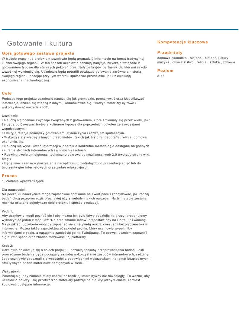 Gotowanie i kultura Kompetencje kluczowe Opis gotowego zestawu projektu Przedmioty W trakcie pracy nad projektem uczniowie będą gromadzić informacje na temat tradycyjnej kuchni swojego regionu. W ten sposób uczniowie poznają tradycje, zwyczaje związane z gotowaniem typowe dla starszych pokoleń oraz tradycje krajów partnerskich, którymi szkoły wcześniej wymieniły się. Uczniowie będą potrafili powiązać gotowanie zarówno z historią swojego regionu, badając przy tym warunki społeczne przeszłości, jak i z ewolucją ekonomiczną i technologiczną. domowa ekonomia , historia , historia kultury , muzyka , obywatelstwo , religia , sztuka , zdrowie Cele Podczas tego projektu uczniowie nauczą się jak gromadzić, porównywać oraz klasyfikować informacje, dzielić się wiedzą z innymi, komunikować się, tworzyć materiały cyfrowe i wykorzystywać narzędzia ICT. Uczniowie • Nauczą się oceniać zwyczaje związanych z gotowaniem, które zmieniały się przez wieki, jako że będą porównywać tradycje kulinarne typowe dla poprzednich pokoleń ze zwyczajami współczesnymi. • Odkryją relacje pomiędzy gotowaniem, stylem życia i rozwojem społecznym. • Wykorzystają wiedzę z innych przedmiotów, takich jak historia, geografia, religia, domowa ekonomia, itp. • Nauczą się wyszukiwać informacji w oparciu o konkretne metodologie dostępne na godnych zaufania stronach internetowych i w innych zasobach. • Rozwiną swoje umiejętności techniczne odkrywając możliwości web 2.0 (tworząc strony wiki, blogi) • Będą mieć szansę wykorzystania narzędzi multimedialnych do prezentacji zdjęć lub do tworzenia gier internetowych oraz zadań edukacyjnych. Proces 1. Zadania wprowadzające Dla nauczycieli: Na początku nauczyciele mogą zaplanować spotkanie na TwinSpace i zdecydować, jaki rodzaj badań chcą przeprowadzić oraz jakiej użyją metody i jakich narzędzi. Na tym etapie zostaną również ustalone pojedyncze cele projektu i sposób ewaluacji. Krok 1: Aby uczniowie mogli poznać się i aby można ich było łatwo podzielić na grupy, proponujemy wykorzystać jeden z modułów “Na przełamanie lodów” przedstawiony na Portalu eTwinning. Na przykład, uczniowie mogliby zapoznać się z netykietą oraz z kwestiami bezpieczeństwa w internecie. Można także zaprojektować szkielet profilu, który uczniowie wypełniliby informacjami o sobie, a następnie zamieścić go na TwinSpace. To pozwoli uczniom zapoznać się z TwinSpace oraz zbadać możliwości tej platformy. Krok 2: Uczniowie dowiadują się o celach projektu i poznają sposoby przeprowadzania badań. Jeśli prowadzone badania będą pociągały za sobą wykorzystanie zasobów internetowych, radzimy, żeby uczniowie zapoznali się wcześniej z odpowiednimi wskazówkami na temat bezpiecznych i efektywnych badań materiałów dostępnych w sieci. Wskazówki: Postaraj się, aby zadania miały charakter bardziej interaktywny niż równoległy. To ważne, aby uczniowie nauczyli się przetwarzać materiały patrząc na nie krytycznym okiem, zamiast kopiować dostępne informacje. Poziom 8-16 2. Utrwalenie Każda szkoła zaczyna od zgromadzenia materiałów pisanych i ustnych. Proponowane tematy to: 1. Różne codzienne posiłki (śniadanie, lunch, obiad, przekąski) oraz zwyczaje żywieniowe 2. Różne święta i obchody • Kolacja wigilijna /Obiad świąteczny • Śniadanie wielkanocne/ Obiad wielkanocny • Specjalne święta narodowe, w tym specjalne potrawy lub obchody • Porównanie różnych kultur 3. Specjalności narodowe • Kuchnia tradycyjna 4. Zmiany w zwyczajach żywieniowych – perspektywa historyczna • Wywiady ze starszymi osobami • Wyszukiwanie informacji 5. Wymienianie się przepisami ulubionych potraw • Wymiana przepisów • Wykorzystywanie przepisów i gotowanie • Robienie zdjęć w trakcie gotowania oraz fotografowanie wyników Zgromadzone informacje można zamieścić na TwinSpace, gdzie szkoły partnerskie będą mogły je zobaczyć i dodać swoje komentarze lub uwagi. Na tym etapie byłoby dobrze, gdyby mieszane grupy uczniów z każdej szkoły mogły krytycznie przyjrzeć się materiałom zaprezentowanym przez obydwie szkoły. W przypadku dużych świąt (Boże Narodzenie, Wielkanoc, karnawał, itp.) zainteresowanie uczniów powinno skupiać się na zwyczajach żywieniowych obowiązujących w ich środowisku. W tym samym czasie starsi uczniowie mogą także zbadać warunki związane z rozwojem diety, rozwojem rolnictwa i hodowli zwierząt, a także mogą przyjrzeć się sytuacji w handlu i przemyśle. Ponadto, uczniowie mogliby także spojrzeć na swój temat z perspektywy rozwoju ekonomicznego oraz zmian, modelu emigracji, przekonań religijnych, etc. Wskazówki Postaraj się, aby uczniowie w swoich badaniach zamieścili także materiały ustne, np. wywiady ze starszymi osobami na temat wspomnień związanych z kuchnią oraz na temat obowiązujących wówczas zwyczajów. Upewnij się, że uczniowie mają prawa autorskie do zdjęć, które wykorzystują. 3. Zakończenie Każda ze szkół może również przeprowadzić wywiad ze sobą nawzajem na temat zwyczajów związanych z jedzeniem, tradycji towarzyszących większym świętom i obchodom, a na koniec zaprezentować swoje spostrzeżenia na temat kultury partnera w postaci podkastów, galerii obrazów, itp., które można następnie zamieścić na TwinSpace. Wywiady te mogłyby także zostać przeprowadzone w czasie rozmowy na czacie lub za pomocą jakiegoś innego komunikatora, np. Skype’a. Ocena 4. Wyniki • W zależności od tego, jak postanowicie przeprowadzić swój projekt, wyniki mogą być takie jak niżej lub zupełnie inne; • Strona internetowa lub magazyn internetowy zawierający przepisy, wywiady, fakty historyczne lub kulturowe oraz aspekty życia codziennego), teksty uczniów, zdjęcia, filmy, lub nagrane pliki dźwiękowe. Uczniowie mogą również stworzyć blogi, strony wiki, gry edukacy