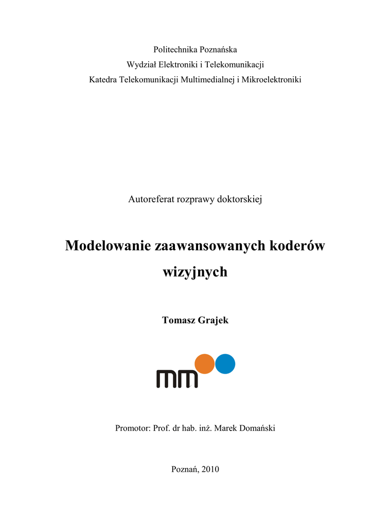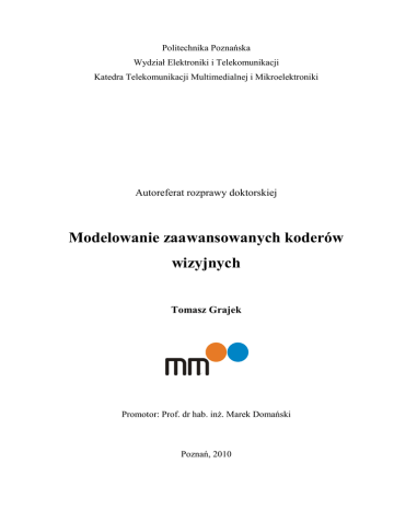 Politechnika Poznańska Wydział Elektroniki i Telekomunikacji Katedra Telekomunikacji Multimedialnej i Mikroelektroniki Autoreferat rozprawy doktorskiej Modelowanie zaawansowanych koderów wizyjnych Tomasz Grajek Promotor: Prof. dr hab. inŜ. Marek Domański Poznań, 2010 Spis treści Spis treści ..................................................................................................... 3 1. Wprowadzenie ......................................................................................... 5 1.1. Modelowanie koderów wizyjnych ......................................................................... 5 1.2. Cele i teza pracy ..................................................................................................... 8 1.3. Przegląd pracy ........................................................................................................ 8 2. Zasadnicze osiągnięcia rozprawy ........................................................ 11 2.1. Wprowadzenie ...................................................................................................... 11 2.2. Metodologia prowadzenia badań.......................................................................... 12 2.3. Oryginalne modele kodera wizyjnego standardu MPEG-4 AVC/H.264 ............. 15 2.3.1. Wprowadzenie ............................................................................................... 15 2.3.2. Modelowanie średniej liczby bitów potrzebnych do reprezentacji skompresowanego obrazu .............................................................................. 17 2.3.3. Modelowanie liczby bitów reprezentacji pojedynczego obrazu .................... 19 2.3.4. Modelowanie łącznej liczby bitów potrzebnych do reprezentacji składowych luminancji i chrominancji pojedynczego obrazu ....................... 22 3. Podsumowanie i wnioski ....................................................................... 25 3.1. Wnioski ................................................................................................................ 25 3.2. Oryginalne osiągnięcia ......................................................................................... 26 4. Dorobek naukowy autora ..................................................................... 29 4.1. Publikacje naukowe autora ................................................................................... 29 4.2. Oryginalne osiągnięcia autora nie ujęte w rozprawie, a zastosowane w praktyce ............................................................................................................ 30 3 1. Wprowadzenie 1.1. Modelowanie koderów wizyjnych Rozprawa dotyczy zaawansowanych technik kompresji obrazów ruchomych (sekwencji wizyjnych). Przez zaawansowane techniki kompresji sekwencji wizyjnych rozumie się najnowsze techniki rozwinięte po roku 2000, zwłaszcza techniki ujęte w najnowszych standardach takich jak MPEG-4 AVC/H.264, AVS i VC-1 (ten ostatni jest związany z powszechnie znaną techniką WMV1 9.0). Techniki te wykorzystują nowe, często skomplikowane narzędzia kodowania, przez co osiągają lepszą sprawność kompresji w porównaniu z dotychczas powszechnie stosowanymi algorytmami (MPEG-1, MPEG-2, H.263). Stosuje się je w systemach telekomunikacyjnych i teleinformatycznych nowych generacji, w telewizji cyfrowej, wideotelefonii, cyfrowych systemach nadzoru wizyjnego, transmisji obrazu w sieciach komputerowych itd. W hybrydowych koderach wizyjnych ilościowe zaleŜności między jakością obrazu, szybkością bitową strumienia danych i parametrami sterującymi kodera zawsze silnie zaleŜą od treści kodowanej sekwencji (od charakteru i ilości ruchu, liczby szczegółów itd.). Szeroko stosowany adaptacyjny wybór trybów kodowania w koderach zaawansowanych czyni ten związek jeszcze bardziej skomplikowanym. Zaawansowane kodery sekwencji wizyjnych są regulowane przez wiele parametrów, z których część powinna być automatycznie wyznaczana przez procedurę sterowania. Algorytm sterowania dobiera parametry kodera tak, aby uzyskać maksymalną jakość kodowanej sekwencji wizyjnej przy załoŜonej prędkości bitowej 1 Windows Media Video 5 (tryb stałej prędkości bitowej – CBR1). W innym scenariuszu algorytm sterowania dąŜy do utrzymania stałej jakości i minimalizacji ogólnej liczby bitów reprezentujących sekwencję wizyjną (tryb stałej jakości przy zmiennej prędkości bitowej – VBR2). Ponadto, opisane wyŜej procesy muszą uwzględniać wielkość dopuszczalnego opóźnienia kodowania. Znalezienie optymalnych wartości parametrów sterujących pracą kodera wymaga duŜych nakładów obliczeniowych. Dlatego w praktycznych implementacjach stosuje się róŜnego rodzaju uproszczenia. Jednym z moŜliwych rozwiązań jest wykorzystanie modelu opisującego związki pomiędzy parametrami takiego kodera, prędkością bitową strumienia danych na wyjściu kodera, a parametrami treści kodowanej sekwencji wizyjnej. Wykorzystanie modelu pozwala na szybkie wyznaczenie parametrów sterujących w odpowiedzi na gwałtowną zmianę warunków transmisyjnych. W klasycznych zastosowaniach kompresji sygnałów wizyjnych szybkość transmisji była najczęściej stała lub rzadko modyfikowana (rozsiewcza telewizja cyfrowa naziemna, kablowa i satelitarna). Obecnie, w systemach internetowych i przy wykorzystaniu sieci bezprzewodowych i mobilnych, sytuacja się zmieniła. Kodery wizyjne muszą szybko reagować na zmiany w sieci i w kanałach transmisyjnych. Dlatego rośnie znaczenie praktyczne dobrych modeli koderów. Sformułowanie choćby przybliŜonych zaleŜności ilościowych pomiędzy prędkością bitową danych na wyjściu kodera, parametrami sterującymi kodera i parametrami treści sekwencji ma olbrzymie znaczenie poznawcze. Posługując się takimi modelami moŜna zbadać zachowanie się kodera w róŜnych stanach. Dla zaawansowanych technik kompresji dotychczas opracowane modele nie są wysta