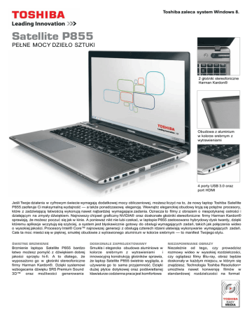 Toshiba zaleca system Windows 8. Satellite P855 PEŁNE MOCY DZIEŁO SZTUKI 2 głośniki stereofoniczne Harman Kardon® Obudowa z aluminium w kolorze srebrnym z wytrawieniami 4 porty USB 3.0 oraz port HDMI Jeśli Twoje działania w cyfrowym świecie wymagają dodatkowej mocy obliczeniowej, możesz liczyć na to, że nowy laptop Toshiba Satellite P855 zaoferuje Ci maksymalną wydajność — a także ponadczasową elegancję. Wewnątrz eleganckiej obudowy kryją się potężne procesory, które z zadziwiającą łatwością wykonują nawet najbardziej wymagające zadania. Oznacza to filmy z obrazem o niespotykanej ostrości i działającym na zmysły dźwiękiem. Najnowszy chipset graficzny NVIDIA® oraz doskonałe głośniki stereofoniczne firmy Harman Kardon® sprawiają, że możesz poczuć się jak w kinie. A ponieważ nikt nie lubi czekać, w laptopie P855 zastosowano hybrydowy dysk twardy, dzięki któremu aplikacje wczytują się szybciej, a system jest błyskawicznie gotowy do obsługi wymagających zadań, takich jak połączenia wideo o wysokiej jakości. Procesory Intel® Core™ najnowszej generacji z obsługą czterech rdzeni ułatwiają wykonywanie wymagających zadań. Cała ta moc mieści się w pięknej, smukłej obudowie z wytrawionego aluminium w kolorze srebrnym — to manifest Twojego stylu. ŚWIETNE BRZMIENIE Brzmienie laptopa Satellite P855 bardzo łatwo możesz pomylić z dźwiękiem dobrej jakości sprzętu hi-fi. A to dlatego, że wyposażono go w głośniki stereofoniczne firmy Harman Kardon®. Dzięki systemowi wzbogacania dźwięku SRS Premium Sound 3D™ oraz możliwości generowania DOSKONALE ZAPROJEKTOWANY Smukła i elegancka obudowa aluminiowa w kolorze srebrnym z wytrawieniami i innowacyjną konstrukcją głośników sprawia, że laptop Satellite P855 świetnie wygląda, a używanie go to sama przyjemność. Dzięki dużej płytce dotykowej oraz podświetlanej klawiaturze codzienna praca jest komfortowa NIEZAPOMNIANE OBRAZY Niezależnie od tego, czy prowadzisz rozmowy wideo w wysokiej rozdzielczości, czy oglądasz filmy Blu-ray, obraz będzie doskonały w każdym miejscu, w którym się znajdziesz. Technologia Toshiba Resolution+ umożliwia nawet konwersję filmów w standardowej rozdzielczości na format Satellite P855-11Q PSPKBE-00501LPL Procesor/ Technologia Procesor Intel® Core™ i7-3610QM trzeciej generacji (2,30/3,30 Turbo GHz, 6 MB Pamięć podręczna trzeciego poziomu) System operacyjny / platforma Windows® 7 Home Premium (w wersji 64-bitowej, preinstalowany z funkcją odzyskiwania dysku twardego firmy Toshiba) Wykończenie z aluminium w kolorze szlachetnego srebra z wytrawieniami, czarna klawiatura Kolor obudowy Ekran 15,6 cala (39,6 cm) Wyświetlacz TFT Toshiba TruBrite® HD o wysokiej jasności i proporcjach 16:9 z podświetleniem LED, Rozdzielczość wewnętrzna: 1366 x 768 750 GB (5,400 obr./min) Serial ATA Dysk twardy 6144 (4096 + 2048) MB, Możliwość rozszerzenia do: 16,384 MB, Technologia: DDR3 RAM (1600 MHz) Pamięć systemowa Urządzenia optyczne Stacja dysków DVD Super Multi (Double Layer) Karta graficzna NVIDIA® GeForce® GT 630M z obsługą technologii CUDA™ i NVIDIA® Optimus™, 2048 MB dedykowanej pamięci wideo RAM. Dostępną pamięć graficzną można rozszerzyć przy użyciu pamięci systemowej za pomocą technologii TurboCache™: do 4095 MB przy zainstalowanych 6 GB pamięci systemowej wyświetlanych w panelu sterowania NVIDIA (w preinstalowanym 64-bitowym systemie operacyjnym). Urządzenie wskazujące Płytka do klikania z funkcją Multi-Touch z różnymi funkcjami przewijania, powiększania i uruchamiania. Komunikacja przewodowa Gigabit Ethernet LAN Komunikacja bezprzewodowa Bezprzewodowa sieć LAN 802.11b/g/n (Realtek), Bluetooth® 4.0 (Realtek) System dźwiękowy Wbudowane głośniki stereofoniczne Harman Kardon® z obsługą technologii Slip Stream , Pokrętło regulacji głośności: za pomocą funkcji klawiszy dostępu, Realtek (ALC280Q-GR) z obsługą technologii SRS Premium Sound 3D™ Interfejsy 1 x RJ-45 , 1 x Wyjście monitora zewnętrznego , 1 x wyjście słuchawkowe (stereofoniczne) , 1 x Wyjście HDMI z obsługą formatu sygnału 1080p , 1 x Czytnik wielu formatów kart (obsługujący karty SD™ o pojemności do 2 GB, miniSD™/microSD™ z adapterem do 2 GB, SDHC™ do 32 GB, SDXC™ do 64 GB i MultiMedia Card™ do 2 GB) , 1 x Zintegrowana kamera internetowa HD o rozdzielczości 1 megapiksela (1280 x 800) z wbudowanym mikrofonem , 2 x USB 3.0 , 2 x USB 3.0 (z funkcją USB Sleep-and-Charge) , 1 x Mikrofon zewnętrzny z obsługą funkcji Sleepand-Music Rozbudowa 2 gniazda pamięci (brak dostępnych do skonfigurowania) Akumulator Technologia: Litowo-jonowy, Do 5 godz. i 30 min (Mobile Mark™ 2007) Oprogramowanie w pakiecie Aplikacja do obsługi kamery internetowej Toshiba, Toshiba Disc Creator, Windows Live Essentials, WildTangent Games Console, Toshiba Eco Utility™, oprogramowanie Toshiba PC Health Monitor, Toshiba Recovery Media Creator, Dodatek Toshiba Resolution+ do programu Windows Media Player, Toshiba Tempro, która sprawdza laptopa pod kątem najnowszych aktualizacji oprogramowania firmy Toshiba, McAfee® Internet Security (z dołączoną darmową 30-dniową subskrypcją), Skype, Ten komputer zawiera wersje programów Microsoft® Word i Excel o ograniczonej funkcjonalności z reklamami. Nie zawiera programów PowerPoint ani Outlook. Kup pakiet Microsoft® Office 2010, aby aktywować pełną wersję oprogramowania Office wstępnie załadowaną na tym komputerze., Toshiba Video Player, funkcja konwersji obrazu 2-W na obraz 3-W ZGODNE AKCESORIA FIRMY TOSHIBA o Stacja dokująca dynadock™ U3.0 — błyszcząca czerń, PA3927E-1PRP o Mysz optyczna USB Toshiba E200, PA3823E-1ETG o Torba Premium na laptopy o przekątnej 16 cali (40,6 cm), PX1787E-1NCA Stacja dokująca Dynadock® U3.0 — kolor czarny Torba Premium na laptopy do 16 cali (40,6 cm) Mysz optyczna USB Toshiba E200 TEG_EN_SatP855_2012. 