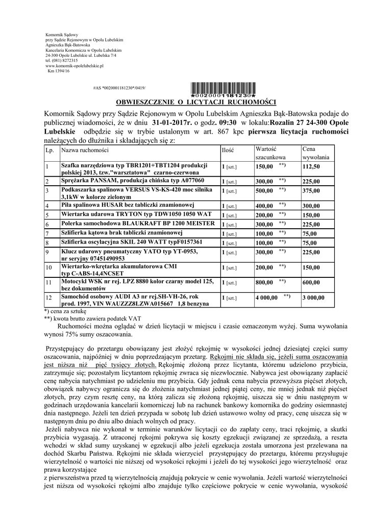 Komornik Sądowy przy Sądzie Rejonowym w Opolu Lubelskim Agnieszka Bąk-Batowska Kancelaria Komornicza w Opolu Lubelskim 24-300 Opole Lubelskie ul. Lubelska 7/4 tel. (081) 8272315 www.komornik-opolelubelskie.pl Km 1394/16 #AS *0020001181230*/0419/ *0020001181230* OBWIESZCZENIE O LICYTACJI RUCHOMOŚCI Komornik Sądowy przy Sądzie Rejonowym w Opolu Lubelskim Agnieszka Bąk-Batowska podaje do publicznej wiadomości, że w dniu 31-01-2017r. o godz. 09:30 w lokalu:Rozalin 27 24-300 Opole Lubelskie odbędzie się w trybie ustalonym w art. 867 kpc pierwsza licytacja ruchomości należących do dłużnika i składających się z: Lp. Nazwa ruchomości Szafka narzędziowa typ TBR1201+TBT1204 produkcji polskiej 2013, tzw."warsztatowa". czarno-czerwona Sprężarka PANSAM, produkcja chińska typ A077060 2 Podkaszarka spalinowa VERSUS VS-KS-420 moc silnika 3 3,1kW w kolorze zielonym Piła spalinowa HUSAR bez tabliczki znamionowej 4 Wiertarka udarowa TRYTON typ TDW1050 1050 WAT 5 Polerka samochodowa BLAUKRAFT BP 1200 MEISTER 6 Szlifierka kątowa brak tabliczki znamionowej 7 Szlifierka oscylacyjna SKIL 240 WATT typF0157361 8 Klucz udarowy pneumatyczny YATO typ YT-0953, 9 nr seryjny 07451490953 Wiertarko-wkrętarka akumulatorowa CMI 10 typ C-ABS-14,4NCSET Motocykl WSK nr rej. LPZ 8880 kolor czarny model 125, 11 bez dokumentów Samochód osobowy AUDI A3 nr rej.SH-VH-26, rok 12 prod. 1997, VIN WAUZZZ8LZWA015667 1,8 benzyna *) cena za sztukę **) kwota brutto zawiera podatek VAT 1 1 [szt.] Wartość szacunkowa 150,00 **) 1 [szt.] 1 [szt.] 300,00 500,00 **) 1 [szt.] 1 [szt.] 1 [szt.] 1 [szt.] 1 [szt.] 1 [szt.] 400,00 200,00 300,00 100,00 100,00 300,00 **) **) 300,00 150,00 225,00 75,00 75,00 225,00 1 [szt.] 200,00 **) 150,00 1 [szt.] 800,00 **) 600,00 1 [szt.] 4 000,00 Ilość **) **) **) **) **) **) Cena wywołania 112,50 225,00 375,00 3 000,00 Ruchomości można oglądać w dzień licytacji w miejscu i czasie oznaczonym wyżej. Suma wywołania wynosi 75% sumy oszacowania. Przystępujący do przetargu obowiązany jest złożyć rękojmię w wysokości jednej dziesiątej części sumy oszacowania, najpóźniej w dniu poprzedzającym przetarg. Rękojmi nie składa się, jeżeli suma oszacowania jest niższa niż pięć tysięcy złotych. Rękojmię złożoną przez licytanta, któremu udzielono przybicia, zatrzymuje się; pozostałym licytantom rękojmię zwraca się niezwłocznie. Nabywca jest obowiązany zapłacić cenę nabycia natychmiast po udzieleniu mu przybicia. Gdy jednak cena nabycia przewyższa pięćset złotych, obowiązek nabywcy ogranicza się do złożenia natychmiast jednej piątej ceny, nie mniej jednak niż pięćset złotych, przy czym resztę ceny, na którą zalicza się złożoną rękojmię, uiszcza się w dniu następnym w godzinach urzędowania kancelarii komorniczej lub na rachunek bankowy komornika do godziny osiemnastej dnia następnego. Jeżeli ten dzień przypada w sobotę lub dzień ustawowo wolny od pracy, cenę uiszcza się w następnym dniu po dniu albo dniach wolnych od pracy. Jeżeli nabywca nie wykonał w terminie warunków licytacji co do zapłaty ceny, traci rękojmię, a skutki przybicia wygasają. Z utraconej rękojmi pokrywa się koszty egzekucji związanej ze sprzedażą, a reszta wchodzi w skład sumy uzyskanej w egzekucji albo jeżeli egzekucja została umorzona jest przelewana na dochód Skarbu Państwa. Rękojmi nie składa wierzyciel przystępujący do przetargu, któremu przysługuje wierzytelność o wartości nie niższej od wysokości rękojmi i jeżeli do tej wysokości jego wierzytelność oraz prawa korzystające z pierwszeństwa przed tą wierzytelnością znajdują pokrycie w cenie wywołania. Jeżeli wartość wierzytelności jest niższa od wysokości rękojmi albo znajduje tylko częściowe pokrycie w cenie wywołania, wysokość rękojmi obniża się - w pierwszym przypadku do różnicy między pełną rękojmią a wartością wierzytelności, w drugim przypadku-do części wartości wierzytelności niepokrytej w cenie wywołania(art. 8671 kpc). W przetargu nie mogą uczestniczyć: dłużnik, komornik, ich małżonkowie, dzieci, rodzice i rodzeństwo, osoby obecne na licytacji w charakterze urzędowym oraz licytant, który nie wykonał warunków poprzedniej licytacji. Stawienie się jednego licytanta wystarcza do odbycia przetargu(art. 8672 § 2 kpc). Prawa osób trzecich nie będą przeszkodą do przeprowadzenia licytacji i przybicia na rzecz nabywcy bez zastrzeżeń, jeżeli osoby te przed rozpoczęciem przetargu nie złożą dowodu, że wniosły powództwo o zwolnienie ruchomości od egzekucji i uzyskały w tym zakresie orzeczenie wstrzymujące egzekucję. Pełnomocnictwo do udziału w przetargu powinno być stwierdzone dokumentem z podpisem urzędowo poświadczonym, chyba że chodzi o pełnomocnictwo udzielone adwokatowi lub radcy prawnemu (art. 8672 § 4 kpc) Komornik w oparciu o art.18 ustawy z dnia 11 marca 2004r o podatku od towarów i usług (Dz.U. Nr 54, poz.535) wystawia faktury VAT. Zgodnie z obowiązującymi przepisami (Ustawa z dnia 09-09-2010r. o podatku od czynności cywilnoprawnych (Dz.U. 2000 Nr 86 poz. 959) na nabywcy ruchomości ciąży obowiązek odprowadzenia podatku od czynności cywilno-prawnych w wyskości 2% do właściwego Urzędu Skarbowego. W związku z pojawiającymi się próbami wpływania na licytantów do odstąpienia od udziału w licytacji przez osoby zainteresowane zakupem ruchomości po cenach wywołania, komornik informuje, że każda zgłoszona próba zastraszenia innego licytanta lub próba przekupstwa w zamian za odstąpienie od licytacji będzie zgłaszana organom ścigania. Art. 305 Kodeksu karnego §1. Kto, w celu osiągnięcia korzyści majątkowej, udaremnia lub utrudnia przetarg publiczny albo wchodzi w porozumienie z inną osobą działając na szkodę właściciela mienia albo osoby lub instytucji, na rzecz której przetarg jest dokonywany, podlega karze pozbawienia wolności do lat trzech. § 2.