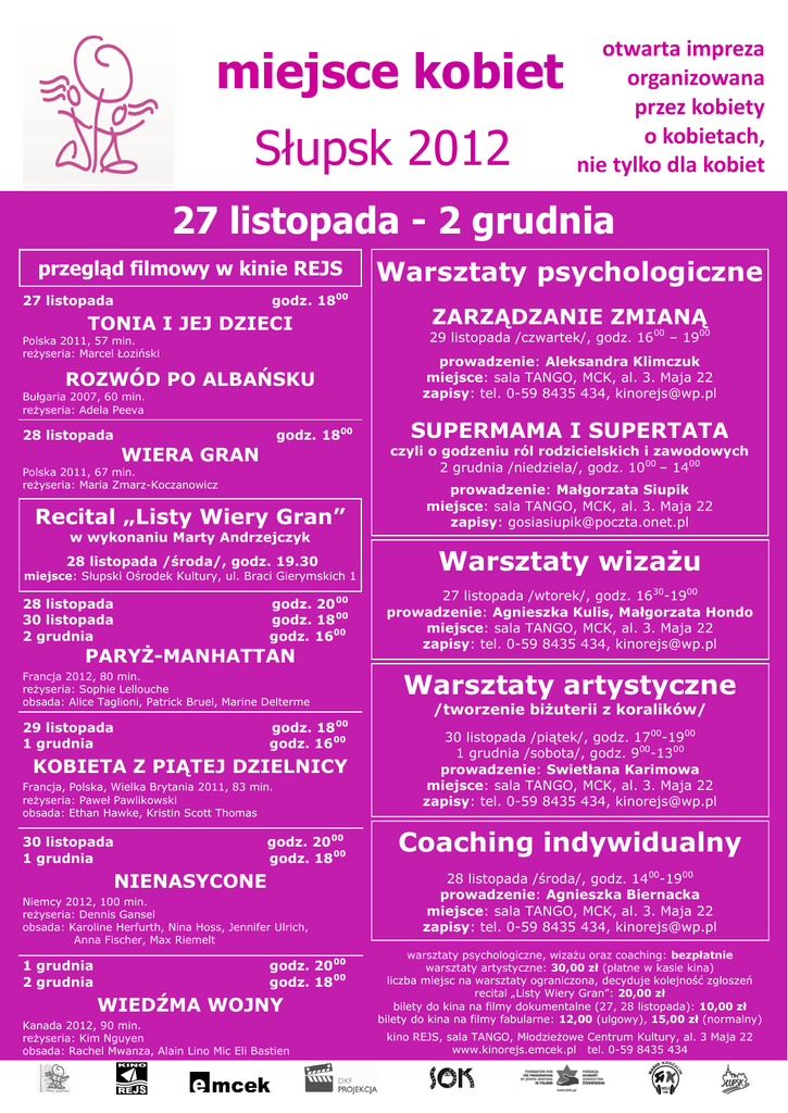 miejsce kobiet Słupsk 2012 otwarta impreza organizowana przez kobiety o kobietach, nie tylko dla kobiet 27 listopada - 2 grudnia przegląd filmowy w kinie REJS 27 listopada godz. 18 TONIA I JEJ DZIECI Polska 2011, 57 min. reżyseria: Marcel Łoziński ROZWÓD PO ALBAŃSKU Bułgaria 2007, 60 min. reżyseria: Adela Peeva godz. 1800 28 listopada WIERA GRAN Polska 2011, 67 min. reżyseria: Maria Zmarz-Koczanowicz Recital „Listy Wiery Gran” w wykonaniu Marty Andrzejczyk 28 listopada /środa/, godz. 19.30 miejsce: Słupski Ośrodek Kultury, ul. Braci Gierymskich 1 godz. 20 00 godz. 18 00 godz. 1600 28 listopada 30 listopada 2 grudnia PARYŻ-MANHATTAN Francja 2012, 80 min. reżyseria: Sophie Lellouche obsada: Alice Taglioni, Patrick Bruel, Marine Delterme godz. 18 00 godz. 16 00 29 listopada 1 grudnia KOBIETA Z PIĄTEJ DZIELNICY Francja, Polska, Wielka Brytania 2011, 83 min. reżyseria: Paweł Pawlikowski obsada: Ethan Hawke, Kristin Scott Thomas godz. 20 00 godz. 18 00 30 listopada 1 grudnia NIENASYCONE Niemcy 2012, 100 min. reżyseria: Dennis Gansel obsada: Karoline Herfurth, Nina Hoss, Jennifer Ulrich, Anna Fischer, Max Riemelt 1 grudnia 2 grudnia godz. 20 00 godz. 18 00 WIEDŹMA WOJNY Kanada 2012, 90 min. reżyseria: Kim Nguyen obsada: Rachel Mwanza, Alain Lino Mic Eli Bastien Warsztaty psychologiczne 00 ZARZĄDZANIE ZMIANĄ 29 listopada /czwartek/, godz. 1600 – 1900 prowadzenie: Aleksandra Klimczuk miejsce: sala TANGO, MCK, al. 3. Maja 22 zapisy: tel. 0-59 8435 434, [email protected] SUPERMAMA I SUPERTATA czyli o godzeniu ról rodzicielskich i zawodowych 2 grudnia /niedziela/, godz. 1000 – 1400 prowadzenie: Małgorzata Siupik miejsce: sala TANGO, MCK, al. 3. Maja 22 zapisy: [email protected] Warsztaty wizażu 27 listopada /wtorek/, godz. 1630-1900 prowadzenie: Agnieszka Kulis, Małgorzata Hondo miejsce: sala TANGO, MCK, al. 3. Maja 22 zapisy: tel. 0-59 8435 434, [email protected] Warsztaty artystyczne /tworzenie biżuterii z koralików/ 30 listopada /piątek/, godz. 1700-1900 1 grudnia /sobota/, godz. 900-1300 prowadzenie: Swietłana Karimowa miejsce: sala TANGO, MCK, al. 3. Maja 22 zapisy: tel. 0-59 8435 434, [email protected] Coaching indywidualny 28 listopada /środa/, godz. 1400-1900 prowadzenie: Agnieszka Biernacka miejsce: sala TANGO, MCK, al. 3. Maja 22 zapisy: tel. 0-59 8435 434, [email protected] warsztaty psychologiczne, wizażu oraz coaching: bezpłatnie warsztaty artystyczne: 30,00 zł (płatne w kasie kina) liczba miejsc na warsztaty ograniczona, decyduje kolejność zgłoszeń recital „Listy Wiery Gran”: 20,00 zł bilety do kina na filmy dokumentalne (27, 28 listopada): 10,00 zł bilety do kina na filmy fabularne: 12,00 (ulgowy), 15,00 zł (normalny) kino REJS, sala TANGO, Młodzieżowe Centrum Kultury, al. 3 Maja 22 www.kinorejs.emcek.pl tel. 0-59 8435 434