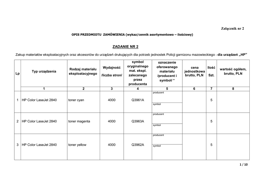 Załącznik nr 2 OPIS PRZEDMIOTU ZAMÓWIENIA (wykaz/cennik asortymentowo – ilościowy) ZADANIE NR 2 Zakup materiałów eksploatacyjnych oraz akcesoriów do urządzeń drukujących dla potrzeb jednostek Policji garnizonu mazowieckiego - dla urządzeń „HP” Lp Typ urządzenia 1 Wydajność Rodzaj materiału eksploatacyjnego /liczba stron/ 2 3 symbol oryginalnego mat. ekspl. zalecanego przez producenta 4 oznaczenie oferowanego materiału /producent i symbol/ * 5 cena Ilość jednostkowa brutto, PLN Szt. 6 7 wartość ogółem, brutto, PLN 8 producent 1 HP Color LaseJet 2840 toner cyan 4000 Q3961A 5 symbol producent 2 HP Color LaseJet 2840 toner magenta 4000 Q3963A 5 symbol producent 3 HP Color LaseJet 2840 toner yellow 4000 Q3962A symbol 5 1 / 10 1 2 3 4 5 6 7 8 producent 4 HP Color LaseJet 1600 toner czarny 2500 HP-Q6000A 3 symbol producent 5 HP Color LaseJet 1600 toner cyan 2000 HP-Q6001A 2 symbol producent 6 HP Color LaserJet 1600 toner magenta 2000 HP-Q6003A 2 symbol producent 7 HP Color LaserJet 1600 toner yellow 2000 HP-Q6002A symbol 2 producent 8 HP Color LaserJet 4550n Toner czarny 9000 C4191A symbol 4 2 / 10 1 2 3 4 5 6 7 8 producent 9 HP Color LaserJet CP1215/CM1312MFP toner cyan 1400 CB541A 10 symbol producent 10 HP Color LaserJet CP1215/CM1312MFP toner magenta 1400 CB543A 10 symbol producent 11 HP Color LaserJet CP1215/CM1312MFP toner yellow 1400 CB542A symbol 10 producent 12 HP DeskJet 3550/3650/3745 tusz kolor 28 190 (8 ml) C8728A symbol 3 producent 13 HP DeskJet 3550/3650/3745 tusz czarny 27 220 (10 ml) C8727A 3 symbol 3 / 10 1 HP DeskJet 450/5150/5550/OfficeJet 14 5610/PhotoSmart 7760/7350/PSC1110 HP DeskJet 450/5150/5550/OfficeJet 15 5610/PhotoSmart 7760/7350/PSC1110 2 3 4 5 6 7 8 producent tusz kolor 57 400 (17 ml) C6657AE 50 symbol producent tusz kolor 56 450 (19 ml) C6656AE 60 symbol producent HP DeskJet 460/5740/OfficeJet 16 100/H470/K7100/PhotoSmart 8150/PSC2355 symbol tusz kolor 344 14 ml C9363EE 20 producent 17 HP DeskJet 460/PhotoSmart 8150/PSC2355 tusz czarny 338 11 ml C8765EE symbol 40 4 / 10 1 HP DeskJet 6120/6122/710C/895cxi/930 18 C/959C/980cxi/G55/G85/122 0C 2 3 4 5 6 7 8 producent tusz czarny 45 833 (42 ml) 51645A 6 symbol producent HP DeskJet 6120/6122/920C/930C/940Ci 19 /959C/980cxi/G55/G85/1220 C tusz kolor 78 970 (38 ml) C6578A symbol 5 producent 20 HP DeskJet 840C/920C/940C tusz czarny 15 495 (25 ml) C6615D symbol 15 producent HP DeskJet 21 D1360/3920/3940/F4180/F38 0/PSC1410/F2180 tusz czarny 21 XL 475 (12 ml) C9351CE 50 symbol 5 / 10 1 2 3 4 5 6 7 8 producent HP DeskJet 22 D1360/3920/3940/F4180/F38 0/PSC1410/F2180 tusz kolor 22 XL 415 (11 ml) C9352CE 40 symbol producent 23 HP LaserJet 1000/1000W/1200/1220 HP LaserJet 1010/112/1018/1020/1022n/3 24 015/3020/3030/3050/3052/30 55/M1005mfp Toner 15A 2500 C7115A 40 symbol producent Toner 12 A 2000 Q2612A 372 symbol producent 25 HP LaserJet 1100/1100A/3200 Toner 92 A 2500 C4092A symbol 70 Producent 26 HP LaserJet 1160/1320 Toner 49 A 2500 Q5949A symbol 5 6 / 10 1 2 3 4 5 6 7 8 Producent 27 HP LaserJet 1200/1220 Toner 15 X 3500 C7115X 2 symbol producent 28 HP LaserJet 1300 Toner 13 X 4000 Q2613X 2 symbol producent 29 HP LaserJet 1320/3390 Toner 49 X 6000 Q5949X 100 symbol producent 30 HP LaserJet 2055d Toner 05X 6500 CE505X 2 symbol Producent 31 HP LaserJet 5L/6L/3100/3150 Toner 06A 2500 C3906A 3 symbol 7 / 10 1 2 3 4 5 6 7 8 producent 32 HP LaserJet P1005/P1006 Toner 35 A 1500 CB435A 500 symbol producent 33 HP LaserJet P1102/P1102W/M1132MFP Toner 85A 1600 CE285A 100 symbol producent 34 HP LaserJet P1505/P1505n/M1120MFP Toner 36 A 2000 CB436A symbol producent 15 5 35 HP LaserJet P1606dn Toner 78 A 2100 CE278A symbol producent 36 HP LaserJet P2035 Toner 05 A 2300 CE505A symbol 5 8 / 10 1 2 3 4 5 6 7 8 producent 37 HP OfficeJet 100/H470 tusz czarny 337 400 (11 ml) C9364EE symbol 10 producent 38 HP PhotoSmart Wireless B109n (Q8444B) Głowica CMYK 5500 CN643A 2 symbol producent 29 HP Color LaserJet 3600 toner black 6000 Q6470A 2 symbol producent 40 HP Color LaserJet 3600 toner cyan 4000 Q6471A 2 symbol producent 41 HP Color LaserJet 3600 toner yellow 4000 Q6472A 2 symbol 9 / 10 1 2 3 4 5 6 7 8 producent 42 HP Color LaserJet 3600 toner magenta 4000 Q6473A 2 symbol RAZEM wartość brutto, PLN …………..………………………………..………………………………… (podpis i pieczęć osoby upoważnionej do reprezentowania Wykonawcy) *) pod pojęciem oryginalnego materiału eksploatacyjnego rozumie się towar, którego producent wskazany jest w kolumnie 1 oraz posiadający symbol oryginalnego materiału eksploatacyjnego z kolumny 4; 10 / 10