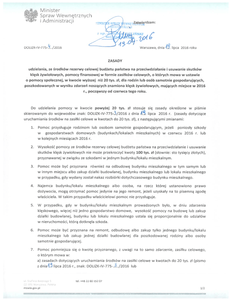 Minister Spraw Wewnętrznych i Administracji „fNTST RSP W wTNETWdzam: Ml: TR•CJI ek: „: 4.O b DOLiZK-ly-775-..../2016 Warszawa, dnia AQ „u”.. lipca 2016 roku ZASADY udzielania, ze środków rezerwy celowej budżetu państwa na przeciwdziałanie i usuwanie skutków klęsk żywiołowych, pomocy finansowej w formie zasiłków celowych, o których mowa w ustawie o pomocy społecznej, w kwocie wyższej niż 20 tys. zł, dla rodzin lub osób samotnie gospodarujących, poszkodowanych w wyniku zdarzeń noszących znamiona klęsk żywiołowych, mających miejsce w 2016 r., począwszy od czerwca tego roku. Do udzielania pomocy w kwocie powyżej 20 tys. zł stosuje się zasady określone w piśmie skierowanym do wojewodów znak: DOLIZK-Iy-775-3./2016 z dnia A.. lipca 2016 r. (zasady dotyczące uruchamiania środków na zasiłki celowe w kwotach do 20 tys. zł), z następującymi zmianami: 1. Pomoc przysługuje rodzinom lub osobom samotnie gospodarującym, jeżeli poniosły szkody w gospodarstwach domowych (budynkach/lokalach mieszkalnych) w czerwcu 2016 r. lub w kolejnych miesiącach 2016 r. 2. Wysokość pomocy ze środków rezerwy celowej budżetu państwa na przeciwdziałanie i usuwanie skutków klęsk żywiołowych nie może przekroczyć kwoty 100 tys. zł (słownie: sto tysięcy złotych), przyznawanej w związku ze szkodami wjednym budynku/lokalu mieszkalnym. 3. Pomoc może być przyznana również na odbudowę budynku mieszkalnego w tym samym lub w innym miejscu albo zakup działki budowlanej, budynku mieszkalnego lub lokalu mieszkalnego w przypadku, gdy wydany został nakaz rozbiórki dotychczasowego budynku mieszkalnego. 4. Najemca budynku/lokalu mieszkalnego albo osoba, na rzecz której ustanowiono prawo dożywocia, mogą otrzymać pomoc jedynie na jego remont, jeżeli uzyskały na to pisemną zgodę właściciela. W takim przypadku właścicielowi pomoc nie przysługuje. 5. W przypadku, gdy w budynku/lokalu mieszkalnym prowadzonych było, w dniu zdarzenia klęskowego, więcej niż jedno gospodarstwo domowe, wysokość pomocy na budowę lub zakup działki budowlanej, budynku lub lokalu mieszkalnego ustala się proporcjonalnie do udziałów w nieruchomości, którą dotknęła szkoda. 6. Pomoc może być przyznana na remont, odbudowę albo zakup tylko jednego budynku/lokalu mieszkalnego lub zakup jednej działki budowlanej dla poszkodowanej rodziny albo osoby samotnie gospodarującej. 7. Pomoc pomniejsza się o kwotę przyznanego, z uwagi na to samo zdarzenie, zasiłku celowego, o którym mowa w: a) zasadach dotyczących uruchamiania środków na zasiłki celowe w kwotach do 20 tys. zł (pismo z dniaĄ. lipca 2016 r., znak: DOLlZK-ly-775-.../2016 lub L Shna ;2 591 mswia.goy.pl 5 Pelsta tO9”C tel. +4822 60 15207 1/2 b) zasadach dotyczących uruchamiania środków na zasiłki celowe w kwotach do 6 tys. zł (pismo z dnia 24 czerwca 2016 r., znak: DOLIZK-Iy-775-1/2016), w części, w jakiej ten zasiłek został przeznaczony na remont budynku/lokalu mieszkalnego jeżeli nie został on uwzględniony (odliczony) w wysokości pomocy określonej pod lit. a). — 8. Zasiłki powinny być wypłacane w transzach pierwsza w wysokości do 30% przyznanej pomocy. W przypadkach uzasadnionych potrzebą jednorazowego wydatku w większej kwocie (np. zakupu działki budowlanej lub budynku/lokalu mieszkalnego) możliwe jest przekazanie pierwszej transzy zasiłku w kwocie wyższej niż 30% przyznanej pomocy, aż do pełnej kwoty — przyznanego zasiłku. 9. Wypłata kolejnej transzy zasiłku winna zostać poprzedzona weryfikacją sposobu wykorzystania środków przekazanych w ramach wcześniejszych transzy, w szczególności rozliczeniem za pomocą faktur i rachunków. u Stana atoreo 5 02591 Warszai, PoIsa mswia.goy.pl tel. ÷48 2260 15207 2/2