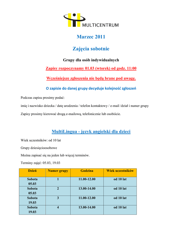 Marzec 2011 Zajęcia sobotnie Grupy dla osób indywidualnych Zapisy rozpoczynamy 01.03 (wtorek) od godz. 11:00 Wcześniejsze zgłoszenia nie będą brane pod uwagę. O zapisie do danej grupy decyduje kolejność zgłoszeń Podczas zapisu prosimy podać: imię i nazwisko dziecka / datę urodzenia / telefon kontaktowy / e-mail /dział i numer grupy Zapisy prosimy kierować drogą e-mailową, telefonicznie lub osobiście. MultiLingua - język angielski dla dzieci Wiek uczestników: od 10 lat Grupy dziesięcioosobowe Można zapisać się na jeden lub więcej terminów. Terminy zajęć: 05.03, 19.03 Dzień Numer grupy Godzina Wiek uczestników Sobota 05.03 Sobota 05.03 Sobota 19.03 Sobota 19.03 1 11.00-12.00 od 10 lat 2 13.00-14.00 od 10 lat 3 11.00-12.00 od 10 lat 4 13.00-14.00 od 10 lat Tematyka zajęć: 05.03 - Famous monuments Dzieci poznają najsłynniejsze zabytki świata oraz pokrótce historie ich powstania. Poznają nowe angielskie słownictwo oraz ćwiczą korzystanie z mapy . 19.03 - Who was Saint Patrick? Na zajęciach postaramy się przybliżyć dzieciom kulturę i ciekawostki związane z “zieloną wyspą”. Poznają sylwetkę patrona Irlandii oraz sposoby w jakie dziś obchodzone jest jego święto. Zajęcia rodzinne: MultiKid – Paleta rodzinna Razem z Puddingiem i Bezą poznajemy różne dziedziny życia. Możemy dowiedzieć się gdzie mieszkają zwierzęta, poznać zjawiska sezonów, zaprojektować własny pokój, ogród lub kuchnię, a nawet stworzyć film animowany. Poznajemy litery, cyfry, kolory i kształty podczas zabawy w gronie rówieśników. W zajęciach biorą udział dzieci z rodzicami lub opiekunami. Wiek uczestników: 4-7 lat Grupy dziesięcioosobowe Można zapisać się na jeden lub więcej terminów. Terminy zajęć: 05.03, 12.03, 19.03 Dzień Numer grupy Godzina Wiek uczestników Sobota 05.03 Sobota 05.03 Sobota 12.03 Sobota 12.03 Sobota 19.03 Sobota 19.03 1 11.00-12.30 4-7 lat 2 13.10-14.40 4-7 lat 3 11.00-12.30 4-7 lat 4 13.10-14.40 4-7 lat 5 11.00-12.30 4-7 lat 6 13.10-14.40 4-7 lat Konstrukcje z klocków K’Nex - Paleta rodzinna Konstrukcje rozmaitych budowli z klocków K’Nex z wykorzystaniem energii słonecznej i silników elektrycznych. Poznajemy budowę i działanie prostych mechanizmów jak przekładnie, dźwignie, koła i osie. W zajęciach biorą udział dzieci z rodzicami lub opiekunami. Wiek uczestników: od 5 lat Grupy dziesięcioosobowe Można zapisać się na jeden lub więcej terminów. Terminy zajęć: 12.03, 19.03, 26.03 Dzień Numer grupy Godzina Wiek uczestników Sobota 12.03 Sobota 12.03 Sobota 19.03 Sobota 19.03 Sobota 26.03 Sobota 26.03 1 11.00-12.30 od 5 lat 2 13.10-14.40 od 5 lat 3 11.00-12.30 od 5 lat 4 13.10-14.40 od 5 lat 5 11.00-12.30 od 5 lat 6 13.10-14.40 od 5 lat MultiSztuka – warsztaty z grafiki komputerowej Zapraszamy na zajęcia rodzinne z zakresu grafiki komputerowej. W tym miesiącu odbędzie się jedno spotkanie. Tematem zajęć będzie „technika kolażu”, a pracować będziemy w programie GIMP, gdzie wykonamy fotomontaż. W zajęciach biorą udział dzieci z rodzicami lub opiekunami. Wiek uczestników: od 7 lat Grupy dziesięcioosobowe Termin zajęć: 26.03 Dzień Numer grupy Godzina Wiek uczestników Sobota 26.03 Sobota 26.03 1 11.00-12.30 od 7 lat 2 13.10-14.40 od 7 lat Zapraszamy. MultiCentrum Oddział Biblioteki Publicznej w Dzielnicy Białołęka m.st. Warszawy ul. Porajów 14 03-188 Warszawa tel.: 22 614 60 70 e-mail: [email protected] www.multicentrum.warszawa.pl