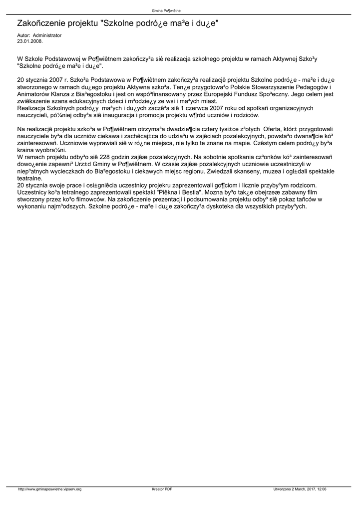 Gmina Po¶wiêtne Zakoñczenie projektu "Szkolne podró¿e ma³e i du¿e" Autor: Administrator 23.01.2008. W Szkole Podstawowej w Po¶wiêtnem zakoñczy³a siê realizacja szkolnego projektu w ramach Aktywnej Szko³y "Szkolne podró¿e ma³e i du¿e". 20 stycznia 2007 r. Szko³a Podstawowa w Po¶wiêtnem zakoñczy³a realizacjê projektu Szkolne podró¿e - ma³e i du¿e stworzonego w ramach du¿ego projektu Aktywna szko³a. Ten¿e przygotowa³o Polskie Stowarzyszenie Pedagogów i Animatorów Klanza z Bia³egostoku i jest on wspó³finansowany przez Europejski Fundusz Spo³eczny. Jego celem jest zwiêkszenie szans edukacyjnych dzieci i m³odzie¿y ze wsi i ma³ych miast. Realizacja Szkolnych podró¿y ma³ych i du¿ych zaczê³a siê 1 czerwca 2007 roku od spotkañ organizacyjnych nauczycieli, pó¼niej odby³a siê inauguracja i promocja projektu w¶ród uczniów i rodziców. Na realizacjê projektu szko³a w Po¶wiêtnem otrzyma³a dwadzie¶cia cztery tysi±ce z³otych Oferta, któr± przygotowali nauczyciele by³a dla uczniów ciekawa i zachêcaj±ca do udzia³u w zajêciach pozalekcyjnych, powsta³o dwana¶cie kó³ zainteresowañ. Uczniowie wyprawiali siê w ró¿ne miejsca, nie tylko te znane na mapie. Czêstym celem podró¿y by³a kraina wyobra¼ni. W ramach projektu odby³o siê 228 godzin zajêæ pozalekcyjnych. Na sobotnie spotkania cz³onków kó³ zainteresowañ dowo¿enie zapewni³ Urz±d Gminy w Po¶wiêtnem. W czasie zajêæ pozalekcyjnych uczniowie uczestniczyli w niep³atnych wycieczkach do Bia³egostoku i ciekawych miejsc regionu. Zwiedzali skanseny, muzea i ogl±dali spektakle teatralne. 20 stycznia swoje prace i osi±gniêcia uczestnicy projekru zaprezentowali go¶ciom i licznie przyby³ym rodzicom. Uczestnicy ko³a tetralnego zaprezentowali spektakl "Piêkna i Bestia". Mozna by³o tak¿e obejrzeæ zabawny film stworzony przez ko³o filmowców. Na zakoñczenie prezentacji i podsumowania projektu odby³ siê pokaz tañców w wykonaniu najm³odszych. Szkolne podró¿e - ma³e i du¿e zakoñczy³a dyskoteka dla wszystkich przyby³ych. http://www.gminaposwietne.vipserv.org Kreator PDF Utworzono 2 March, 2017, 12:06