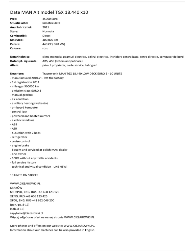 Date MAN Alt model TGX 18.440 x10 Pret: Situatie acte: Anul fabricatiei: Stare: Combustibil: Km rulati: Putere: Culoare: 45000 Euro Inmatriculata 2011 Normala Diesel 300,000 km 440 CP ( 328 kW) rosu Dotari tehnice: Dotari pt. siguranta: Altele: clima manuala, geamuri electrice, oglinzi electrice, inchidere centralizata, servo directie, computer de bord ABS, ASR (sistem antipatinare) primul proprietar, carte service, tahograf Descriere: Tractor-unit MAN TGX 18.440 LOW DECK EURO 5 - 10 UNITS - manufactured 2010.VI - left the factory - 1st registration 2011 - mileages 300000 km - emission class EURO 5 - manual gearbox - air condition - auxiliary heating (webasto) - on-board komputer - central lock - powered and heated mirrors - electric windows - ABS - ASR - XLX cabin with 2 beds - refrigerator - cruise control - engine brake - bought and serviced at polish MAN dealer - one owner - 100% without any traffic accidents - full service history - technical and visual condition - LIKE NEW! 10 UNITS ON STOCK! WWW.CIEZAROWKI.PL KRAKÓW tel. POL, ENG, RUS +48 660 123 125 ENG, RUS +48 606 123 425 POL, ENG, RUS +48 662 046 200 (pon.-pt. 8-17) (sob. 8-15) [email protected] Więcej zdjęć oraz ofert na naszej stronie WWW.CIEZAROWKI.PL More photos and offers on our website: WWW.CIEZAROWKI.PL. Information about our machines can be also provided in English. Больше фотографии и предложений на сайте: WWW.CIEZAROWKI.PL. Информацию о нашей технике можно получить также на русском языке. http://www.depozitauto.ro/vand-man-alt-model-second-hand-2011-Bucuresti-id177668.html http://www.depozitauto.ro/camioane/man/alt-model/