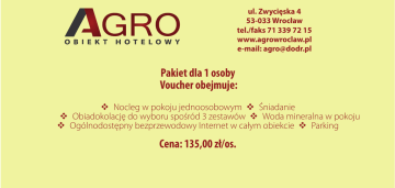 ul. Zwycięska 4 53-033 Wrocław tel./faks 71 339 72 15 www.agrowroclaw.pl e-mail: [email protected] Pakiet dla 1 osoby Voucher obejmuje: Nocleg w pokoju jednoosobowym Śniadanie Obiadokolację do wyboru spośród 3 zestawów Woda mineralna w pokoju Ogólnodostępny bezprzewodowy Internet w całym obiekcie Parking Cena: 135,00 zł/os.