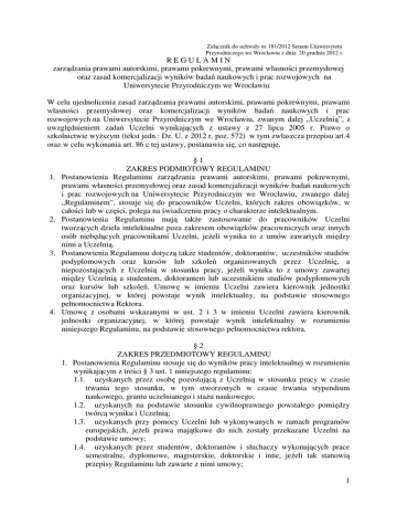 Załącznik do uchwały nr 181/2012 Senatu Uniwersytetu Przyrodniczego we Wrocławiu z dnia 20 grudnia 2012 r. REGULAMIN zarządzania prawami autorskimi, prawami pokrewnymi, prawami własności przemysłowej oraz zasad komercjalizacji wyników badań naukowych i prac rozwojowych QD Uniwersytecie Przyrodniczym we Wrocławiu W celu ujednolicenia zasad zarządzania prawami autorskimi, prawami pokrewnymi, prawami własności przemysłowej oraz komercjalizacji wyników badań naukowych i prac rozwojowych QD Uniwersytecie Przyrodniczym we Wrocławiu, zwanym dalej „Uczelnią”, z uwzględnieniem zadań Uczelni wynikających z ustawy z 27 lipca 2005 r. Prawo o szkolnictwie wyŜszym (tekst jedn.: Dz. U. z 2012 r. poz. 572) w tym zwłaszcza przepisu art.4 oraz w celu wykonania art. 86 c tej ustawy, postanawia się, co następuje. 1. 2. 3. 4. §1 ZAKRES PODMIOTOWY REGULAMINU Postanowienia Regulaminu zarządzania prawami autorskimi, prawami pokrewnymi, prawami własności przemysłowej oraz zasad komercjalizacji wyników badań naukowych i prac rozwojowych QD Uniwersytecie Przyrodniczym we Wrocławiu, zwanego dalej „Regulaminem”, stosuje się do pracowników Uczelni, których zakres obowiązków, w całości lub w części, polega na świadczeniu pracy o charakterze intelektualnym. Postanowienia Regulaminu mają takŜe zastosowanie do pracowników Uczelni tworzących dzieła intelektualne poza zakresem obowiązków pracowniczych oraz innych osób niebędących pracownikami Uczelni, jeŜeli wynika to z umów zawartych między nimi a Uczelnią. Postanowienia Regulaminu dotyczą takŜe studentów, doktorantów, uczestników studiów podyplomowych oraz kursów lub szkoleń organizowanych przez Uczelnię, a niepozostających z Uczelnią w stosunku pracy, jeŜeli wynika to z umowy zawartej między Uczelnią a studentem, doktorantem lub uczestnikiem studiów podyplomowych oraz kursów lub szkoleń. Umowę w imieniu Uczelni zawiera kierownik jednostki organizacyjnej, w której powstaje wynik intelektualny, na podstawie stosownego pełnomocnictwa Rektora. Umowę z osobami wskazanymi w ust. 2 i 3 w imieniu Uczelni zawiera kierownik jednostki organizacyjnej, w której powstaje wynik intelektualny w rozumieniu niniejszego Regulaminu, na podstawie stosownego pełnomocnictwa rektora. §2 ZAKRES PRZEDMIOTOWY REGULAMINU 1. Postanowienia Regulaminu stosuje się do wyników pracy intelektualnej w rozumieniu wynikającym z treści § 3 ust. 1 niniejszego regulaminu: 1.1. uzyskanych przez osobę pozostającą z Uczelnią w stosunku pracy w czasie trwania tego stosunku, w tym stworzonych w czasie trwania stypendium naukowego, grantu uczelnianego i staŜu naukowego; 1.2. uzyskanych na podstawie stosunku cywilnoprawnego powstałego pomiędzy twórcą wyniku i Uczelnią; 1.3. uzyskanych przy pomocy Uczelni lub wykonywanych w ramach programów europejskich, jeŜeli prawa majątkowe do nich zostały przekazane Uczelni na podstawie umowy; 1.4. uzyskanych przez studentów, doktorantów i słuchaczy wykonujących prace semestralne, dyplomowe, magisterskie, doktorskie i inne, jeŜeli tak stanowią przepisy Regulaminu lub zawarte z nimi umowy; 1 1.5. uzyskanych w rezultacie wykonywania na rzecz Uczelni w ramach stosunków cywilnoprawnych prac badawczych i badawczo-rozwojowych przez studentów, doktorantów lub osoby trzecie, jeŜeli wynika to z ich treści; 1.6. przyjętych przez Uczelnię od osób trzecich na podstawie czynności cywilnoprawnych lub przeniesionych na rzecz Uczelni przez twórcę na warunkach przewidzianych w niniejszym Regulaminie. 2. Wszelkie określone w niniejszym Regulaminie zasady dotyczące twórców stosuje się odpowiednio do współtwórców utworów wspólnych, utworów połączonych przez twórców do wspólnego rozpowszechniania, zespołu autorskiego tworzącego utwór zbiorowy, a takŜe do kaŜdego przypadku wspólności prawa do przedmiotu własności przemysłowej. 3. W odniesieniu do umów o prace badawcze, naukowo-badawcze i badawczorozwojowe zawieranych z podmiotami gospodarczymi naleŜy kaŜdorazowo określać stronę uprawnioną do publikacji i dysponowania wynikami powstałymi w trakcie realizacji umowy; zaleca się przy tym podjęcie starań w celu zapewnienia Uczelni co najmniej prawa współwłasności tych wyników. 4. W przypadku gdy w zespołowych pracach badawczych biorą udział osoby niebędące pracownikami Uczelni, zobowiązuje się wyznaczonego przez Uczelnię kierownika takiego zespołu do zapewnienia stosowania zasad Regulaminu w celu odpowiedniego zabezpieczenia interesów Uczelni w stosunku do tych osób i wyników prac badawczych powstałych z ich udziałem. §3 DEFINICJE POJĘĆ UśYWANYCH W REGULAMINIE 1. Przez wyniki prac intelektualnych, zwane dalej wynikami, rozumie się: 1.1. utwory naukowe podlegające ochronie, zgodnie z ustawą z dnia 4 lutego 1994 r. o prawie autorskim i prawach pokrewnych (tekst jedn.: Dz. U. z 2006 r. Nr 90, poz. 631, z późn. zm.) zwaną dalej „Prawem autorskim”, w szczególności kaŜdy utwór, który stanowi rezultat naukowego procesu poznawczego skierowany na przedstawienie obiektywnie istniejącej rzeczywistości, wyraŜony i ustalony w dowolny sposób, jeŜeli odznacza się indywidualnym charakterem osobowości twórcy, w tym takŜe opracowania o charakterze popularnym i dydaktycznym; 1.2. utwory niemające charakteru naukowego, podlegające ochronie zgodnie z Prawem autorskim, w szczególności programy komputerowe prace publicystyczne, kartograficzne, projektowe, fotograficzne, plastyczne, wzornictwo przemysłowe, prezentacje multimedialne, repozytoria, materiały przygotowane i rozpowszechniane na kursach i szkoleniach, a takŜe bazy danych, jeŜeli przyjęty w nich układ lub zestawienie ma charakter twórczy; 1.3. bazy danych, zarówno o cechach utworów, jak i chronionych na podstawie ustawy z 27 lipca 2001 r. o ochronie baz danych (Dz. U. Nr 128, poz. 1402 ze zm.) 1.4. projekty wynalazcze oraz oznaczenia pochodzenia towar