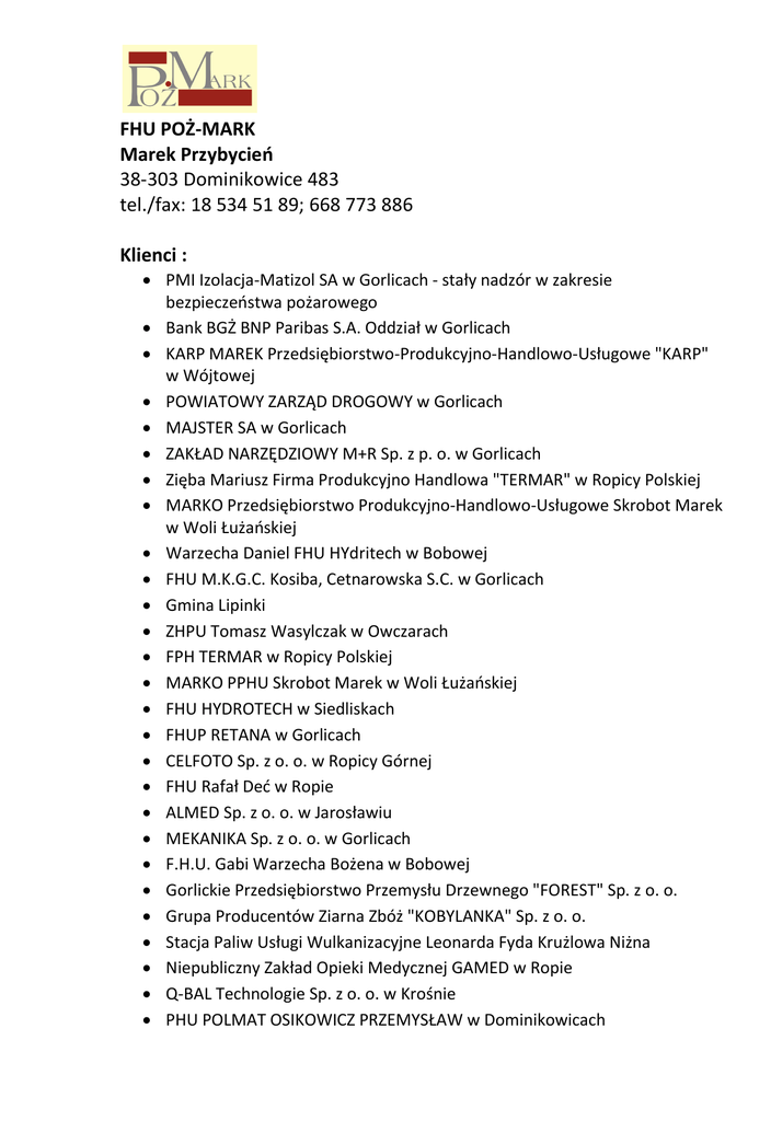 FHU POŻ-MARK Marek Przybycień 38-303 Dominikowice 483 tel./fax: 18 534 51 89; 668 773 886 Klienci : PMI Izolacja-Matizol SA w Gorlicach - stały nadzór w zakresie bezpieczeństwa pożarowego Bank BGŻ BNP Paribas S.A. Oddział w Gorlicach KARP MAREK Przedsiębiorstwo-Produkcyjno-Handlowo-Usługowe "KARP" w Wójtowej POWIATOWY ZARZĄD DROGOWY w Gorlicach MAJSTER SA w Gorlicach ZAKŁAD NARZĘDZIOWY M+R Sp. z p. o. w Gorlicach Zięba Mariusz Firma Produkcyjno Handlowa "TERMAR" w Ropicy Polskiej MARKO Przedsiębiorstwo Produkcyjno-Handlowo-Usługowe Skrobot Marek w Woli Łużańskiej Warzecha Daniel FHU HYdritech w Bobowej FHU M.K.G.C. Kosiba, Cetnarowska S.C. w Gorlicach Gmina Lipinki ZHPU Tomasz Wasylczak w Owczarach FPH TERMAR w Ropicy Polskiej MARKO PPHU Skrobot Marek w Woli Łużańskiej FHU HYDROTECH w Siedliskach FHUP RETANA w Gorlicach CELFOTO Sp. z o. o. w Ropicy Górnej FHU Rafał Deć w Ropie ALMED Sp. z o. o. w Jarosławiu MEKANIKA Sp. z o. o. w Gorlicach F.H.U. Gabi Warzecha Bożena w Bobowej Gorlickie Przedsiębiorstwo Przemysłu Drzewnego "FOREST" Sp. z o. o. Grupa Producentów Ziarna Zbóż "KOBYLANKA" Sp. z o. o. Stacja Paliw Usługi Wulkanizacyjne Leonarda Fyda Krużlowa Niżna Niepubliczny Zakład Opieki Medycznej GAMED w Ropie Q-BAL Technologie Sp. z o. o. w Krośnie PHU POLMAT OSIKOWICZ PRZEMYSŁAW w Dominikowicach Zakład Usług Budowlanych i Transportowych Budowa Dróg "ANTEX" Antoni Pyzik w Moszczenicy DELIKATESY "CENTRUM" Bogdan Król w Gorlicach Przedsiębiorstwo Produkcyjno-Handlowe KOS Jan Kos w Nowym Sączu Eco Max Sp. z o. o. w Gorlicach Zespół Szkół w Kwiatonowicach Przedsiębiorstwo Produkcyjno-Handlowe KOS Jan Kos SZPILA Sp. J. w Wilczyskach PPHU COUGAR w Gorlicach BGŻ o w Gorlicach TERMOTECH Sp. J. w Gorlicach PUPH OTECH Sp. z o. o. w Gorlicach Apteka Prywatna mgr Teresa Koczyrkiewicz Zakład Maszyn Górniczych „Glinik” Sp. z o. o. Przedsiębiorstwo Drogowo-Mostowe GODROM Sp. z o. o. w Gorlicach FPHU SZ&SZ MAZUR w Kobylance ANMAR Sp. z o. o. w Gorlicach FH Zbigniew Dybaś Motoogrody w Gorlicach GLASS-MAL TA Malawscy w Gorlicach CERTUS Sp. z o. o. PHU ANMAR Sp. z o. o. Kuna Auto Centrum w Gorlicach Danex Usługi Poligraficzne w Gorlicach Fabryka Maszyn Glinik S.A. w Gorlicach FHU LUCAR w Zagórzanach ELEKTROCIEPŁOWNIA Gorlice Sp. z o. o. FHU IWCAR w Gorlicach PPHU STESER s.c. w Gorlicach Glinik TRANS MINARAL Sp. z o. o. w Gorlicach Szpital Specjalistyczny im. H. Klimontowicza w Gorlicach Centrum Dializ FRESENIUS NEPHROCARE Polska w Budynku Szpitala Specjalistycznego w Gorlicach TERMIKA Sp. z o. o. w Gorlicach ANTA s j w Nowym Sączu TLC Sp. z o. o. w Gorlicach PW Budimet Sp. z o. o. w Gorlicach FHUP Dominex w Rzepienniku Strzyżewskim MIKRUT Wyroby z Metali EXPORT - IMPORT w Gorlicach MONTERM Sp. z o. o. w Gorlicach Skład Mebli Stefania Zawilińska w Klęczanach ALFA J. Kapecki J. Trybus Sp. j. w Gorlicach Gmina Gorlice Specjalny Ośrodek Szkolno-Wychowawczy w Kobylance Gminny Ośrodek Pomocy Społecznej w Gorlicach Stemik Sp. z o. o. w Klęczanach Lumpex sc w Gorlicach Urząd Skarbowy w Gorlicach Szkoła Podstawowa w Kwiatonowicach Państwowa Szkoła Muzyczna I Stopnia w Gorlicach Zespół Szkół Zawodowych w Bieczu