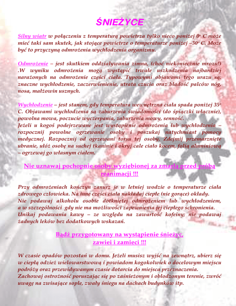 ŚNIEŻYCE Silny wiatr w połączeniu z temperaturą powietrza tylko nieco poniżej 0o C może mieć taki sam skutek, jak stojące powietrze o temperaturze poniżej –30o C. Może być to przyczyną odmrożenia wychłodzenia organizmu. Odmrożenie – jest skutkiem oddziaływania zimna, (choć niekoniecznie mrozu!) .W wyniku odmrożenia mogą wystąpić trwałe uszkodzenia najbardziej narażonych na odmrożenie części ciała. Typowymi objawami tego urazu są: znaczne wychłodzenie, zaczerwienienie, utrata czucia oraz bladość palców nóg, nosa, małżowin usznych. Wychłodzenie – jest stanem, gdy temperatura wewnętrzna ciała spada poniżej 35o C. Objawami wychłodzenia są zaburzenia świadomości (do śpiączki włącznie), powolna mowa, poczucie wyczerpania, zaburzenia mowy, senność. Jeżeli u kogoś podejrzewane jest wystąpienie odmrożenia lub wychłodzenia – rozpocznij powolne ogrzewanie osoby i poszukaj natychmiast pomocy medycznej. Rozpocznij od ogrzewani torsu tej osoby. Zdejmij przemarznięte ubranie, ułóż osobę na suchej tkaninie i okryj cale ciało kocem, folią aluminiową – ogrzewaj go własnym ciałem. Nie uznawaj pochopnie osoby wyziębionej za zmarłą przed próbą reanimacji !!! Przy odmrożeniach kończyn zanurz je w letniej wodzie o temperaturze ciała zdrowego człowieka. Na inne części ciała nakładaj ciepłe (nie gorące) okłady. Nie podawaj alkoholu osobie dotkniętej odmrożeniem lub wychłodzeniem, a w szczególności gdy nie ma możliwości zapewnienia jej ciepłego schronienia. Unikaj podawania kawy – ze względu na zawartość kofeiny; nie podawaj żadnych leków bez dodatkowych wskazań. Bądź przygotowany na wystąpienie śnieżyc, zawiei i zamieci !!! W czasie opadów pozostań w domu. Jeżeli musisz wyjść na zewnątrz, ubierz się w ciepłą odzież wielowarstwową i powiadom kogokolwiek o docelowym miejscu podróży oraz przewidywanym czasie dotarcia do miejsca przeznaczenia. Zachowaj ostrożność poruszając się po zaśnieżonym i oblodzonym terenie, zwróć uwagę na zwisające sople, zwały śniegu na dachach budynków itp. Jazda samochodem w zimie Jedną z wielu przyczyn ofiar śmiertelnych wśród podróżnych w zimie jest niewłaściwe przygotowanie pojazdu do sezonu zimowego oraz brak znajomości postępowania na wypadek unieruchomienia pojazdu lub zabłądzenia podczas podróżowania. Dlatego też, aby bezpiecznie podróżować: Sprawdź następujące elementy Twojego samochodu: • akumulator; • płyn chłodzący; • wycieraczki i płyn do spryskiwacza szyb; • układ zapłonowy, termo – start; • oświetlenie pojazdu; • światła awaryjne, układ wydechowy; • układ ogrzewania, hamulce; • odmrażacz; • poziom oleju (jeśli potrzeba, wymienić na olej zimowy). Załóż zimowe opony i upewnij się, czy mają odpowiedni bieżnik. Uniwersalne opony radialne zazwyczaj są odpowiednie do większości warunków zimowych. Jednakże przepisy w niektórych krajach wymagają stosowania opon z łańcuchami lub opon śniegowych z kolcami. Miej przygotowana skrobaczkę do szyb oraz narzędzie do usuwania śniegu. Utrzymuj, co najmniej połowę pojemności zbiornika paliwa w czasie zimy. Starannie planuj długie podróże. Słuchaj komunikatów radiowych o aktualnych warunkach pogodowych. Podróżuj w ciągu dnia tj., jeśli to możliwe, w towarzystwie przynajmniej jednej osoby. W czasie burzy śniegowej staraj się korzystać z komunikacji publicznej. Ubieraj się ciepło. Noś odzież wielowarstwową, lekko dopasowaną. Na czas dłuższej podróży przygotuj wysokoenergetyczne, suche pożywienie oraz kilka butelek wody. Miej w swoim samochodzie: • • • • • • • • • • migające światło przenośne z zapasowymi bateriami; apteczkę pierwszej pomocy oraz niezbędne leki; śpiwór lub koc; torby plastikowe (do celów sanitarnych): zapałki; małą łopatkę – saperkę; podręczne narzędzia – szczypce uniwersalne, klucz nastawny, śrubokręt; przewody do rozruchu silnika; łańcuchy i siatki do opon; jaskrawą tkaninę do użycia jako flagę sygnalizacyjną. Jeśli utknąłeś w drodze!!! Jedną z wielu przyczyn ofiar śmiertelnych wśród podróżnych w zimie jest niewłaściwe przygotowanie pojazdu do sezonu zimowego oraz brak znajomości postępowania na wypadek unieruchomienia pojazdu lub zabłądzenia podczas podróżowania. Dlatego też, bezpieczniej podróżować: Pozostań w samochodzie. Nie szukaj sam pomocy, chyba, że pomoc jest widoczna w odległości 100 m. Umocuj na antenie lub dachu samochodu jaskrawą część ubrania (najlepiej koloru czerwonego) tak, aby była widoczna dla ratowników. Użyj wszelkich dostępnych środków do poprawienia izolacji samochodu. Uruchamiaj silnik, co godzinę na 10 minut. W czasie pracy silnika włącz ogrzewanie oraz zewnętrzne światła samochodu. Zachowaj ostrożność z uwagi na trujące działanie tlenku węgla w spalinach, utrzymuj rurę wydechową wolną od śniegu oraz dla wentylacji lekko uchyl okna. Zwracaj uwagę na oznaki odmrożeń lub wychłodzenia organizmu. Wykonuj lekkie ćwiczenia dla utrzymania krążenia krwi. Od czasu do czasu klaszcz w dłonie, wykonuj wymachy ramionami. Staraj się nie przebywać w jednej pozycji zbyt długo. Jeśli w samochodzie jest więcej niż jedna osoba, należy spać kolejno na zmianę.