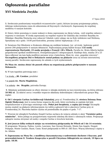 Ogłoszenia parafialne XVI Niedziela Zwykła 17 lipca 2016 1. Serdecznie pozdrawiamy wszystkich wczasowiczów i gości, którym życzymy przyjemnego pobytu, dobrego wykorzystania czasu do odnowienia sił fizycznych i duchowych. Zapraszamy do wspólnej modlitwy w naszym kościele. 2. Dzieci, które pozostają w czasie wakacji w domu zapraszamy na Akcję Letnią, czyli wspólne zabawy i wyprawy w nieznane. W środę zapraszamy na wspólne wyjście do Gdańska aby zwiedzić Bazylikę św. Mikołaja i Bazylikę Mariacką oraz zobaczyć Gdańsk z góry udając się na Koło widokowe nad Motławą. Spotykamy się o godz. 10:00 pod Kościołem, prosimy zabrać legitymację i 25 zł. 3. Światowe Dni Młodzieży w Krakowie zbliżają się wielkimi krokami. Już od środy będziemy gościć prawie 200 pielgrzymów w naszym dekanacie. Najliczniejszą grupą będzie licząca 132 osoby reprezentacja Martyniki. 23 osoby przyjadą z Francji i 28 z Włoch. Parafia św. Brata Alberta będzie gospodarzem spotkań modlitewnych, ewangelizacyjnych i integracyjnych. Każdego dnia, między 20 a 25 lipca odbywać się tam będą modlitwy poranne wraz z katechezą, Msze św. oraz „pogodne wieczory”. Szczegółowy program Dni w Dekanacie został podany na plakacie (oraz na stronie internetowej naszej parafii). Serdecznie zapraszamy do udziału w tych wydarzeniach. Po Mszy św. można złożyć do puszek ofiarę na organizację pobytu pielgrzymów w naszym Dekanacie. 4. W tym tygodniu patronują nam : * w środę - Bł. Czesław, prezbiter * w piątek św. Maria Magdalena. * w sobotę - św. Brygida, patronka Europy. 5. Składamy podziękowanie za ofiary złożone w ubiegłą niedzielę na tacę inwestycyjną, na którą zebrano 10 902 zł. Za dobroć serca i wszelkie wsparcie składamy dobrodziejom i ofiarodawcom gorące Bóg zapłać. 6. Od 1 sierpnia Caritas Archidiecezji Gdańskiej ,przy ul. Fromborskiej 24, otwiera Dzienny Dom Opieki Medycznej. Jest to nowa forma wsparcia dla osób, które wychodzą ze szpitala lub były hospitalizowane w przeciągu ostatniego roku. Pobyt jest bezpłatny, a zapisy już trwają! Szczegóły można znaleźć na plakacie informacyjnym (na tablicy ogłoszeń) lub w placówce Caritas przy ul. Fromborskiej 24. Placówka będzie czynna od poniedziałku do piątku w godz. 7-17. 7. Wzorem lat ubiegłych Parafialny Zespół Caritas zachęca do wzięcia udziału w akcji "Tornister pełen uśmiechu", która polega na przygotowaniu wyprawki szkolnej dla dzieci z uboższych rodzin. Propozycje zakupów można otrzymać od osoby z zespołu Caritas w kruchcie kościoła. 8. Jest jeszcze kilka wolnych miejsc na wrześniową pielgrzymkę do Włoch od 3 do 14 września. W programie: Wenecja, Padwa, Loreto, Lanciano, San Giovani Rotondo, Monte San Angelo, Neapol, Pompeje, Monte Cassino, Rzym, Casia. Koszt pielgrzymki to 900 zł i 385 Euro. Więcej informacji i zapisy u ks. Adama. 9. Zapraszamy na Mszę Św. z modlitwą charyzmatyczną o uzdrowienie duchowe i fizyczne, pod przewodnictwem O. Teodora Knapczyka w parafii Chrystusa Odkupiciela we wtorek, 19 lipca na godz. 18:30. 10. Po Mszy świętej do nabycia jest prasa katolicka: Gość Niedzielny oraz Niedziela 11 .W minionym tygodniu odeszli : Władysław Bykowicz, lat 79 i Janusz Andrzejewski, lat 64 Naszych drogich zmarłych, Ks. Jerzego, budowniczych i dobrodziejów naszego kościoła oraz zmarłych z naszych rodzin polećmy teraz Bożemu miłosierdziu: wieczny odpoczynek racz im dać Panie. Parafian udających się na zasłużony urlop polecamy opiece Matki Bożej Fatimskiej i wszystkim obecnym na tej Eucharystii życzymy radosnego wypoczynku. ZAPROSZENIE METROPOLITY GDAŃSKIEGO DO UDZIAŁU W ARCHIDIECEZJALNYCH OBCHODACH ŚWIATOWYCH DNI MŁODZIEŻY Drodzy bracia i siostry! Przed nami pierwszy - diecezjalny etap Światowych Dni Młodzieży. W najbliższych dniach do parafii naszej Archidiecezji przybędą pielgrzymi z wielu krajów świata. To będzie niezwykły czas; czas spotkania z młodym Kościołem powszechnym, który wypełnią wspólne katechezy, modlitwy i Eucharystie, a wszystko to w atmosferze chrześcijańskiej radości. Spotkania te przygotują nas wszystkich na centralne obchody Światowych Dni Młodzieży, które odbędą się z udziałem Ojca Świętego Franciszka w Krakowie. Jedni z nas będą w nich uczestniczyć osobiście, a pozostali za pośrednictwem mediów. Pragnę serdecznie zaprosić wszystkich na główny dzień naszego lokalnego świętowania, które odbędzie się w sobotę, 23 lipca br. w Gdańsku. Rozpoczniemy je o godz. 9.30 na Placu Solidarności programem ewangelizacyjnym i Litanią Narodów. Następnie w Korowodzie Świętych przejdziemy do Bazyliki Mariackiej. Gorąco zachęcam, abyśmy uczestniczyli w Korowodzie przebrani za swoich Świętych i Błogosławionych Patronów. Centralnym punktem tego dnia będzie uroczysta Msza Święta, którą będziemy sprawowali o godz. 12.00 w Bazylice Mariackiej i podczas której odnowimy nasze przyrzeczenia chrzcielne z okazji 1050. rocznicy Chrztu Polski. Po Mszy Świętej nastąpi przejście na Plac Zebrań Ludowych, gdzie odbędzie się wielki Festiwal Młodych. Serdecznie zachęcam do udziału w tym szczególnym święcie wiary! Szczególne zaproszenie kieruję do kapłanów, osób konsekrowanych, do członków ruchów, stowarzyszeń i grup duszpasterskich, a przede wszystkim do wszystkich młodych. Już dziś dziękuję wszystkim, którzy podjęli trud organizacji tych dni. Módlmy się, by tegoroczne Światowe Dni Młodzieży przeżywane w Roku Miłosierdzia wydały błogosławione owoce. /-/ + Sławoj Leszek Głódź Arcybiskup Metropolita Gdański