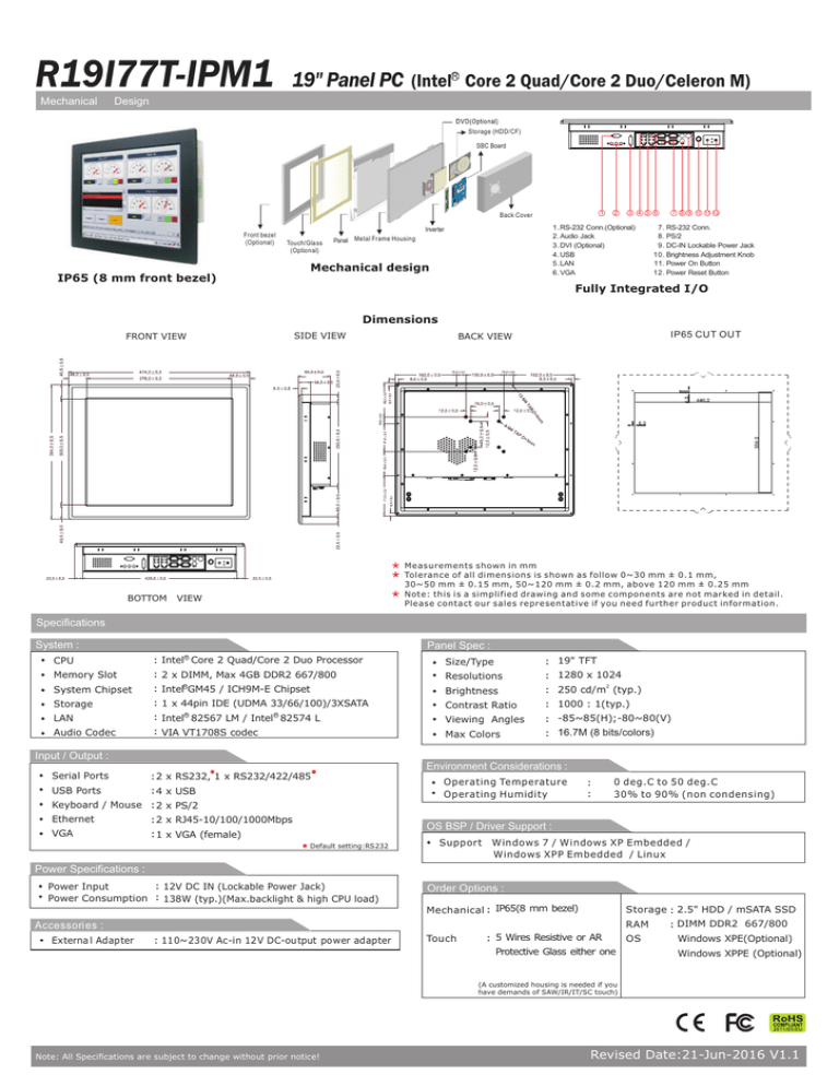 R19I77T-IPM1 Mechanical 19" Panel PC (Intel Core 2 Quad/Core 2 Duo/Celeron M) R Design Storage (HDD/CF) SBC Board 1 Back Cover Front bezel (Optional) Touch/Glass (Optional) 2 3 4 5 6 1. RS-232 Conn.(Optional) 2. Audio Jack 3. DVI (Optional) 4. USB 5. LAN 6. VGA Inverter Panel Metal Frame Housing Mechanical design IP65 (8 mm front bezel) 7 8 9 10 11 12 7. RS-232 Conn. 8. PS/2 9. DC-IN Lockable Power Jack 10. Brightness Adjustment Knob 11. Power On Button 12. Power Reset Button Fully Integrated I/O Dimensions FRONT VIEW BOTTOM SIDE VIEW IP65 CUT OUT BACK VIEW Measurements shown in mm * Tolerance dimensions is shown as follow 0~30 mm ± 0.1 mm, * 30~50 mmof±all0.15 mm, 50~120 mm ± 0.2 mm, above 120 mm ± 0.25 mm Note: this is a simplified drawing and some components are not marked in detail. * Please contact our sales representative if you need further product information. VIEW Specifications System : Panel Spec : CPU : Intel R Core 2 Quad/Core 2 Duo Processor Size/Type : 19" TFT Memory Slot : 2 x DIMM, Max 4GB DDR2 667/800 Resolutions : 1280 x 1024 System Chipset : IntelR GM45 / ICH9M-E Chipset : 1 x 44pin IDE (UDMA 33/66/100)/3XSATA Brightness 2 : 250 cd/m (typ.) Contrast Ratio : 1000 : 1(typ.) : Intel R 82567 LM / Intel R 82574 L : VIA VT1708S codec Viewing Angles : -85~85(H);-80~80(V) Max Colors : 16.7M (8 bits/colors) Storage LAN Audio Codec Input / Output : Environment Considerations : Serial Ports : 2 x RS232, 1 x RS232/422/485 USB Ports : 4 x USB Operating Temperature Operating Humidity : : 0 deg.C to 50 deg.C 30% to 90% (non condensing) Keyboard / Mouse : 2 x PS/2 Ethernet : 2 x RJ45-10/100/1000Mbps VGA : 1 x VGA (female) OS BSP / Driver Support : Default setting:RS232 Support Windows 7 / Windows XP Embedded / Windows XPP Embedded / Linux Power Specifications : : 12V DC IN (Lockable Power Jack) Power Input Power Consumption : 138W (typ.)(Max.backlight & high CPU load) Order Options : Mechanical : IP65(8 mm bezel) Storage : 2.5" HDD / mSATA SSD RAM Accessori es : Externa l Adapter : 110~230V Ac-in 12V DC-output power adapter Touch : 5 Wires Resistive or AR Protective Glass either one OS : DIMM DDR2 667/800 Windows XPE(Optional) Windows XPPE (Optional) (A customized housing is needed if you have demands of SAW/IR/IT/SC touch) Note: All Specifications are subject to change without prior notice! Revised Date:21-Jun-2016 V1.1
