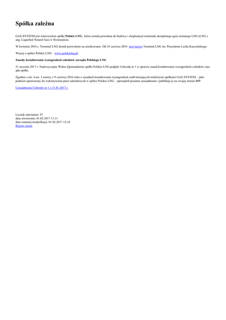 Spółka zależna GAZ-SYSTEM jest właścicielem spółki Polskie LNG, która została powołana do budowy i eksploatacji terminalu skroplonego gazu ziemnego LNG (LNG z ang. Liquefied Natural Gas) w Świnoujściu. W kwietniu 2016 r. Terminal LNG dostał pozwolenie na użytkowanie. Od 18 czerwca 2016 nosi nazwę Terminal LNG im. Prezydenta Lecha Kaczyńskiego. Więcej o spółce Polskie LNG – www.polskielng.pl. Zasady kształtowania wynagrodzeń członków zarządu Polskiego LNG 31 stycznia 2017 r. Nadzwyczajne Walne Zgromadzenie spółki Polskie LNG podjęło Uchwałę nr 1 w sprawie zasad kształtowania wynagrodzeń członków zarz ądu spółki. Zgodnie z art. 4 ust. 3 ustawy z 9 czerwca 2016 roku o zasadach kształtowania wynagrodzeń osób kierujących niektórymi spółkami GAZ-SYSTEM – jako podmiot uprawniony do wykonywania praw udziałowych w spółce Polskie LNG – sporządził pisemne uzasadnienie i publikuje je na swojej stronie BIP. Uzasadnienie Uchwały nr 1 z 31.01.2017 r. Licznik odwiedzin: 97 data utworzenia: 01.02.2017 11:11 data ostatniej modyfikacji: 01.02.2017 12:10 Rejestr zmian
