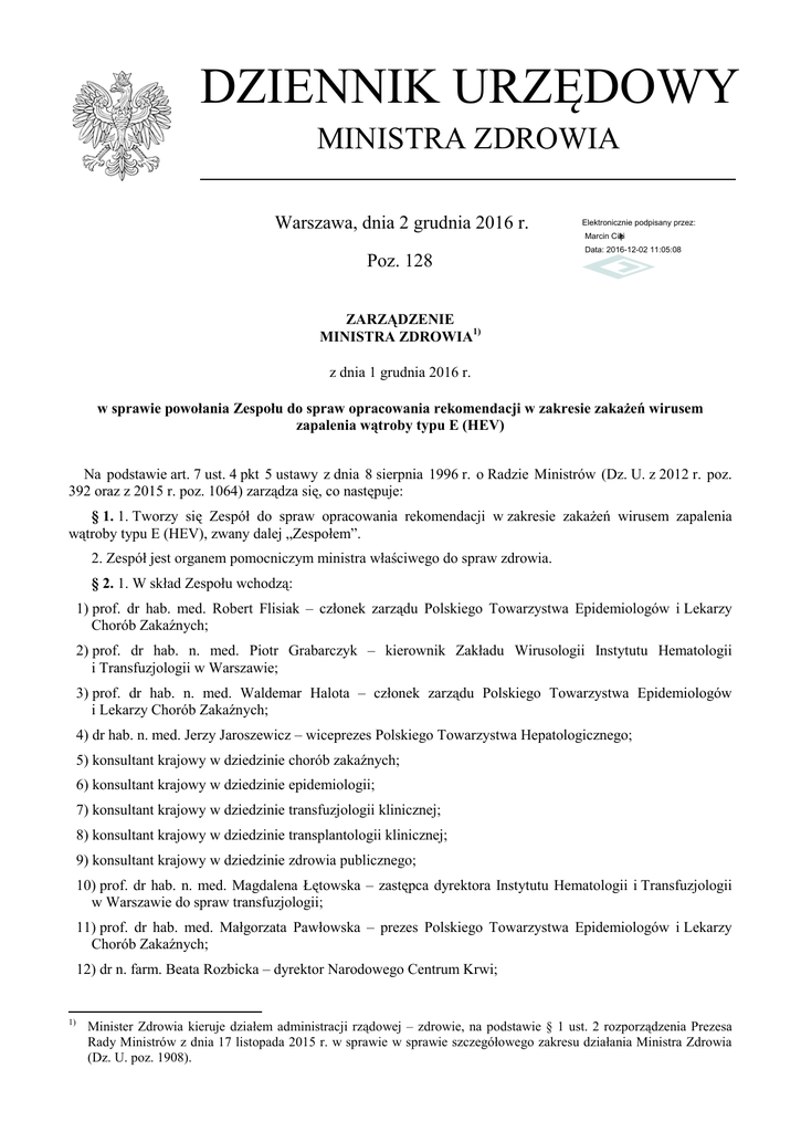 DZIENNIK URZĘDOWY MINISTRA ZDROWIA Warszawa, dnia 2 grudnia 2016 r. Elektronicznie podpisany przez: Marcin Ciężki Poz. 128 Data: 2016-12-02 11:05:08 ZARZĄDZENIE MINISTRA ZDROWIA1) z dnia 1 grudnia 2016 r. w sprawie powołania Zespołu do spraw opracowania rekomendacji w zakresie zakażeń wirusem zapalenia wątroby typu E (HEV) Na podstawie art. 7 ust. 4 pkt 5 ustawy z dnia 8 sierpnia 1996 r. o Radzie Ministrów (Dz. U. z 2012 r. poz. 392 oraz z 2015 r. poz. 1064) zarządza się, co następuje: § 1. 1. Tworzy się Zespół do spraw opracowania rekomendacji w zakresie zakażeń wirusem zapalenia wątroby typu E (HEV), zwany dalej „Zespołem”. 2. Zespół jest organem pomocniczym ministra właściwego do spraw zdrowia. § 2. 1. W skład Zespołu wchodzą: 1) prof. dr hab. med. Robert Flisiak – członek zarządu Polskiego Towarzystwa Epidemiologów i Lekarzy Chorób Zakaźnych; 2) prof. dr hab. n. med. Piotr Grabarczyk – kierownik Zakładu Wirusologii Instytutu Hematologii i Transfuzjologii w Warszawie; 3) prof. dr hab. n. med. Waldemar Halota – członek zarządu Polskiego Towarzystwa Epidemiologów i Lekarzy Chorób Zakaźnych; 4) dr hab. n. med. Jerzy Jaroszewicz – wiceprezes Polskiego Towarzystwa Hepatologicznego; 5) konsultant krajowy w dziedzinie chorób zakaźnych; 6) konsultant krajowy w dziedzinie epidemiologii; 7) konsultant krajowy w dziedzinie transfuzjologii klinicznej; 8) konsultant krajowy w dziedzinie transplantologii klinicznej; 9) konsultant krajowy w dziedzinie zdrowia publicznego; 10) prof. dr hab. n. med. Magdalena Łętowska – zastępca dyrektora Instytutu Hematologii i Transfuzjologii w Warszawie do spraw transfuzjologii; 11) prof. dr hab. med. Małgorzata Pawłowska – prezes Polskiego Towarzystwa Epidemiologów i Lekarzy Chorób Zakaźnych; 12) dr n. farm. Beata Rozbicka – dyrektor Narodowego Centrum Krwi; 1) Minister Zdrowia kieruje działem administracji rządowej – zdrowie, na podstawie § 1 ust. 2 rozporządzenia Prezesa Rady Ministrów z dnia 17 listopada 2015 r. w sprawie w sprawie szczegółowego zakresu działania Ministra Zdrowia (Dz. U. poz. 1908). Dziennik Urzędowy Ministra Zdrowia –2– Poz. 128 13) dr n. med. Małgorzata Sadkowska-Todys – kierownik Zakładu Epidemiologii Narodowego Instytutu Zdrowia Publicznego – Państwowego Zakładu Higieny. 2. W pracach Zespołu, w zależności od potrzeb, mogą uczestniczyć również inne osoby niebędące jego członkami, zaproszone przez Przewodniczącego. 3. Osoby, o których mowa w ust. 1 pkt 1-4, 10, 11 i 13, wyrażają pisemną zgodę na udział w pracach Zespołu. 4. Przewodniczący, po uzyskaniu zgody Zespołu, może powoływać ekspertów i zlecać im zadania albo zlecać im sporządzenie opinii i analiz potrzebnych do prac Zespołu. Z powołanym w tym trybie ekspertem dyrektor Narodowego Centrum Krwi, zwanego dalej „NCK”, zawiera umowę cywilnoprawną na realizację zleconych zadań albo sporządzenie opinii i analiz. § 3. 1. Przedmiotem prac Zespołu jest analiza aktualnej sytuacji epidemiologicznej oraz opracowanie rekomendacji w zakresie profilaktyki zakażeń wirusem zapalenia wątroby typu E (HEV) ze szczególnym uwzględnieniem krwiodawstwa i krwiolecznictwa oraz transplantologii. 2. Przewodniczący, po zakończeniu prac Zespołu, nie później jednak, niż do dnia 30 czerwca 2017 r., przekaże ministrowi właściwemu do spraw zdrowia, rekomendacje, o których mowa w ust. 1, w postaci pisemnej. § 4. 1. Pracami Zespołu kieruje Przewodniczący. 2. Do zadań Przewodniczącego należy w szczególności: 1) zwoływanie i prowadzenie posiedzeń Zespołu; 2) planowanie i organizowanie pracy Zespołu; 3) ustalanie porządku dziennego posiedzenia Zespołu; 4) reprezentowanie Zespołu na zewnątrz; 5) określanie sposobu i terminów pracy Zespołu; 6) powoływanie grup roboczych w celu realizacji zadań określonych przez Przewodniczącego; 7) wskazywanie osób odpowiedzialnych za wykonanie zadań Zespołu; 8) powoływanie ekspertów zgodnie z § 2 ust. 4; 9) informowanie ministra właściwego do spraw zdrowia o bieżącej działalności Zespołu. 3. W przypadku nieobecności Przewodniczącego, jego zadania wykonuje Zastępca Przewodniczącego, a w przypadku ich nieobecności, wyznaczony przez Przewodniczącego członek Zespołu. § 5. 1. Zespół obraduje na posiedzeniach, które odbywają się w NCK. 2. Posiedzenia Zespołu zwołuje Przewodniczący, uprzednio powiadamiając o planowanym terminie posiedzenia dyrektora NCK. 3. Z posiedzenia Zespołu sporządza się protokół. Protokół sporządza Sekretarz, a w przypadku jego nieobecności – członek Zespołu wyznaczony przez Przewodniczącego. 4. Protokół podpisuje Przewodniczący oraz osoba sporządzająca protokół. § 6. 1. Zespół podejmuje decyzje w formie uchwał, zwykłą większością głosów w obecności co najmniej połowy członków Zespołu. 2. Głosowania są jawne. 3. W przypadku równej liczby głosów, decyduje głos Przewodniczącego. 4. Zespół może rozstrzygać poszczególne kwestie w drodze korespondencyjnego uzgodnienia stanowisk za pośrednictwem poczty elektronicznej. 5. NCK jest obowiązane do przesłania członkom Zespołu, w terminie 5 dni roboczych od dnia otrzymania albo opracowania, za pośrednictwem poczty elektronicznej, protokołu z ustaleniami Zespołu z ostatniego posiedzenia Zespołu. Dziennik Urzędowy Ministra Zdrowia –3– Poz. 128 § 7. 1. Z tytułu wykonywania zadań Zespołu jego członkom nie przysługuje wynagrodzenie. 2. Osobom, o których mowa w § 2 ust. 1 pkt 1-11 i 13, oraz osobom, o których mowa w § 2 ust. 2 i 4, przysługuje zwrot kosztów podróży na terenie kraju, w związku z udziałem w posiedzeniach Zespołu, na zasadach określonych w rozporządzeniu Ministra Pracy i Polityki Społecznej z dnia 29 stycznia 2013 r. w sprawie wysokości oraz warunków ustalania należności przysługujących pracownikowi zatrudnionemu w państwowej lub samorządowej je