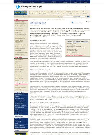 startuj z nami dodaj do ulubionych mapa serwisu Prawo | Publikacje | Konferencje | Szkolenia | Katalog stron WWW | Hosting i domeny | Media Nieruchomości | Opinie | Sklep komputerowy | Grupy dyskusyjne | Sklepy internetowe | Książki Dzi ś jest Czwartek, 29 kwietnia 2010r. Praca w eGospodarka .pl Szukaj : 6 strona główna › Praca › Porady dla pracownika › Jak szuka ć pracy? A+ Oferty pracy - Polska Porady dla pracodawcy Jak szukać pracy? Porady dla pracownika 29.04.2010, 13:31 Sprawdź zarobki Wydaje Ci się, że wiesz wszystko o tym, jak szukać pracy? Na wszelki wypadek sprawdź, co radzi Aleksandra Wierbiłowicz-Bielecka, ekspertka ds. rekrutacji agencji Work Express. Pani Aleksandra, Wynagrodzenia Kodeks pracy na podstawie swoich doświadczeń zawodowych stworzyła "Dekalog rekrutera", czyli 10 naważniejszych zasad dotyczących tego, gdzie i jak szukać pracy oraz jak uniknąć błędów Artykuły z Prawa pracy popełnianych często przez kandydatów. "Dekalog" zosta ł ułożony według ważności Kalkulator wynagrodzeń (kalkulator płacowy) poszczególnych zagadnień. Kalkulator umów opodatkowanych ryczałtem Szukanie pracy to proces Kalkulator wynagrodzenia (płac) brutto-netto oczekiwań podczas poszukiwania pracy. – Osoby szukające pracy często nie zdają sobie sprawy, że jest to długi proces, któremu trzeba po święcić dużo pracy i czasu. Zależnie od Kalkulator stażu pracy Szablony CV List motywacyjny szablony Dodaj ofertę pracy Forum Firma A– Umowy, dokumenty, formularze Dlatego pierwszy punkt dotyczy kwestii nastawienia i branży, w której chcemy pracowa ć, trwa średnio, od 3 do 6 miesięcy – mówi Aleksandra Wierbiłowicz-Bielecka z Work Express. Biorąc pod uwag ę, że sam proces rekrutacji w firmie (np. na stanowisko średniego szczebla) trwa często kilka tygodni, musimy się uzbroić w cierpliwość i wysłać CV - umowa o prac ę umowa zlecenie kwestionariusz osobowy wypowiedzenie umowy o prac ę świadectwo pracy wezwanie do zap łaty pisma procesowe zobacz wszystkie szablony » do więcej niż kilku potencjalnych pracodawców. Start działalności Księgowość Pracownicy i Wynagrodzenia Urząd/Kontrola Programy dla firmy Tym czego nie znosz ą rekruterzy i co może dać nam duży „minus” na rozmowie o pracę, jest pytanie na końcu spotkania „czy przeszedłem”. – Rekruter nie wie, jaki będzie kolejny kandydat, który przyjdzie na rozmowę, więc nie jest w stanie udzielić na nie odpowiedzi. W dobrym tonie jest wi ęc poczekać do końca terminu wyznaczonego na odpowied ź przez pracodawcę i zapytać dopiero wtedy – mówi ekspertka Work Express. Gdzie szukać, czyli: siła referencji Reklama i PR Obsługa klienta Auto w firmie Dotacje UE i inne Kolejną ważną kwestią, z której wiele osób nie zdaje sobie sprawy jest to, gdzie szuka ć pracy. Okazuje się, że ogłoszenia w prasie i internecie, po które si ęgamy najczęściej na początku, wcale nie są tą najskuteczniejszą, a jedynie najbardziej znaną metod ą. – Dwie trzecie ofert pracy nigdy nie zostaje opublikowane. Dlatego, szukając pracy, warto pyta ć znajomych o to, czy ich firma nie poszukuje kogo ś na stanowisko, na którym Edukacja chcemy pracować – mówi Aleksandra Wierbiłowicz-Bielecka. Pracownik „z polecenia” to korzyść dla obu stron: pracodawca wie, że taki pracownik będzie bardziej się starał, gdyż nie chce zawieść zaufania osoby polecającej. Praca - pośrednictwo Z kolei kandydat wie, że trafia do firmy, którą poleca mu zaufana osoba. Au Pair Doradztwo Personalne e-Rekrutacja Twoje narzędzia Ważne jest, byśmy mieli maksymalnie skonkretyzowane oczekiwania. Osoba, która nie ma jasnej wizji swojej pracy na stanowisku, o które się stara, czy wręcz nie wie, czego chce, nie robi dobrego wrażenia na przyszłym pracodawcy – dodaje Aleksandra Wierbiłowicz-Bielecka. Zanim zaczniemy szukać pracy, warto przeanalizować swoje zawodowe atuty i oczekiwania i aplikować na takie stanowiska, na których rzeczywiście chcemy pracować. Niezbędnik firmowy Kalkulatory Wzory dokumentów Motywacja do pracy, to jedno z najwyżej ocenianych przez rekrutera kryteriów. Im bardziej będziemy mieli zaplanowane to, co chcemy osi ągnąć na danym stanowisku, tym bardziej przekonujący będziemy na rozmowie o pracę – mówi ekspertka Work Express. Baza adresowa firm Urzędy skarbowe Newsy na Twoją stronę Firmy zlikwidowane Znajdź pracę Znajdź przetarg Znajdź providera Zakupy i usługi Załóż e-sklep Tani hosting Książki Sklep komputerowy Projektowanie WWW Nie wysyłaj CV na oślep, czyli: jakość, a nie ilość Choć powinniśmy próbować swoich sił i starać się o pracę w wielu miejscach jednocze śnie, nie warto wysyłać swojej aplikacji „na oślep”. Pamiętaj, że swoje CV i list motywacyjny wysyłasz do konkretnej osoby, a nie do „maszyny”. – Nic tak nie zraża pracodawcy, jak widok kilkudziesięciu firm wpisanych w pasku adresu odbiorcy maila. „Sztampowe ” aplikacje, a szczególnie listy motywacyjne przygotowane według szablonu to prawdziwy „koszmar” rekrutera. Kiedy pracodawca widzi, że ten sam list poszedł do kilkunastu, czy kilkudziesięciu firm, trudno potem b ędzie nam go przekonać, że to właśnie to jedno miejsce pracy jest naszym „wymarzonym” – mówi Aleksandra Wierbiłowicz-Bielecka. Pamiętajmy też, że przesyłamy oficjalny dokument, który ktoś widzi. Niedopuszczalne jest tytułowanie CV np. „Superfajna Kasia”, czy też nazwą agencji, do której wysyłamy aplikację. To ostatnie sugeruje, że wysłaliśmy wiele CV naraz – dodaje Wierbiłowicz-Bielecka. Radzi, by szukając pracy wyjść poza „ramę” gazet i portali internetowych i zacząć myśleć kreatywnie. Jak? Przede wszystkim zastanowić się, gdzie możemy sami szukać pracy, która nas interesuje i odpowiada naszym kwalifikacjom. Np. jeździć na specjalistyczne targi, czy wystawy i tam nawiązywać k