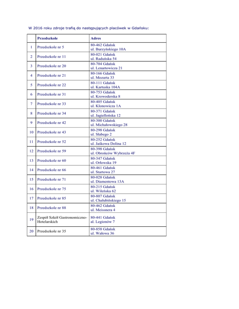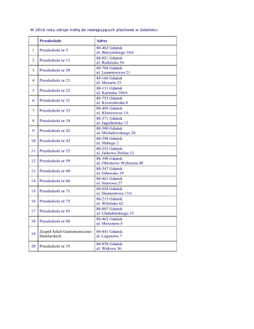 W 2016 roku zdroje trafią do następujących placówek w Gdańsku: Przedszkole 1 Przedszkole nr 5 2 Przedszkole nr 11 3 Przedszkole nr 20 4 Przedszkole nr 21 5 Przedszkole nr 22 6 Przedszkole nr 31 7 Przedszkole nr 33 8 Przedszkole nr 34 9 Przedszkole nr 42 10 Przedszkole nr 43 11 Przedszkole nr 52 12 Przedszkole nr 59 13 Przedszkole nr 60 14 Przedszkole nr 66 15 Przedszkole nr 71 16 Przedszkole nr 75 17 Przedszkole nr 85 18 Przedszkole nr 88 19 Adres 80-462 Gdańsk ul. Burzyńskiego 10A 80-021 Gdańsk ul. Raduńska 54 80-704 Gdańsk ul. Lenartowicza 21 80-166 Gdańsk ul. Mozarta 33 80-111 Gdańsk ul. Kartuska 104A 80-753 Gdańsk ul. Krowoderska 8 80-405 Gdańsk ul. Klonowicza 1A 80-371 Gdańsk ul. Jagiellońska 12 80-300 Gdańsk ul. Michałowskiego 28 80-298 Gdańsk ul. Słabego 2 80-252 Gdańsk ul. Jaśkowa Dolina 12 80-398 Gdańsk ul. Obrońców Wybrzeża 4F 80-347 Gdańsk ul. Orłowska 19 80-461 Gdańsk ul. Startowa 27 80-028 Gdańsk ul. Diamentowa 13A 80-215 Gdańsk ul. Wileńska 62 80-807 Gdańsk ul. Chałubińskiego 15 80-462 Gdańsk ul. Meissnera 4 Zespół Szkół Gastronomiczno- 80-441 Gdańsk Hotelarskich al. Legionów 7 20 Przedszkole nr 35 80-858 Gdańsk ul. Wałowa 36