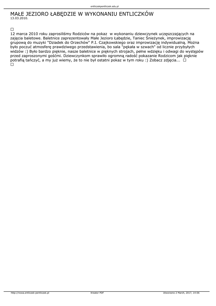 entliczekpentliczek.edu.pl MAŁE JEZIORO ŁABĘDZIE W WYKONANIU ENTLICZKÓW 13.03.2010. 12 marca 2010 roku zaprosiliśmy Rodziców na pokaz w wykonaniu dziewczynek uczęszczających na zajęcia baletowe. Baletnice zaprezentowały Małe Jezioro Łabędzie, Taniec Śnieżynek, improwizację grupową do muzyki "Dziadek do Orzechów" P.I. Czajkowskiego oraz improwizację indywidualną. Można było poczuć atmosferę prawdziwego przedstawienia, bo sala "pękała w szwach" od licznie przybyłych widzów :) Było bardzo pięknie, nasze baletnice w pięknych strojach, pełne wdzięku i odwagi do występów przed zaproszonymi gośćmi. Dziewczynkom sprawiło ogromną radość pokazanie Rodzicom jak pięknie potrafią tańczyć, a my już wiemy, że to nie był ostatni pokaz w tym roku :) Zobacz zdjęcia... http://nowa.entliczek-pentliczek.pl Kreator PDF Utworzono 2 March, 2017, 14:06