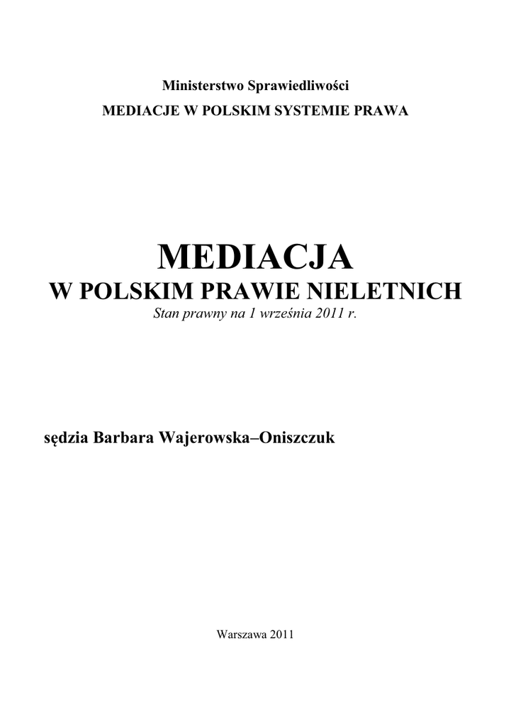 Ministerstwo Sprawiedliwości MEDIACJE W POLSKIM SYSTEMIE PRAWA MEDIACJA W POLSKIM PRAWIE NIELETNICH Stan prawny na 1 września 2011 r. sędzia Barbara Wajerowska–Oniszczuk Warszawa 2011 Spis treści str. 1. Wprowadzenie 2. Definicja i podstawowe zasady mediacji 3. Korzyści mediacji 4. Kierowanie spraw do mediacji w postępowaniu w sprawach nieletnich Bibliografia Wydawca: Ministerstwo Sprawiedliwości 00-950 Warszawa, Al. Ujazdowskie 11 Redakcja: Justyna Cudna-Wilk Jacek Toporowski ISBN 978-83-933364-7-0 © Copyright by Ministerstwo Sprawiedliwości Warszawa 2011 Druk i oprawa: Drukarnia Heldruk ul. Partyzantów 3b, 82-200 Malbork tel.(55) 272-74-01 3 4 5 6 11 1. WPROWADZENIE Dyrektywą przewodnią Ustawy o postępowaniu w sprawach nieletnich jest dobro nieletniego. Art. 3 § 1 ustawy mówi, że w sprawie nieletniego należy się przede wszystkim kierować jego dobrem, dążyć do osiągnięcia pozytywnych zmian w osobowości i zachowaniu nieletniego oraz zmierzać w miarę potrzeby do prawidłowego spełniania przez rodziców i opiekuna ich obowiązków wobec nieletniego, uwzględniając przy tym interes społeczny. Pomimo zdecydowanie nie represyjnego charakteru ustawy, w Polsce wśród specjalistów zajmujących się problematyką nieletnich zdecydowanie przeważa przekonanie o konieczności bardzo ostrożnego korzystania z możliwości przewidywanych przez ustawę i unikania prowadzenia postępowania w sprawach nieletnich, jeśli cele wychowawcze można osiągnąć w inny sposób. Z każdym postępowaniem przed sądem wiąże się bowiem niebezpieczeństwo stygmatyzacji nieletniego w jego środowisku jako „przestępcy”, „zdemoralizowanego”, „o złych skłonnościach” itp., co wywiera skutek przeciwny od zamierzonego, niekiedy wręcz wpychając nieletniego w rolę zgodną z tymi określeniami. Nie ulega wątpliwości, iż sąd nie jest najlepszym miejscem do podejmowania działań wychowawczych. Wpływ na taki stan rzeczy ma atmosfera, która panuje na sali rozpraw. Postępowanie wiąże się ze stosowaniem określonych procedur a te niosą ze sobą sztywność, oficjalność. Czas, którym dysponuje sąd na przeprowadzenie postępowania utrudnia nawiązanie właściwego kontaktu z nieletnim, co w konsekwencji może doprowadzić do zastosowania niewłaściwego środka wychowawczego. Art. 6 ustawy o postępowaniu w sprawach nieletnich zawiera katalog środków wychowawczych i poprawczych, które sąd może stosować wobec nieletniego. Są wśród nich środki : x upominawczo korekcyjne /upomnienie, zobowiązania do określonego postępowania/, x nadzory /np. rodziców, kuratora, organizacji młodzieżowej, itp./, x wymagające spędzenia części dnia we wskazanej instytucji /np. kuratorski ośrodek pracy z młodzieżą/, x środki związane ze zmianą środowiska wychowawczego o charakterze wolnościowym i izolacyjnym. Nowelizacja Ustawy o postępowaniu w sprawach nieletnich z dnia 15 września 2000 roku wzmacniając rolę pokrzywdzonego w postępowaniu, w art. 3a dała także sądowi pewien alternatywny sposób reagowania na niepożądane zachowanie nieletniego, wprowadzając możliwość kierowania sprawy do instytucji lub osoby godnej zaufania w celu przeprowadzenia postępowania mediacyjnego. Idea mediacji, jako alternatywa wobec tradycyjnego systemu wymiaru sprawiedliwości stosowana jest w wielu krajach od kilkunastu lat. W Polsce także nie jest już instytucją nową, aczkolwiek zalegalizowaną niedawno. Już w grudniu 1996 roku został opracowany 3 eksperymentalny program mediacji między ofiarą a młodocianym i dorosłym sprawcą przestępstwa. Program był stosowany przez polskie sądy rodzinne i nieletnich 2. DEFINICJA I PODSTAWOWE ZASADY MEDIACJI Nasze prawo nie wskazuje niestety definicji mediacji. Nie precyzuje jej ani ustawa karna, ani cytowana wyżej ustawa. Nie udało jej się także „przemycić” w rozporządzeniach wykonawczych. W ulotce „Mediacja w Polsce” czytamy : „Mediacja to dobrowolne porozumiewanie się ofiary ze sprawcą w obecności osoby neutralnej – mediatora – w celu dojścia do ugody w kwestii zadośćuczynienia pokrzywdzonemu.” Szerzej rozumiana definicja tego procesu sformułowana została przez „Centrum Negocjacji” w Warszawie: „Mediacja to interwencja – w spór lub negocjacje – dokonywana przez akceptowalną, bezstronną, neutralną „trzecią stronę”, czyli mediatora. Nie ma on władzy do podejmowania decyzji merytorycznych. Celem mediacji jest pomoc zwaśnionym stronom w dobrowolnym osiągnięciu ich własnego wzajemnie akceptowalnego porozumienia w kwestach spornych. Mediacja jest procesem dobrowolnym i poufnym.” Definicja ta aczkolwiek szeroka przywołuje w swoim brzmieniu podstawowe zasady mediacji określone Rekomendacją Rady Europy, a które muszą być bezwzględnie przestrzegane na każdym etapie mediacji. x dobrowolność /podkreślana bardzo wyraźnie przez ustawodawcę wola stron udziału w tym procesie, nikt nie ma prawa przymuszać kogokolwiek do przystąpienia do procesu mediacji/, x bezstronność /mediator nie narzuca swojej opinii, nie preferuje żadnej ze stron/, x neutralność /mediatorowi nie wolno narzucać stronom żadnych rozwiązań, nawet wtedy gdy wydają mu się one dla stron najlepsze, strony same wypracowują porozumienie/, x poufność /mediator przekazuje na zewnątrz tylko to co zostanie uzgodnione i na co uzyska zgodę stron, sprawozdanie z mediacji nie obejmuje jego przebiegu obejmuje jedynie wyniki mediacji/, x akceptowalność /wyrażenie przez strony mediacji zgody na konkretnego mediatora, zgodę na tę a nie inną osobę a także zgodę na reguły mediacji/. Słownik PWN określa natomiast mediację jako pośrednictwo, którego celem jest doprowadzenie do ugody między spierającymi się stronami. Osoba, która prowadzi mediację zwana jest mediatorem. Pomimo różnych sformułowań usiłujących uchwycić w „ramkę” instytucję mediacji w każdej definicj