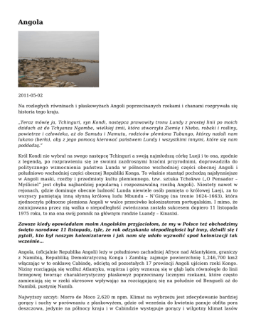 Angola 2011-05-02 Na rozległych równinach i płaskowyżach Angoli poprzecinanych rzekami i chanami rozgrywała się historia tego kraju. „Teraz mówię ja, Tchinguri, syn Kondi, następca prawowity tronu Lundy z prostej linii po moich dzidach aż do Tchyanza Ngombe, wielkiej żmii, która stworzyła Ziemię i Niebo, robaki i rośliny, powietrze i człowieka, aż do Samutu i Namutu, rodziców plemiona Tubungo, którzy nadali nam lukano (berło), aby z jego pomocą kierować państwem Lundy i wszystkimi innymi, które się nam poddadzą.” Król Kondi nie wybrał na swego następcę Tchinguri a swoją najmłodszą córkę Lueji i to ona, zgodnie z legendą, po rozprawieniu się ze swoimi zazdrosnymi braćmi przyrodnimi, doprowadziła do politycznego wzmocnienia państwa Lunda w północno wschodniej części obecnej Angoli i południowo wschodniej części obecnej Republiki Konga. To właśnie stamtąd pochodzą najsłynniejsze w Angoli maski, rzeźby i przedmioty kultu plemiennego, tzw. sztuka Tchokwe („O Pensador – Myśliciel” jest chyba najbardziej popularną i rozpoznawalną rzeżbą Angoli). Niestety nawet w rejonach, gdzie dominuje obecnie ludność Lunda niewiele osób pamięta o królowej Lueji, za to wszyscy pamiętają inną słynną królową ludu Mbundu – N’Gingę (na tronie 1624-1663), która zjednoczyła północne plemiona Angoli w walce przeciwko kolonizatorom portugalskim. I mimo, że zainicjowana przez nią walka o niepodległość zwieńczona została sukcesem dopiero 11 listopada 1975 roku, to ma ona swój pomnik na głównym rondzie Luandy – Kinaxixi. Zawsze kiedy opowiadałam moim Angolskim przyjaciołom, że my w Polsce też obchodzimy święto narodowe 11 listopada, tyle, że rok odzyskania niepodległości był inny, dziwili się i pytali, kto był naszym kolonizatorem i jak nam się udało wyzwolić spod kolonizacji tak wcześnie… Angola, (oficjalnie Republika Angoli) leży w południowo zachodniej Afryce nad Atlantykiem, graniczy z Namibią, Republiką Demokratyczną Konga i Zambią; zajmuje powierzchnię 1,246,700 km2 włączając w to enklawę Cabindę, odciętą od pozostałych 17 prowincji Angoli ujściem rzeki Kongo. Niziny rozciągają się wzdłuż Atlantyku, wzgórza i góry wznoszą się w głąb lądu równolegle do linii brzegowej tworząc charakterystyczny płaskowyż poprzecinany licznymi rzekami, które często zamieniają się w rzeki okresowe wpływając na rozciągającą się na południe od Bengueli aż do Namibii, pustynię Namib. Najwyższy szczyt: Morro de Moco 2,620 m npm. Klimat na wybrzeżu jest zdecydowanie bardziej gorący i suchy w porównaniu z płaskowyżem, gdzie od września do kwietnia panuje obfita pora deszczowa, jedynie na północy kraju i w Cabindzie występuje gorący i wilgotny klimat lasów tropikalnych. Ludność Angoli szacuje się na około 15 milionów, z czego około 5 milionów mieszka w stolicy Luandzie. Większość – 47% – wyznaje wierzenia tradycyjne, 38% wyznaje katolicyzm i 15% to protestanci. Językiem oficjalnym jest portugalski, innymi językami używanymi są języki Bantu, którymi posługuje się ok. 95% ludności. Większość Angolczyków jest pochodzenia Bantu. Najliczniejszą grupą etniczną tego pochodzenia są Ovimbundu (37% ogółu ludności) zamieszkujący centralno – południową część państwa i posługujący się językiem umbundo. Drugą grupą są Mbundu (23%) zamieszkujący centralno – północną część Angoli i mówiący w Kimbundo. Język ten, jako język stolicy i dawnego królestwa N’gola miał wpływ na angolską wersję portugalskiego i sam z niego zapożyczał słownictwo. Na północy skoncentrowane są plemiona Bacongo (13%) ze swoim językiem kikongo, który posiada różnorodne dialekty i który był językiem dawnego Konga. Plemiona Kioko zamieszkują wschód Angoli i posługują się językiem tchokwe, który zdominował inne języki tamtej części państwa. Kwanyama czy nhaneca są innymi językami pochodzenie bantu używanymi w południowej Angoli. Oprócz licznych plemion Bantu i innych (m.in. na południu Buszmeni i plemiona Sun), do dziś mieszka tam ok. 2% ludności białej, Angolczyków, których przodkowie dotarli do Angoli, i którzy przestali czuć się Portugalczykami, a wrośli całkowicie w swoją nową ojczyznę. Jedną z najbardziej widocznych i obecnych w życiu codziennym cech kultury współczesnej Angoli jest muzyka i taniec w sensie tradycyjnym ale też współczesnym kultury miejskiej. Tradycyjne tańce to między innymi kazukuta, cidralia, dizanda, mukixi, efundula, humbi-puberdade, kimuala, kabetula. Typową współczesną formą muzyczną jest semba (nie mylić z brazylijską sambą), taniec tradycyjny massemba pochodzący z centralnej części Angoli charakteryzujący się ruchami prowadzącymi do spotkania ciała kobiety i mężczyzny w postaci szoku (semba). Semba grana obecnie jest rezultatem fuzji i transpozycji współczesnych instrumentów muzycznych takich jak gitara i perkusja z rytmami tradycyjnymi. Drugim bardzo popularnym tancem Angoli jest Kizomba co w kimbundu oznacza święto, celebrację. Jest to taniec bardzo wolny i romantyczny, wymaga dużej elastyczności i współgrania z partnerem. Kizomba miała wpływ na style muzyczne i taneczne w całej Afryce Luzofońskiej i w Portugalii. Pod kuratelą Unii Pisarzy Angolskich działającej od 1975 roku powstaje wiele ciekawych pozycji literatury angolskiej, głównie poezji (pierwszy prezydent Angoli, Agostinho Neto uważany jest za wciąż największego poetę Angoli) i prozy, ale również i literatury dla dzieci. Najbardziej znanym w świecie pisarzem angolskim jest Pepetela (Artur Mauricio Pestana). Pepetela jest jednym z pisarzy Angolskich, którzy stali w centrum wielkich wydarzeń historycznych w latach sześćdziesiątych poprzedniego stulecia, kiedy to świat obserwował wojnę w Wietnamie i solidaryzował się z ruchami wyzwoleńczymi przeciwko kolo