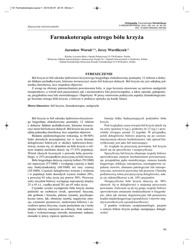 121 Farmakoterapia:Layout 1 2014-04-07 20:10 Strona 1 O r t o p e d i a Traumatologia Rehabilitacja © MEDSPORTPRESS, 2014; 1(6); Vol. 16, 99-103 DOI: 10.5604/15093492.1097494 SZKOLENIE PODYPLOMOWE Farmakoterapia ostrego bólu krzyża Jarosław Woroń1,2,3, Jerzy Wordliczek1,2 2 1 Klinika Leczenia Bólu i Opieki Paliatywnej UJ CM Kraków, Polska Kliniczny Oddział Anestezjologii i Intensywnej Terapii Nr 1 Szpital Uniwersytecki w Krakowie, Polska 3 Zakład Farmakologii Klinicznej Katedry Farmakologii UJ CM Kraków, Polska STRESZCZENIE Ból krzyża to ból odcinka lędźwiowo-krzyżowego kręgosłupa zlokalizowany pomiędzy 12 żebrem a dolnymi fałdami pośladkowymi, któremu towarzyszyć może ból kończyn dolnych. Ból krzyża nie jest odrębną jednostką chorobową, lecz zespołem objawów. Z uwagi na złożony patomechanizm powstawania bólu, w jego leczeniu stosowane są zarówno analgetyki nieopioidowe, a wśród nich paracetamol, jak i niesteroidowe leki przeciwzapalne, a także opioidy, gabapentyna, pregabalina oraz leki miorelaksujące i flupirtyna. W pracy omówiono praktyczne aspekty farmakologicznego leczenia ostrego bólu krzyża, z którym w praktyce spotyka się każdy lekarz. Słowa kluczowe: ból krzyża, farmakoterapia, analgetyki Ból krzyża to ból odcinka lędźwiowo-krzyżowego kręgosłupa zlokalizowany pomiędzy 12 żebrem a dolnymi fałdami pośladkowymi, któremu towarzyszyć może ból kończyn dolnych. Ból krzyża nie jest odrębną jednostką chorobową, lecz zespołem objawów. Badania epidemiologiczne wskazują, że 60-80% ludzi dorosłych przynajmniej raz w życiu doznaje dolegliwości bólowych w okolicy lędźwiowo-krzyżowej; ocenia się, że aktualnie na bóle krzyża o różnym stopniu nasileniu skarży się 17-33% populacji. Wśród chorych leczonych z powodu bólu przewlekłego, w 25% przypadków przyczyną są bóle krzyża. Bóle kręgosłupa dotyczą częściej kobiet (70/1000) niż mężczyzn (57/1000) i występują częściej u ludzi rasy białej-kaukaskiej (68/1000) niż rasy czarnej (38/1000). Częstość dolegliwości wzrasta z wiekiem i w populacji ludzi dorosłych wynosi średnio 20%, a powyżej 65 roku życia już prawie 50%. Pierwszy ostry incydent bólowy występuje najczęściej między 25 a 45 r.ż., rzadko przed 20 i po 65 roku życia. Czynniki ryzyka wystąpienia bólu krzyża można podzielić na osobnicze (wiek, sprawność fizyczna, siła grzbietu i brzucha, palenie tytoniu), psychospołeczne (stres, lęk, obniżony nastrój, negatywne emocje, czynności poznawcze, zachowania bólowe) i zawodowe (praca fizyczna, częste pochylanie się i ruchy skrętne tułowia, narażenie na wibracje, brak zadowolenia z wykonywanego zawodu, monotonne zadania, stosunki w pracy, wparcie społeczne). Istnieje kilka funkcjonujących podziałów bólu krzyża. Pod względem czasu trwania ból krzyża dzieli się na ostry (poniżej 6 tyg.), podostry (6-12 tyg.) i przewlekły trwający ponad 12 tygodni. W przypadku, jeżeli dolegliwości bólowe pojawią się po sześciomiesięcznym okresie bezbolesności, taki epizod klasyfikowany jest jako ból nawracający. Ze względu na przyczynę powstania, ból krzyża dzieli się na specyficzny i niespecyficzny. Specyficzny ból krzyża obejmuje zespoły bólowe spowodowane znanym mechanizmem powstawania, np. przepuklina jądra miażdżystego, stenoza kanału kręgowego, infekcja, osteoporoza, seronegatywne zapalenie stawów, złamanie patologiczne lub osteoporotyczne, nowotwór pierwotny lub przerzut. Chorobę podstawową, która jest przyczyną dolegliwości, udaje się zidentyfikować u ok. 10% pacjentów. Niespecyficzne bóle krzyża dotyczą ok. 90% chorych. Są to dolegliwości o niejasnej przyczynie powstania. Zaliczane są do tej grupy zespoły bólowe spowodowane zmianami strukturalnymi w kręgosłupie, takie jak zmiany degeneracyjne lub pourazowe krążka międzykręgowego (spondylosis) i stawów międzywyrostkowych (spondyloarthrosis). Z punktu widzenia symptomatologii, pacjent z ostrym bólem krzyża podaje następujące dolegliwości: 99 121 Farmakoterapia:Layout 1 2014-04-07 20:10 Strona 2 Woroń J. et al. Farmakoterapia ostrego bólu krzyża • ból, który pojawia się nagle, po wysiłku związanym z dźwignięciem, gwałtownym ruchem czy zwykłą czynnością codzienną; • ból ma różny charakter i nasilenie; najczęściej jest tępy, zaczyna się w okolicy lędźwiowej, promieniuje wzdłuż kończyny do okolic kolana; • ból może promieniować (zwykle jednostronnie) wzdłuż korzenia nerwu rdzeniowego; • ból krzyża zmniejsza się w nocy; pozostawanie w łóżku zazwyczaj zmniejsza dolegliwości; • ból nasila się podczas chodzenia. W przypadku ostrego zespołu bólowego obserwuje się: • boczne skrzywienie kręgosłupa w odcinku lędźwiowym, skierowane wypukłością w zdrową stronę; • znaczne spłaszczenie lordozy lędźwiowej; • skurcz mięśni przykręgosłupowych, a także ograniczenie ruchomości kręgosłupa. Przyczyną wywołującą boczne skrzywienie kręgosłupa i wygładzenie lordozy jest pozycja odruchowa, którą chory przybiera w „ucieczce” przed bólem, odbarczając uciśnięty korzeń. Objawy korzeniowe występują u 1% pacjentów z ostrymi bólami krzyża. Etiopatogeneza bólu krzyża jest złożona. Obejmuje ona czynniki zapalne, metaboliczne, mechaniczne i genetyczne. Proces chorobowy polega na postępującej degradacji chrząstki stawowej, kości podchrzęstnej i wszystkich struktur okołostawowych, a towarzyszy temu zawsze lokalny odczyn zapalny. Spośród przyczyn funkcjonalnych wymienia się najczęściej: • przyczyny mięśniowe, np: wzmożone napięcie i przykurcz mięśnia gruszkowatego, biodrowolędźwiowego, czworobocznego lędźwi; • przyczyny stawowe – tzw. zablokowanie czynnościowe stawów międzywyrostkowych kręgów lub stawów krzyżowo-biodrowych; • przyczyny więzadłowe np. wzmożone napięcie i podrażnienie więzade