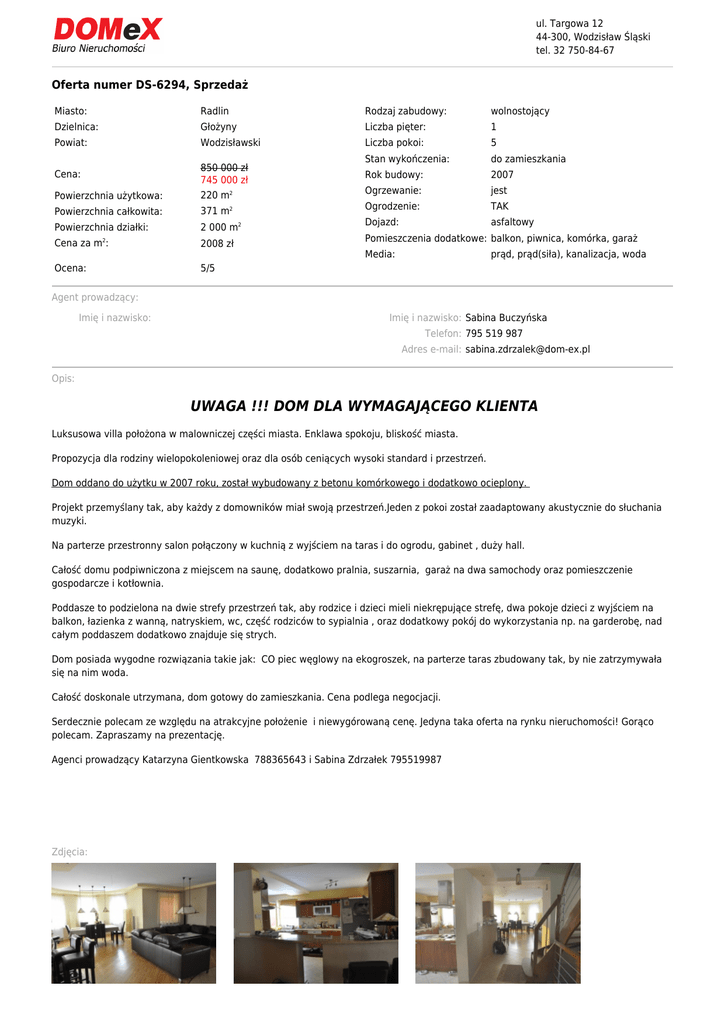 ul. Targowa 12 44-300, Wodzisław Śląski tel. 32 750-84-67 Oferta numer DS-6294, Sprzedaż Miasto: Radlin Rodzaj zabudowy: wolnostojący Dzielnica: Głożyny Liczba pięter: 1 Powiat: Wodzisławski Liczba pokoi: 5 Stan wykończenia: do zamieszkania Rok budowy: 2007 Ogrzewanie: jest Ogrodzenie: TAK Dojazd: asfaltowy 850 000 zł 745 000 zł Cena: Powierzchnia użytkowa: 220 m2 Powierzchnia całkowita: 371 m2 Powierzchnia działki: 2 000 m Cena za m : 2008 zł Ocena: 5/5 2 2 Pomieszczenia dodatkowe: balkon, piwnica, komórka, garaż Media: prąd, prąd(siła), kanalizacja, woda Agent prowadzący: Imię i nazwisko: Imię i nazwisko: Sabina Buczyńska Telefon: 795 519 987 Adres e-mail: [email protected] Opis: UWAGA !!! DOM DLA WYMAGAJĄCEGO KLIENTA Luksusowa villa położona w malowniczej części miasta. Enklawa spokoju, bliskość miasta. Propozycja dla rodziny wielopokoleniowej oraz dla osób ceniących wysoki standard i przestrzeń. Dom oddano do użytku w 2007 roku, został wybudowany z betonu komórkowego i dodatkowo ocieplony. Projekt przemyślany tak, aby każdy z domowników miał swoją przestrzeń.Jeden z pokoi został zaadaptowany akustycznie do słuchania muzyki. Na parterze przestronny salon połączony w kuchnią z wyjściem na taras i do ogrodu, gabinet , duży hall. Całość domu podpiwniczona z miejscem na saunę, dodatkowo pralnia, suszarnia, garaż na dwa samochody oraz pomieszczenie gospodarcze i kotłownia. Poddasze to podzielona na dwie strefy przestrzeń tak, aby rodzice i dzieci mieli niekrępujące strefę, dwa pokoje dzieci z wyjściem na balkon, łazienka z wanną, natryskiem, wc, część rodziców to sypialnia , oraz dodatkowy pokój do wykorzystania np. na garderobę, nad całym poddaszem dodatkowo znajduje się strych. Dom posiada wygodne rozwiązania takie jak: CO piec węglowy na ekogroszek, na parterze taras zbudowany tak, by nie zatrzymywała się na nim woda. Całość doskonale utrzymana, dom gotowy do zamieszkania. Cena podlega negocjacji. Serdecznie polecam ze względu na atrakcyjne położenie i niewygórowaną cenę. Jedyna taka oferta na rynku nieruchomości! Gorąco polecam. Zapraszamy na prezentację. Agenci prowadzący Katarzyna Gientkowska 788365643 i Sabina Zdrzałek 795519987 Zdjęcia: Zamieszczone na naszej stronie oferty nieruchomości mają charakter informacyjny i nie stanowią oferty w rozumieniu prawa handlowego.
