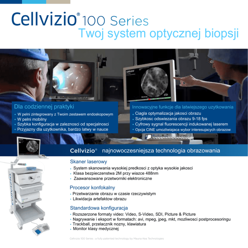 100 Series Twoj system optycznej biopsji Dla codziennej praktyki Innowacyjne funkcje dla latwiejszego uzytkowania • W pelni zintegrowany z Twoim zestawem endoskopowym • W pelni mobilny w zaleznosci od • Szybka konfiguracja specjalnosci • Przyjazny dla uzytkownika, bardzo latwy w nauce jakosci • Ciagla optymalizacja obrazu 9-18 fps • Szybkosc odswiezania obrazu fluorescencji • Cyfrowy sygnal indukowanej laserem • Opcja CINE umozliwiajaca wybor interesujacych obrazow Cellvizio® najnowoczesniejsza technologia obrazowania Skaner laserowy • System skanowania wysokiej predkosci z optyka wysokie jakosci • Klasa bezpieczenstwa 2M przy wiazce 488nm • Zaawansowane przetworniki elektroniczne Procesor konfokalny • Przetwarzanie obrazu w czasie rzeczywistym • Likwidacja artefaktow obrazu Standardowa konfiguracja • Rozszerzone formaty video: Video, S-Video, SDI, Picture & Picture • Nagrywanie i eksport w formatach: avi, mpeg, jpeg, mkt, mozliwosci postprocesoringu • Trackball, przelacznik nozny, klawiatura • Monitor klasy medycznej Cellvizio 100 Series : a fully patented technology by Mauna Kea Technologies Confocal Miniprobes™ Dla roznych specjalizacji medycznych Kompatybilny Maks. ilosc kanal Dlugosc badan roboczy Glebokosc Pole Rozdzielczosc konfokalna widzenia GastroFlex™ UHD ≥ 2.8 mm 3m 20 ∅ 240 µm 1 µm 55 to 65 µm AlveoFlex™ ≥ 1.9 mm 3m 20 ∅ 600 µm 3.5 µm 0 to 50 µm CholangioFlex™ ≥ 1.0 mm 4m 10 ∅ 325 µm 3.5 µm 40 to 70 µm AQ-Flex™ 19 ≥ 0.91 mm 4m 10 ∅ 325 µm 3.5 µm 40 to 70 µm ColoFlex™ UHD ≥ 2.8 mm 4m 20 ∅ 240 µm 1 µm 55 to 65 µm UroFlex™a ≥ 1 mm 3m 10 ∅ 325 µm 3.5 µm 40 to 70 µm CystoFlex™a ≥ 1 mm 2m 20 ∅ 325 µm 3.5 µm 40 to 70 µm ≥ 2,8 mm 2m 20 ∅ 240 µm 1 µm 55 to 65 µm CystoFlex™ UHDa Wylaczny przedstawiciel w Polsce (19G) (3 Fr) (3 Fr) (8,4 Fr) Kompatybilne ze wszystkimi markami endoskopow i standardowymi metodami reprocessingu DIAGNOSTYKA OBRAZOWA www.trimed.pl [email protected] tel. 126227200, 226260174 The Cellvizio® Systems are regulated Medical Device, CE marked (Class IIa - NB : LNE/G-MED) and FDA cleared; Cellvizio systems are intended to allow confocal laser imaging of the internal microstructure of tissues in anatomical tracts, i.e. gastrointestinal, respiratory or urinary, accessed through an endoscope or endoscopic accessories. The Cellvizio System is a regulated Medical Device, CE marked (Class IIa - NB : LNE/GMED) and FDA cleared. subject to change without prior notice and without any obligation on the part of the manufacturer. www.maunakeatech.com Cellvizio 100 Series datasheet © Mauna Kea Technologies, November 2013, v1.03