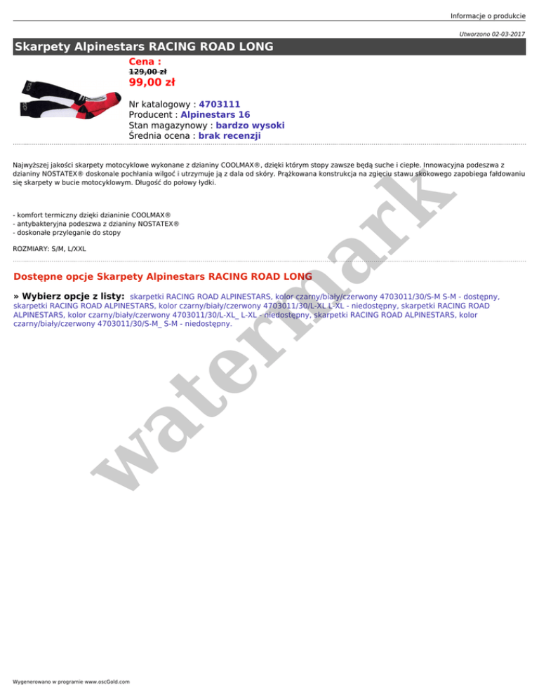 Informacje o produkcie Utworzono 02-03-2017 Skarpety Alpinestars RACING ROAD LONG Cena : 129,00 zł 99,00 zł Nr katalogowy : 4703111 Producent : Alpinestars 16 Stan magazynowy : bardzo wysoki Średnia ocena : brak recenzji er m ar k Najwyższej jakości skarpety motocyklowe wykonane z dzianiny COOLMAX®, dzięki którym stopy zawsze będą suche i ciepłe. Innowacyjna podeszwa z dzianiny NOSTATEX® doskonale pochłania wilgoć i utrzymuje ją z dala od skóry. Prążkowana konstrukcja na zgięciu stawu skokowego zapobiega fałdowaniu się skarpety w bucie motocyklowym. Długość do połowy łydki. - komfort termiczny dzięki dzianinie COOLMAX® - antybakteryjna podeszwa z dzianiny NOSTATEX® - doskonałe przyleganie do stopy ROZMIARY: S/M, L/XXL Dostępne opcje Skarpety Alpinestars RACING ROAD LONG » Wybierz opcje z listy: skarpetki RACING ROAD ALPINESTARS, kolor czarny/biały/czerwony 4703011/30/S-M S-M - dostępny, w at skarpetki RACING ROAD ALPINESTARS, kolor czarny/biały/czerwony 4703011/30/L-XL L-XL - niedostępny, skarpetki RACING ROAD ALPINESTARS, kolor czarny/biały/czerwony 4703011/30/L-XL_ L-XL - niedostępny, skarpetki RACING ROAD ALPINESTARS, kolor czarny/biały/czerwony 4703011/30/S-M_ S-M - niedostępny. Wygenerowano w programie www.oscGold.com