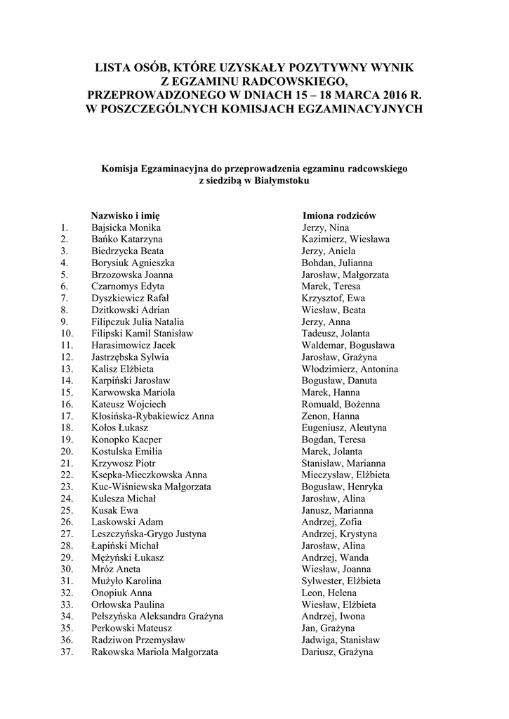 LISTA OSÓB, KTÓRE UZYSKAŁY POZYTYWNY WYNIK Z EGZAMINU RADCOWSKIEGO, PRZEPROWADZONEGO W DNIACH 15 – 18 MARCA 2016 R. W POSZCZEGÓLNYCH KOMISJACH EGZAMINACYJNYCH Komisja Egzaminacyjna do przeprowadzenia egzaminu radcowskiego z siedzibą w Białymstoku 1. 2. 3. 4. 5. 6. 7. 8. 9. 10. 11. 12. 13. 14. 15. 16. 17. 18. 19. 20. 21. 22. 23. 24. 25. 26. 27. 28. 29. 30. 31. 32. 33. 34. 35. 36. 37. Nazwisko i imię Bajsicka Monika Bańko Katarzyna Biedrzycka Beata Borysiuk Agnieszka Brzozowska Joanna Czarnomys Edyta Dyszkiewicz Rafał Dzitkowski Adrian Filipczuk Julia Natalia Filipski Kamil Stanisław Harasimowicz Jacek Jastrzębska Sylwia Kalisz Elżbieta Karpiński Jarosław Karwowska Mariola Kateusz Wojciech Kłosińska-Rybakiewicz Anna Kołos Łukasz Konopko Kacper Kostulska Emilia Krzywosz Piotr Ksepka-Mieczkowska Anna Kuc-Wiśniewska Małgorzata Kulesza Michał Kusak Ewa Laskowski Adam Leszczyńska-Grygo Justyna Łapiński Michał Mężyński Łukasz Mróz Aneta Mużyło Karolina Onopiuk Anna Orłowska Paulina Pełszyńska Aleksandra Grażyna Perkowski Mateusz Radziwon Przemysław Rakowska Mariola Małgorzata Imiona rodziców Jerzy, Nina Kazimierz, Wiesława Jerzy, Aniela Bohdan, Julianna Jarosław, Małgorzata Marek, Teresa Krzysztof, Ewa Wiesław, Beata Jerzy, Anna Tadeusz, Jolanta Waldemar, Bogusława Jarosław, Grażyna Włodzimierz, Antonina Bogusław, Danuta Marek, Hanna Romuald, Bożenna Zenon, Hanna Eugeniusz, Aleutyna Bogdan, Teresa Marek, Jolanta Stanisław, Marianna Mieczysław, Elżbieta Bogusław, Henryka Jarosław, Alina Janusz, Marianna Andrzej, Zofia Andrzej, Krystyna Jarosław, Alina Andrzej, Wanda Wiesław, Joanna Sylwester, Elżbieta Leon, Helena Wiesław, Elżbieta Andrzej, Iwona Jan, Grażyna Jadwiga, Stanisław Dariusz, Grażyna 38. 39. 40. 41. 42. 43. 44. 45. 46. 47. 48. 49. 50. 51. 52. Romaniuk Piotr Sakowicz Anna Samoszuk Dariusz Saniewska Kamila Siekierko Łukasz Sienkiewicz Urszula Luiza Skowron-Gosk Urszula Stasiński Szymon Surawska Joanna Surawski Adrian Łukasz Szulc Magda Taraszkiewicz Magdalena Wincenciak-Pruszyńska Katarzyna Wojszko Maria Zakrzewska-Bochenko Agnieszka Konstanty, Halina Bogdan, Ewa Jan, Danuta Mieczysław, Ewa Jarosław, Anna Wiesław, Celestyna Jarosław, Iwona Zenon, Teresa Jarosław, Elżbieta Ryszard, Grażyna Wiesław, Janina Czesław, Urszula Dariusz, Wiesława Adam, Małgorzata Władysław, Helena Komisja Egzaminacyjna do przeprowadzenia egzaminu radcowskiego z siedzibą w Bydgoszczy 1. 2. 3. 4. 5. 6. 7. 8. 9. 10. 11. 12. 13. 14. 15. 16. 17. 18. 19. 20. 21. 22. 23. 24. 25. 26. 27. Nazwisko i imię Baumgart Katarzyna Maria Bieliński Tomasz Chabiera Anna Dreger-Włoch Magdalena Dyda Michał Fortuna Karolina Gandyn Magdalena Halagiera Piotr Haraszkiewicz Agnieszka Janikowski Tomasz Januszewski Paweł Jurkowski Paweł Kaczmarek Elżbieta Kamiński Tomasz Kasnowska Julita (up. Krac) Kasnowski Piotr Kempczyńska Anna Kiełbasiński Tomasz Kolad Daria Magdalena Kowalska Danuta Kowalski Piotr Kubicki Michał Kubińska Michalina Kurdzieko Przemysław Kuss Monika Łozowski Jarosław Łuczkowski Rafał Imiona rodziców Marian, Alina Kazimierz, Anna Michał, Elżbieta Aleksander, Dorota Marian, Elżbieta Marek, Elżbieta Jarosław, Maria Stefan, Wanda Andrzej, Renata Zbigniew, Bogumiła Mirosław, Joanna Piotr, Małgorzata Grzegorz, Kazimiera Stanisław, Wiesława Andrzej, Zofia Jerzy, Barbara Mirosław, Danuta Andrzej, Janina Mirosław, Aleksandra Zdzisław, Irena Klaudiusz, Elżbieta Dariusz, Katarzyna Jan, Krystyna Piotr, Elżbieta Grzegorz, Danuta Andrzej, Krystyna Krzysztof, Mariola 28. 29. 30. 31. 32. 33. 34. 35. 36. 37. 38. 39. 40. 41. 42. 43. 44. 45. 46. 47. 48. Łusiak Paweł Madzińska Karolina Majewski Karol Malczyk Paula Maroszek Maria Maroszek Michał Michałek Martynika Okupska Katarzyna Pacewicz Magdalena Paczkowski Dawid Pawłowska Izabela Piątek Przemysław Pietrzak-Biegała Paulina Radziszewski Przemysław Rogińska Magdalena Stępkowska Izabela Szulc Danuta Tomaszek Wojciech Wełnic Magdalena Anna Witkowska Aleksandra Złotnicki Michał Krzysztof, Wiesława Andrzej, Barbara Antoni, Krystyna Bogdan, Ewa Zbigniew, Bogna Janusz, Maria Jerzy, Katarzyna Jarosław, Małgorzata Piotr, Beata Stefan, Maria Leszek, Mirosława Leszek; Alicja Stefan, Elżbieta Krzysztof, Hanna Andrzej, Jadwiga Henryk, Anna Jerzy, Alicja Czesław, Janina Stefan, Ewa Jan, Anna Włodzimierz, Teresa Komisja Egzaminacyjna do przeprowadzenia egzaminu radcowskiego z siedzibą w Gdańsku 1. 2. 3. 4. 5. 6. 7. 8. 9. 10. 11. 12. 13. 14. 15. 16. 17. 18. 19. 20. 21. Nazwisko i imię Abramek Magdalena Adamowicz Dorota Andrzejewska Aleksandra Antonowicz Małgorzata Badtke Damian Bernecki Bartosz Biedrzycka Katarzyna Borejko Paulina Borek Tomasz Borówka Katarzyna Browarczyk-Dmochowska Aneta Brzeziński Kryspin Buczyńska Aleksandra Budek Michał Budnicka Magda Burkiewicz-Sulikowska Maria Bystram Piotr Capała Alicja Chabel Monika Chamot Artur Christensen Anna Imiona rodziców Adam, Dorota Zygmunt, Krystyna Andrzej, Grażyna Kazimierz, Mirosława Mirosław, Beata Zdzisław, Marzanna Roman, Teresa Eugeniusz, Bożena Maciej, Katarzyna Waldemar, Joanna Kazimierz, Mirosława Józef, Urszula Leszek, Grażyna Alfred, Grażyna Robert, Violetta Augustyn, Ewa Zbigniew, Maria Bogusław, Iwona Tomasz, Mirosława Waldemar, Krystyna Stanisław, Magdalena 22. 23. 24. 25. 26. 27. 28. 29. 30. 31. 32. 33. 34. 35. 36. 37. 38. 39. 40. 41. 42. 43. 44. 45. 46. 47. 48. 49. 50. 51. 52. 53. 54. 55. 56. 57. 58. 59. 60. 61. 62. 63. 64. Chyła Agnieszka Cichocki Marcin Czaja Ryszard Czaplewski Karol Czarnecka Marta Czarnojan Anna Czech Agnieszka Czeszejko-Sochacki Wojciech Darda Adam Darwicka Edyta Derc Ewa Dobrowolska Beata Dobrzyn Anna Dombrowska Bożena Dziedzic Izabela Eliszewska Anna Fiłonowicz Karolina Fischer Sebastian Flatow Karolina Foltman Paweł Franas Mikołaj Gajewska Aleksandra Giełczyński Bartosz Griffin Patrycja Gromadziński Mariusz Gronkiewicz Michał Hervy Agnieszka Irczyc