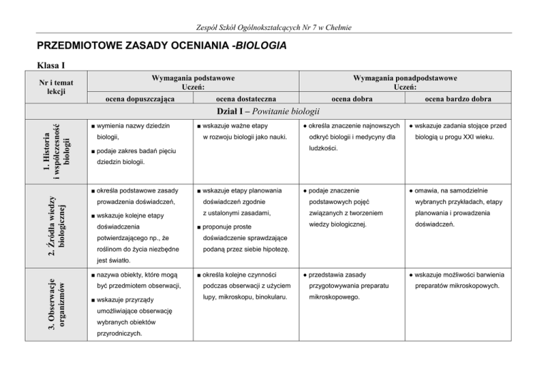 Zespół Szkół Ogólnokształcących Nr 7 w Chełmie PRZEDMIOTOWE ZASADY OCENIANIA -BIOLOGIA Klasa I Nr i temat lekcji Wymagania podstawowe Uczeń: ocena dopuszczająca Wymagania ponadpodstawowe Uczeń: ocena dostateczna ocena dobra ocena bardzo dobra ● określa znaczenie najnowszych ● wskazuje zadania stojące przed 1. Historia i współczesność biologii Dział I – Powitanie biologii ■ wymienia nazwy dziedzin biologii, w rozwoju biologii jako nauki. odkryć biologii i medycyny dla biologią u progu XXI wieku. ludzkości. ■ podaje zakres badań pięciu dziedzin biologii. ■ określa podstawowe zasady 2. Źródła wiedzy biologicznej ■ wskazuje ważne etapy prowadzenia doświadczeń, ■ wskazuje kolejne etapy doświadczenia ■ wskazuje etapy planowania ● podaje znaczenie ● omawia, na samodzielnie doświadczeń zgodnie podstawowych pojęć wybranych przykładach, etapy z ustalonymi zasadami, związanych z tworzeniem planowania i prowadzenia wiedzy biologicznej. doświadczeń. ■ proponuje proste potwierdzającego np., że doświadczenie sprawdzające roślinom do życia niezbędne podaną przez siebie hipotezę. jest światło. 3. Obserwacje organizmów ■ nazywa obiekty, które mogą być przedmiotem obserwacji, ■ wskazuje przyrządy umożliwiające obserwację wybranych obiektów przyrodniczych. ■ określa kolejne czynności ● przedstawia zasady podczas obserwacji z użyciem przygotowywania preparatu lupy, mikroskopu, binokularu. mikroskopowego. ● wskazuje możliwości barwienia preparatów mikroskopowych. 4. Klasyfikacja organizmów ■ wyjaśnia znaczenie klasyfikacji. ● uzasadnia konieczność tworzenia naukowych nazw gatunkowych. ● prezentuje dokonania Karola Linneusza i Karola Darwina. 5. Oznaczanie organizmów ■ rozpoznaje, za pomocą kluczy i atlasów, pięć organizmów roślinnych i zwierzęcych. ■ podaje charakterystyczne cechy organizmów zaliczanych do jednego rodzaju, np. koniczyna, dąb lub pies. ● podaje zasady korzystania z atlasów i kluczy podczas oznaczania organizmów. ● określa znaczenie rozpoznawania i oznaczania organizmów. 6. Budowa komórek ■ wyjaśnia, czym jest komórka, ■ podaje przykłady komórek budujących organizmy. ■ rozpoznaje na rysunkach i schematach oraz nazywa podstawowe struktury komórkowe. ● podaje funkcje podstawowych struktur komórkowych. ● wskazuje, na samodzielnie wykonanym rysunku, podstawowe struktury komórkowe. ■ wymienia nazwy królestw grupujących organizmy kuli ziemskiej. ■ podaje charakterystyczne cechy organizmów zaliczanych do poszczególnych królestw. ● porównuje królestwa organizmów, ● uzasadnia, że podział organizmów na królestwa jest przyjętą w danej chwili umową, która ulega zmianom. 7. Pięć królestw organizmów ■ wymienia charakterystyczne cechy danego gatunku. © Copyright by Wydawnictwa Szkolne i Pedagogiczne Spółka Akcyjna, Warszawa 2009 ● uzasadnia przynależność danego organizmu do określonego królestwa 2 Dział II – Funkcjonowanie organizmów 11. Sposoby rozmnażania się organizmów 10. Sposoby oddychania organizmów 9. Sposoby odżywiania się organizmów 8. Czynności życiowe organizmów ■ wymienia czynności życiowe organizmów, ■ wskazuje, że organizmy zbudowane są z komórek. ■ określa, czym jest odżywianie się, ■ nazywa sposób odżywiania się ■ definiuje odżywianie się, oddychanie i wydalanie, ■ uzasadnia za pomocą trzech ● określa, na czym polega pobudliwość, argumentów, że dany organizm wykazuje czynności życiowe. wykazuje czynności życiowe. odżywianiem się samożywnym ewoluują. ● uzasadnia za pomocą sześciu argumentów, że dany organizm ■ wykazuje różnice między ● wykazuje, że organizmy ● omawia przebieg procesu fotosyntezy. i cudzożywnym. ● wskazuje różnorodność odżywiania się wśród organizmów cudzożywnych. wybranych przez siebie organizmów. ■ określa, czym jest oddychanie, ■ nazywa sposób oddychania wybranych przez siebie organizmów. ■ wskazuje przykłady organizmów oddychających ● wykazuje różnice w wymianie gazowej roślin i zwierząt. ● porównuje oddychanie tlenowe i beztlenowe. w różny sposób, ■ podaje przykłady wykorzystania energii w organizmie. ■ określa, czym jest rozmnażanie się, ■ nazywa sposób rozmnażania ■ podaje przykłady rozmnażania ● uzasadnia, że rozmnażanie ● uzasadnia wpływ rozmnażania się płciowego i bezpłciowego płciowe daje większą płciowego na ewolucję organizmów. zmienność organizmów niż organizmów. się wybranych przez siebie rozmnażanie bezpłciowe. organizmów. © Copyright by Wydawnictwa Szkolne i Pedagogiczne Spółka Akcyjna, Warszawa 2009 3 12. Wirusy ■ wskazuje, że wirusy nie są 13. Bakterie Dział III – Od bakterii do glonów ■ wskazuje środowiska życia zbudowane z komórek, cechy wirusów. ● uzasadnia nieskuteczność leczenia chorób wirusowych ● podaje charakterystykę chorób prionowych. antybiotykami. ■ wymienia choroby człowieka wywoływane przez wirusy. bakterii. ■ wymienia główne grupy 14. Protisty ■ wymienia charakterystyczne ■ określa rolę bakterii w przyrodzie i życiu człowieka. ■ wskazuje na schemacie ● omawia czynności życiowe bakterii. ● opisuje cechy budowy organizmów zaliczanych do budowy np. pantofelka organizmów, na podstawie królestwa protistów, i nazywa organelle, których zostały one zaliczone ■ rozpoznaje na ilustracjach i podaje nazwy przedstawicieli głównych grup pierwotniaków. ■ omawia funkcje wybranych organelli, ■ wymienia nazwy pierwotniaków ● uzasadnia ważną rolę bakterii jako destruentów. ● charakteryzuje pierwotniaki chorobotwórcze. do poszczególnych grup królestwa pierwotniaków, ● wyjaśnia, co to są organelle. 15. Grzyby i porosty chorobotwórczych. ■ wymienia charakterystyczne cechy grzybów, ■ określa, czym jest porost. ■ wskazuje możliwość wykorzyst