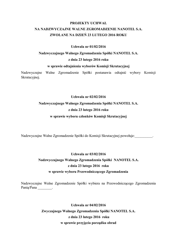 PROJEKTY UCHWAŁ NA NADZWYCZAJNE WALNE ZGROMADZENIE NANOTEL S.A. ZWOŁANE NA DZIEŃ 23 LUTEGO 2016 ROKU Uchwała nr 01/02/2016 Nadzwyczajnego Walnego Zgromadzenia Spółki NANOTEL S.A. z dnia 23 lutego 2016 roku w sprawie odtajnienia wyborów Komisji Skrutacyjnej Nadzwyczajne Skrutacyjnej. Walne Zgromadzenie Spółki postanawia odtajnić wybory Komisji Uchwała nr 02/02/2016 Nadzwyczajnego Walnego Zgromadzenia Spółki NANOTEL S.A. z dnia 23 lutego 2016 roku w sprawie wyboru członków Komisji Skrutacyjnej Nadzwyczajne Walne Zgromadzenie Spółki do Komisji Skrutacyjnej powołuje:__________. Uchwała nr 03/02/2016 Nadzwyczajnego Walnego Zgromadzenia Spółki NANOTEL S.A. z dnia 23 lutego 2016 roku w sprawie wyboru Przewodniczącego Zgromadzenia Nadzwyczajne Walne Zgromadzenie Spółki wybiera na Przewodniczącego Zgromadzenia Panią/Pana ________. Uchwała nr 04/02/2016 Zwyczajnego Walnego Zgromadzenia Spółki NANOTEL S.A. z dnia 23 lutego 2016 roku w sprawie przyjęcia porządku obrad Nadzwyczajne Walne Zgromadzenie Spółki NANOTEL S.A. z siedzibą we Wrocławiu przyjmuje niniejszym następujący porządek obrad Walnego Zgromadzenia: 1. Otwarcie Walnego Zgromadzenia. 2. Wybór Przewodniczącego Walnego Zgromadzenia. 3. Stwierdzenie prawidłowości zwołania Walnego Zgromadzenia oraz jego zdolności do podejmowania uchwał. 4. Podjęcie uchwały w sprawie przyjęcia porządku obrad. 7. Podjęcie uchwały w sprawie przyjęcia programu emisji obligacji zamiennych na akcje. 8. Podjęcie uchwały w sprawie warunkowego podwyższenia kapitału zakładowego Spółki w drodze emisji akcji zwykłych Spółki na okaziciela, w sprawie zmian Statutu Spółki, w sprawie wyłączenia prawa poboru akcji oraz upoważnienia Rady Nadzorczej do przyjęcia tekstu jednolitego Statutu Spółki. 9. Podjęcie uchwały w sprawie zmian w składzie Rady Nadzorczej spółki. 10. Zamknięcie obrad Walnego Zgromadzenia. Uchwała nr 05/02/2016 Nadzwyczajnego Walnego Zgromadzenia Spółki NANOTEL S.A. z dnia 23 lutego 2016 roku w sprawie przyjęcia programu emisji obligacji zamiennych na akcje. Nadzwyczajne Walne Zgromadzenie spółki pod firmą NANOTEL SPÓŁKA AKCYJNA z siedzibą we Wrocławiu (dalej określana jako „Spółka” lub „Emitent”), działając na podstawie art. 393 pkt 5 i art. 448 ustawy z dnia 15 września 2000 roku – kodeks spółek handlowych (Dz. U. 2000 r. Nr 94, poz. 1037 z późn. zm., dalej jako „KSH” lub „Kodeks Spółek Handlowych) oraz na podstawie art. 19 ustawy z dnia 15 stycznia 2015 r. (Dz.U. z 2015 r. poz. 238, dalej jako „Ustawa o obligacjach”) i § 7 Statutu Spółki uchwala co następuje: §1 1. Walne Zgromadzenie Spółki niniejszym uchwala program emisji („Program Emisji”) nie więcej niż 15.000 (słownie: piętnaście tysięcy) obligacji imiennych, zabezpieczonych, o wartości nominalnej 1.000,00 (słownie: jeden tysiąc) złotych każda i łącznej wartości nominalnej nie wyższej niż 15.000.000,00 (słownie: piętnaście milionów), zamiennych na akcje zwykłe Spółki na okaziciela serii od E01 do E10 Spółki, o wartości nominalnej 0,10 zł (dziesięć groszy) każda („Akcje”), na warunkach określonych w dalszej treści niniejszej uchwały, przy czym Akcje wyemitowane zostaną w ramach warunkowego podwyższenia kapitału zakładowego Spółki. 2. W ramach Programu Emisji Obligacje mogą zostać wyemitowane w jednej lub dwóch seriach, oznaczonych od H01 do H02 (dalej określane łącznie jako „Obligacje”). 3. W ramach Programu Emisji Obligacje mogą być emitowane do dnia 31 grudnia 2016 r. (włącznie), to jest najpóźniej w tym dniu może przypadać data emisji ostatniej emitowanej serii Obligacji emitowanych w ramach Programu Emisji. 4. W ramach Programu Emisji, Obligacje danej serii, mogą być emitowane na okres nie dłuższy niż 60 (sześćdziesiąt) miesięcy, licząc od daty emisji danej serii Obligacji. 5. Obligacje emitowane w ramach Programu Emisji będą papierami wartościowymi na okaziciela, a propozycja objęcia Obligacji danej serii będzie mogła zostać skierowana do nie więcej niż 149 indywidualnie oznaczonych adresatów, zgodnie z art. 33 pkt 2 Ustawy o obligacjach. 3. Dniem emisji Obligacji danej serii będzie dzień przydziału Obligacji. Przydział i wydanie Obligacji nastąpi nie wcześniej niż po zarejestrowaniu w rejestrze przedsiębiorców Krajowego Rejestru Sądowego wzmianki dotyczącej maksymalnej wysokości warunkowego podwyższenia kapitału zakładowego związanego z uchwaleniem Programu Emisji Obligacji. 5. Obligacje będą mogły być obejmowane za wkład pieniężny, jak również w drodze potrącenia wzajemnych wierzytelności obligatariuszy oraz Spółki lub poprzez przeniesienie na rzecz Spółki własności uprzednio wyemitowanych obligacji Spółki. 6. Cena emisyjna Obligacji będzie równa ich wartości nominalnej. 7. Obligacje będą oprocentowane. Wysokość oprocentowania zostanie określona przez Zarząd w warunkach emisji Obligacji poszczególnych serii („Warunki Emisji”). 8. Obligacje będą zabezpieczone. Zabezpieczenia Obligacji poszczególnych serii zostaną określone przez Zarząd w Warunkach Emisji. 9. Obligacje nie będą posiadały formy dokumentu. Ewidencję Obligacji będzie prowadził podmiot oferujący te Obligacje, o którym mowa w art. 8 ust. 2 Ustawy o obligacjach. 10. Termin wykupu („Dzień Wykupu”) Obligacji przypadał będzie w dniu, który zostanie określony przez Zarząd w Warunkach Emisji poszczególnych serii. Zarząd będzie uprawniony do ustalenia Dnia Wykupu na dzień nie późniejszy niż upływający po 30 (trzydziestu) miesiącach od dnia przydziału Obligacji poszczególnych serii. 11. Warunki Emisji będą określały zasady wykupu Obligacji przed Dniem Wykupu. 12. Posiadacze Obligacji będą uprawnieni według swojego wyboru do otrzymania świadczeń pieniężnych wynikających z Obligacji albo zamiany Obligacji na akcje zwykłe Spółki na okaziciel