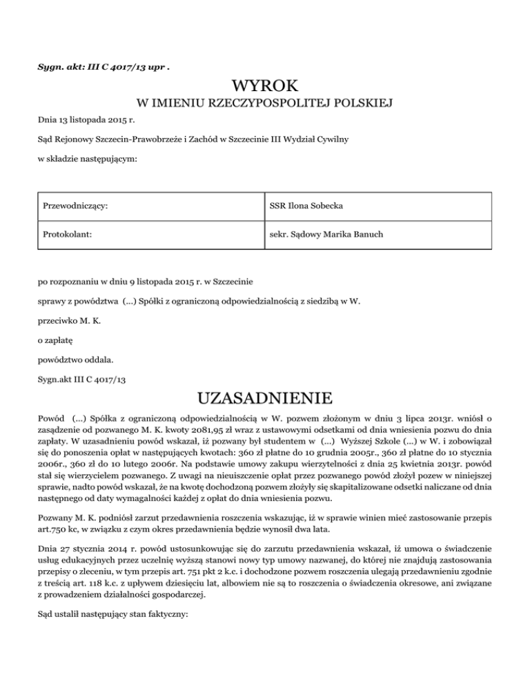 Sygn. akt: III C 4017/13 upr . WYROK W IMIENIU RZECZYPOSPOLITEJ POLSKIEJ Dnia 13 listopada 2015 r. Sąd Rejonowy Szczecin-Prawobrzeże i Zachód w Szczecinie III Wydział Cywilny w składzie następującym: Przewodniczący: SSR Ilona Sobecka Protokolant: sekr. Sądowy Marika Banuch po rozpoznaniu w dniu 9 listopada 2015 r. w Szczecinie sprawy z powództwa (...) Spółki z ograniczoną odpowiedzialnością z siedzibą w W. przeciwko M. K. o zapłatę powództwo oddala. Sygn.akt III C 4017/13 UZASADNIENIE Powód (...) Spółka z ograniczoną odpowiedzialnością w W. pozwem złożonym w dniu 3 lipca 2013r. wniósł o zasądzenie od pozwanego M. K. kwoty 2081,95 zł wraz z ustawowymi odsetkami od dnia wniesienia pozwu do dnia zapłaty. W uzasadnieniu powód wskazał, iż pozwany był studentem w (...) Wyższej Szkole (...) w W. i zobowiązał się do ponoszenia opłat w następujących kwotach: 360 zł płatne do 10 grudnia 2005r., 360 zł płatne do 10 stycznia 2006r., 360 zł do 10 lutego 2006r. Na podstawie umowy zakupu wierzytelności z dnia 25 kwietnia 2013r. powód stał się wierzycielem pozwanego. Z uwagi na nieuiszczenie opłat przez pozwanego powód złożył pozew w niniejszej sprawie, nadto powód wskazał, że na kwotę dochodzoną pozwem złożyły się skapitalizowane odsetki naliczane od dnia następnego od daty wymagalności każdej z opłat do dnia wniesienia pozwu. Pozwany M. K. podniósł zarzut przedawnienia roszczenia wskazując, iż w sprawie winien mieć zastosowanie przepis art.750 kc, w związku z czym okres przedawnienia będzie wynosił dwa lata. Dnia 27 stycznia 2014 r. powód ustosunkowując się do zarzutu przedawnienia wskazał, iż umowa o świadczenie usług edukacyjnych przez uczelnię wyższą stanowi nowy typ umowy nazwanej, do której nie znajdują zastosowania przepisy o zleceniu, w tym przepis art. 751 pkt 2 k.c. i dochodzone pozwem roszczenia ulegają przedawnieniu zgodnie z treścią art. 118 k.c. z upływem dziesięciu lat, albowiem nie są to roszczenia o świadczenia okresowe, ani związane z prowadzeniem działalności gospodarczej. Sąd ustalił następujący stan faktyczny: (...) Wyższa Szkoła (...) z siedzibą w W. uzyskała osobowość prawną w dniu 25 kwietnia 1994r. Od 7 grudnia 2000r. uzyskała uprawnienia do prowadzenia studiów magisterskich na kierunku „zarządzanie i marketing”. Dowód: - odpis z rejestru uczelni niepublicznych k. 44-45 W dniu 1 września 2004r. (...) Wyższa Szkoła (...) z siedzibą w W. zawarła z pozwanym M. K. kontrakt o świadczenie nauki, zapewniający pozwanemu miejsce na Wydziale Stosunków (...) i (...) na kierunku zarządzanie i marketing. Pozwany zobowiązał się na mocy niniejszego kontraktu do wpłat wpisowego oraz opłacania czesnego w terminach i wysokości ustalonej przez rektora uczelni. Dowód: - kontrakt z 1 września 2004r. k.46 Pozwany zobowiązany był do uiszczenia tytułem czesnego: - kwoty 360 zł do 10 grudnia 2005r., - kwoty 360 zł do 10 stycznia 2006r., - kwoty 360 zł do 10 lutego 2006r. Dowód: - rozliczenie z kontrahentem k.48 - zarządzenie Rektora nr (...) k.47 W dniu 25 kwietnia 2013 r. (...) Wyższa Szkoła (...) z siedzibą w W. zawarła z powodem (...) Spółką z ograniczoną odpowiedzialnością w W. umowę sprzedaży wierzytelności pieniężnych w stosunku do dłużników z tytułu świadczonych usług edukacyjnych, mocą której przeniosła na powoda wierzytelności określone w załączniku nr 1 do umowy. W wyciągu z tego załącznika wyszczególniono wierzytelność wobec pozwanego w kwocie 1080 zł. Dowód: - umowa cesji k.49 - wyciąg z załącznika k.50 Sąd zważył co następuję: Powództwo okazało się nieuzasadnione. Mając na uwadze stanowisko powoda wyrażone w pozwie i dalszych pismach procesowych, stwierdzić należy, iż powód wywodził swe roszczenia z umowy o świadczenie usług edukacyjnych zawartej przez pozwanego z (...) Wyższą Szkołą (...) z siedzibą w W.. Powód domagał się od pozwanego zapłaty czesnego za studia na tej uczelni za okres od grudnia 2005 r. do lutego 2006r. oraz ustawowych odsetek za opóźnienie w zapłacie tych świadczeń, wskazując, iż mocą umowy z dnia 25 kwietnia 2013 r. wierzytelności w tym zakresie nabył w drodze przelewu zgodnie z treścią art. 509 § 2 k.c. Zauważyć należy, iż pozwany nie kwestionował swojego zadłużenia wobec (...) Wyższej Szkoły (...) z siedzibą w W. oraz dokonania cesji wierzytelności z tego tytułu na rzecz powoda, natomiast zarzutem, który był podnoszony przez pozwanego był zarzut przedawnienia. W niniejszej sprawie roszczenia dochodzone pozwem powstały odpowiednio w dniu 10 grudnia 2005 r., 10 stycznia 2006 r., 10 lutego 2006 r., uznać więc należało, iż pozwany podnosząc zarzut ich przedawnienia skutecznie uchylił się od ich zaspokojenia w świetle art. 117 § 2 k.c. W pierwszej kolejności podnieść należy, iż ustawą z dnia 11 lipca 2014 r. o zmianie ustawy – Prawo o szkolnictwie wyższym oraz niektórych innych ustaw (Dz.U. 2014, poz. 1198) dokonano nowelizacji ustawy z dnia 27 lipca 2005r. Prawo o szkolnictwie wyższym dodając art. 160a, który w ust.7 wprowadził trzyletni okres przedawnienia dla roszczeń wynikających z umów zawartych między uczelnią a studentem w zakresie usług edukacyjnych. Nadto z mocy art. 32 ustawy z dnia 11 lipca 2014r. przepis art. 160a ust. 7 ustawy Prawo o szkolnictwie będzie miał zastosowanie do umów w sprawie warunków odpłatności za studia lub usługi edukacyjne, o których mowa w art. 99 ust. 1 ustawy, zawartych przed dniem wejścia zmian wprowadzonych ustawą z 11 lipca 2014r. W niniejszej sprawie pozew został złożony w dniu 3 lipca 2013r., a zatem po upływie terminu przedawnienia. W ocenie Sądu nawet w przypadku braku regulacji zawartej w art. 32 ustawy z dnia 11 lipca 2014r. powództwo również podlegałoby oddaleniu. Uwzględnić bowiem w tym zakresie należało przepis art. 751 pkt 2 k.c., zgodnie 