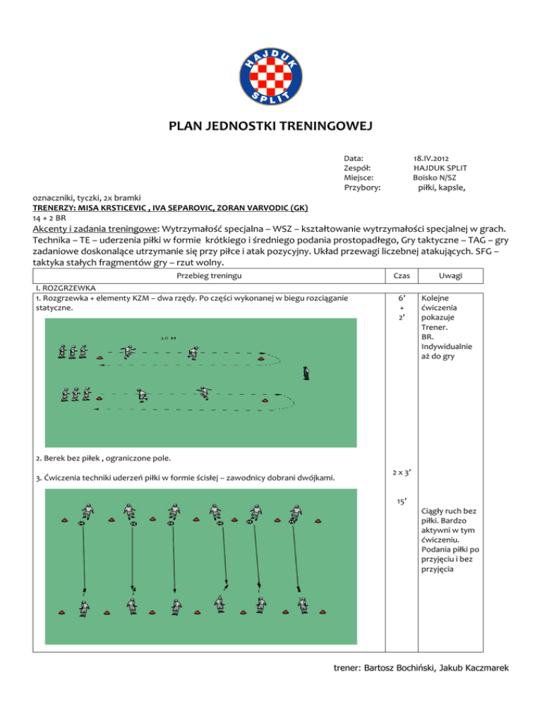 PLAN JEDNOSTKI TRENINGOWEJ Data: Zespół: Miejsce: 18.IV.2012 HAJDUK SPLIT Boisko N/SZ Przybory: piłki, kapsle, oznaczniki, tyczki, 2x bramki TRENERZY: MISA KRSTICEVIC , IVA SEPAROVIC, ZORAN VARVODIC (GK) 14 + 2 BR Akcenty i zadania treningowe: Wytrzymałość specjalna – WSZ – kształtowanie wytrzymałości specjalnej w grach. Technika – TE – uderzenia piłki w formie krótkiego i średniego podania prostopadłego, Gry taktyczne – TAG – gry zadaniowe doskonalące utrzymanie się przy piłce i atak pozycyjny. Układ przewagi liczebnej atakujących. SFG – taktyka stałych fragmentów gry – rzut wolny. Przebieg treningu Czas I. ROZGRZEWKA 1. Rozgrzewka + elementy KZM – dwa rzędy. Po części wykonanej w biegu rozciąganie statyczne. 6’ + 2’ Uwagi Kolejne ćwiczenia pokazuje Trener. BR. Indywidualnie aż do gry 2. Berek bez piłek , ograniczone pole. 3. Ćwiczenia techniki uderzeń piłki w formie ścisłej – zawodnicy dobrani dwójkami. 2 x 3’ 15’ Ciągły ruch bez piłki. Bardzo aktywni w tym ćwiczeniu. Podania piłki po przyjęciu i bez przyjęcia trener: Bartosz Bochiński, Jakub Kaczmarek II. CZĘŚĆ GŁÓWNA 1. Technika uderzeń piłki w formie podania prostopadłego. Akcent ruchu od piłki po podaniu. Zawodnicy dobrani w dwójki. Zmiany zawodnika „wychodzącego” do podania prostopadłego. 2. Gra taktyczna z zadaniem utrzymania się przy piłce i zdobyciu punktowanej strefy złożonej z dwóch tyczek. Pole gry 30x 20. Układ zespołów 7x7. 10’ Każdy zawodnik ind. 10x 20’ Bardzo dobra arytmia w tym ćwiczeniu: wolno – wolno w fazie przygotowawczej, szybko – dynamicznie w fazie właściwej. Punkt za: podanie do partnera przez strefę / przeprowadzenie piłki przez strefę / po podaniu do partnera przez strefę podanie max 2 kontakty do „3 opcji – zawodnika”. 3. Fragment gry taktycznej doskonalącej atak pozycyjny. Układ zawodników 8 x 6. Ustawienie w ataku 4-3-1 , w obronie – 4 – 2. Połowa boiska. 25’ 4. SFG – rzut wolny bezpośredni z wykorzystaniem „sztucznego muru”. 5 zawodników indywidualnie oddawało strzał do bramki. Pozostali organizowali się w ataku i obronie strefowej.. 20’ III. CZĘŚĆ KOŃCOWA 1. Indywidualne ćwiczenia wzmacniające mięśnie brzucha i grzbietu / trucht / ćwiczenia oddechowe. 10’ Uwaga po treningowa: mało zdobytych bramek. Każdy zawodnik indywidualnie kończył trening. trener: Bartosz Bochiński, Jakub Kaczmarek