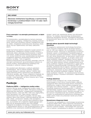 SNC-DF85P Sieciowa minikamera kopułkowa o wzmocnionej konstrukcji z przetwornikiem CCD 1/3 cala i technologią DynaView Praca wewnątrz i na zewnątrz pomieszczeń, w dzień i w nocy Ta funkcjonalna, wandaloodporna kamera sieciowa wykorzystuje wydajną i inteligentną metodę przetwarzania, która jest określana mianem inteligentnej analizy wideo. Urządzenie automatycznie decyduje, kiedy obraz ma być rejestrowany lub kiedy uaktywnić alarm. Dzięki tej funkcji kamera zapewnia wysoki poziom zabezpieczenia, dodatkowo wysoka czulość kamery i doskonały obraz ułatwiają monitorowanie w każdych warunkach. Dzięki przetwornikowi DynaView typu 1/3, funkcji dzień/noc oraz wandaloodpornej budowie urządzenie zapewnia niezawodną pracę przez 24 godziny na dobę, 7 dni w tygodniu. Kamera przeznaczona jest do pracy wewnątrz oraz na zewnątrz pomieszczeń, jej przemyślana budowa zapewnia szybką i bezproblemową instalację oraz swobodę w wyborze miejsca instalacji. Ten produkt jest oferowany z pełnym pakietem PrimeSupport. Jest to oferta szybkiej, bezproblemowej obsługi w zakresie napraw i infolinii oferującej fachową pomoc techniczną oraz bezpłatne użyczenie sprzętu, gdy Twoje urządzenie znajduje się w naprawie. Oprócz tego możesz zachować spokój umysłu i mieć pewność, że Sony troszczy się o Twoje urządzenia i Twoją firmę. Funkcje Platforma DEPA — inteligentna analiza wideo Kamera oferuje opcje inteligentnej analizy wideo, w oparciu o platformę Sony DEPA. Narzędzia analityczne obejmują dwa elementy: zintegrowane inteligentne funkcje kamery, takie jak IMD i IOD oraz reguły/filtry, które decydują o tym, jakie obrazy mają być rejestrowane lub w jakim przypadku ma być aktywowany alarm.Gdy kamery realizują detekcję IMD lub IOD, wtedy „oznaczone” obiekty oraz powiązane z nimi metadane, w tym również dane położenia obiektów, są wysyłane do urządzenia rejestrującego serii NSR lub do oprogramowania serii IMZ-RS400. Następnie te produkty korzystają z metadanych wraz z odpowiednimi filtrami w celu przeanalizowania ruchu obiektów oraz wykonania wcześniej zdefiniowanych www.pro.sony.eu/videosecurity działań, takich jak rejestracja obrazu lub aktywacja alarmu. Ta metoda rozproszonego przetwarzania ogranicza obciążenie serwera, wymagania dotyczące przepustowości łącza oraz ilości miejsca do archiwizacji danych. Szeroki zakres dynamiki dzięki technologii DynaView W urządzeniu zastosowano technologię DynaView, która znacznie zwiększa zakres dynamiki kamery — jest on 128 razy większy niż w przypadku konwencjonalnych kamer. Owocuje to reprodukcją wyraźnych obrazów nawet w środowiskach charakteryzujących się niezwykle wysokim kontrastem. Kamera rejestruje ten sam obraz dwukrotnie: za pierwszym razem przy normalnej szybkości migawki, za drugim razem przy dużej szybkości migawki. Następnie ciemne obszary obrazu zarejestrowane przy normalnej szybkości migawki oraz jasne obszary obrazu zarejestrowane przy dużej szybkości migawki są zestawiane w jeden obraz za pomocą zaawansowanego rozwiązania DSP LSI. Ponadto, ponieważ oba te ujęcia o wysokim kontraście mogą charakteryzować się innymi warunkami oświetleniowymi, stosowane są dwa układy balansu bieli: jeden dla normalnej szybkości migawki, drugi dla dużej szybkości migawki. Ta zaawansowana technika zapewnia obrazy o wysokim kontraście i odpowiednich kolorach. Funkcja dzień/noc Kamera może przełączyć się z trybu dziennego (kolorowego) w tryb nocny (czarno-biały), poprzez zastąpienie filtra podczerwonego filtrem neutralnym. Użytkownicy mogą w różny sposób przełączać się pomiędzy tymi dwoma trybami — ręcznie, zgodnie z wcześniej ustalonym harmonogramem, z użyciem zewnętrznego czujnika lub automatycznie — zgodnie z warunkami oświetlenia sceny. Kamera pracując w trybie nocnym charakteryzuje się wysokim poziomem czułości na podświetlenie podczerwone bliskiego pola, dzięki czemu może ona pracować nawet przy braku oświetlenia. Dynamiczna integracja klatek Te kamery są wyposażone w technologię dynamicznej integracji klatek (DFI), która zapewnia reprodukcję wyraźnych obrazów, które zawierają nieruchome, jak również ruchome obiekty. Technologia DFI wykrywa ruch w kadrze i przedstawia te obszary z minimalnym 1 SNC-DF85P rozmazaniem (obszary z minimalnym poruszeniem lub bez poruszenia są wyświetlane w sposób naturalny, z minimalnie poszarpanymi krawędziami). Ten unikatowy algorytm wykorzystuje również zalety przetwornika CCD ze skanowaniem z przeplotem, który sam w sobie jest bardziej czuły niż przetworniki CCD ze skanowaniem progresywnym, dzięki czemu umożliwia uzyskanie wyrazistego obrazu nawet przy słabym oświetleniu. podczas czynności monitoringu i rejestrowania. Funkcja ta idealnie nadaje się do łatwej identyfikacji dokładnej daty i czasu zdarzenia podczas odtwarzania. Ma również zastosowanie w przypadku przekazywania materiału dowodowego wideo odpowiednim władzom, ponieważ te informacje stają się częścią obrazu wideo. Imponujące powiększenie 3,6x, obiektyw zmiennoogniskowy Dzięki zmiennoogniskowemu obiektywowi z 3,6-krotnym powiększeniem,kamery te oferują niespotykanie szeroki zakres kątów widzenia: od 100,8° (szeroki kąt) do 27,7° (teleobiektyw). To sprawia, że sprawdzają się one w wielu różnych zastosowaniach i lokalizacjach. Formaty kompresji do wyboru: JPEG, MPEG-4, H.264 Te wielokodekowe kamery obsługują trzy formaty kompresji: JPEG, MPEG-4 i H.264. Format kompresji — JPEG, który jest standardem branżowym jest najlepszym wyborem w przypadku zdjęć o wysokiej jakości. MPEG-4 zapewnia przesyłanie w sieci wyrazistych obrazów ruchomych, wtedy gdy występują ograniczenia w zakresie przepustowości. Format H.264 zapewnia dwukrotnie wyższą skuteczność od MPEG-4, tam gdzie przepustowość jest jeszcze bardziej ograniczona. Inteligentna detekcja ruchu (IMD) Zintegrowana 
