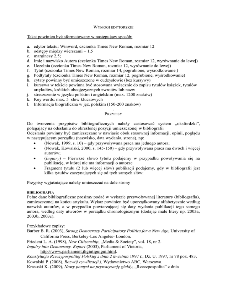 WYMOGI EDYTORSKIE Tekst powinien być sformatowany w następujący sposób: edytor tekstu: Winword, czcionka Times New Roman, rozmiar 12 odstępy między wierszami – 1,5 marginesy 2,5; Imię i nazwisko Autora (czcionka Times New Roman, rozmiar 12, wyrównanie do lewej) Uczelnia (czcionka Times New Roman, rozmiar 12, wyrównanie do lewej) Tytuł (czcionka Times New Roman, rozmiar 14, pogrubione, wyśrodkowanie ) Podtytuły (czcionka Times New Roman, rozmiar 12, pogrubione, wyśrodkowanie) cytaty powinny być umieszczone w cudzysłowie (bez kursywy) kursywa w tekście powinna być stosowana wyłącznie do zapisu tytułów książek, tytułów artykułów, krótkich obcojęzycznych zwrotów lub nazw j. streszczenie w języku polskim i angielskim (max. 1200 znaków) k. Key words: max. 5 słów kluczowych l. Informacja biograficzna w jęz. polskim (150-200 znaków) . PRZYPISY a. b. c. d. e. f. g. h. i. Do tworzenia przypisów bibliograficznych należy zastosować system „oksfordzki”, polegający na odesłaniu do określonej pozycji umieszczonej w bibliografii Odesłania powinny być zamieszczane w nawiasie obok stosownej informacji, opinii, poglądu w następującym porządku (nazwisko, data wydania, strona), np: (Nowak, 1999, s. 10) – gdy przywoływana praca ma jednego autora; (Nowak, Kowalski, 2000, s. 145-150) – gdy przywoływana praca ma dwóch i więcej autorów; (Inquiry) – Pierwsze słowo tytułu podajemy w przypadku powoływania się na publikację, w której nie ma informacji o autorze Fragment tytułu (2 lub więcej słów) publikacji podajemy, gdy w bibliografii jest kilka tytułów zaczynających się od tych samych słów: Przypisy wyjaśniające należy umieszczać na dole strony BIBLIOGRAFIA Pełne dane bibliograficzne prosimy podać w wykazie przywoływanej literatury (bibliografia), zamieszczonej na końcu artykułu. Wykaz powinien być uporządkowany alfabetycznie według nazwisk autorów, a w przypadku powtarzającej się daty wydania publikacji tego samego autora, według daty utworów w porządku chronologicznym (dodając małe litery np. 2003a, 2003b, 2003c). Przykładowe zapisy: Barber B. R. (2003), Strong Democracy Participatory Politics for a New Age, University of California Press, Berkeley-Los Angeles- London. Friedent L. A. (1998), New Citizenship, „Media & Society”, vol. 18, nr 2. Inquiry into Democracy. Report (2003), Parliament of Victoria, http://www.parliament.jhgiutiguigui,html. Konstytucja Rzeczypospolitej Polskiej z dnia 2 kwietnia 1997 r., Dz. U. 1997, nr 78 poz. 483. Kowalski P. (2008), Rozwój cywilizacji j, Wydawnictwo ABC, Warszawa. Krasuski K. (2009), Nowy pomysł na prywatyzację giełdy, „Rzeczpospolita” z dnia 27.11.2009 r. Miserez M.-A., Switzerland: a country of politicians, 24.08.2009, Swissinfo.ch, http://www.swissinfo.ch/eng/specials/switzerland_for_the_record/world_records/Switz erland:_a_country_of_politicians.html?cid=669352, 15.10.2012. Nowak R. (1999), Władza i demokracja, [w:] Demokracja i władza, red. J. Kowalski, Wydawnictwo XYZ, Warszawa. Rybińska A. „Nie” dla rozbrojenia narodu, 14.02.2011, „Rzeczpospolita”, http://www.rp.pl/artykul/611851_-Nie--dla-rozbrojenia-narodu.html. 15.10.2012. TABELE, WYKRESY I RYSUNKI Każdy wykres, tabela, rysunek itp. powinien być opisany z podaniem tytułu (Times New Roman, bold, 10) oraz wskazaniem źródła (Times New Roman, 10). Tytuł powinien być zamieszczony nad, a informacja o źródle – pod prezentowanym wykresem, tabelą lub rysunkiem. Do tekstu należy dołączyć informacje dotyczące autora: a. Pełne imię i nazwisko b. Stopień, tytuł naukowy c. Dokładny adres korespondencyjny, z numerem telefonu oraz e-mailem