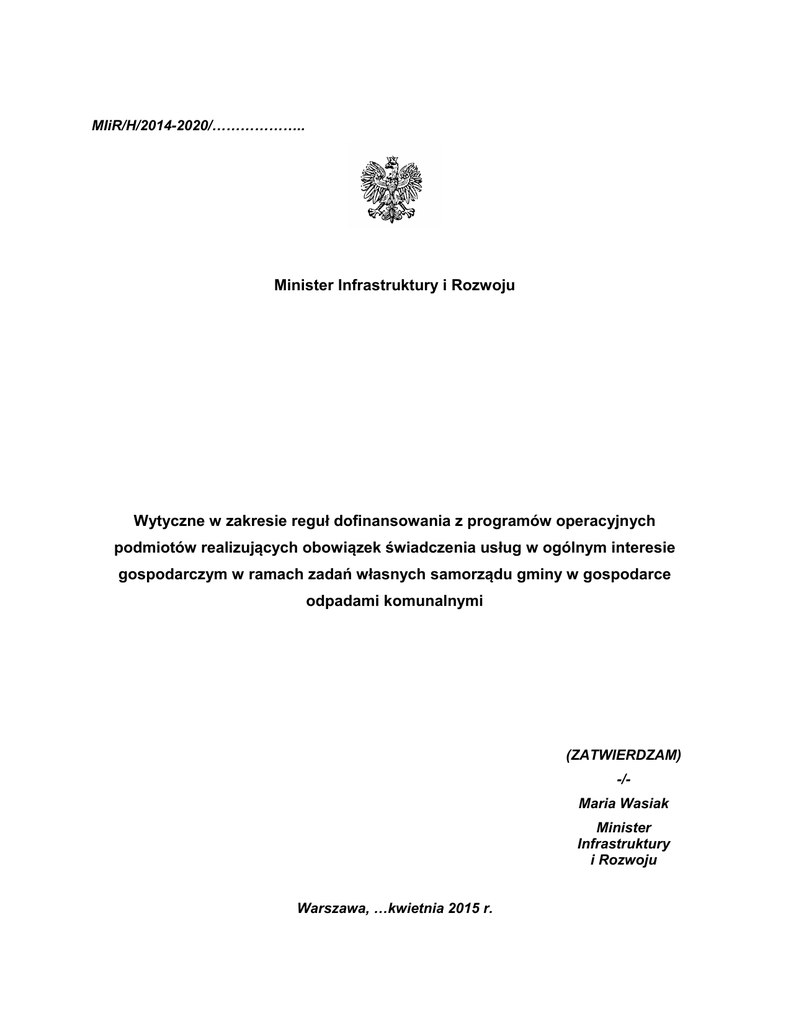 MIiR/H/2014-2020/……………….. Minister Infrastruktury i Rozwoju Wytyczne w zakresie reguł dofinansowania z programów operacyjnych podmiotów realizujących obowiązek świadczenia usług w ogólnym interesie gospodarczym w ramach zadań własnych samorządu gminy w gospodarce odpadami komunalnymi (ZATWIERDZAM) -/Maria Wasiak Minister Infrastruktury i Rozwoju Warszawa, …kwietnia 2015 r. Spis treści Wykaz skrótów .............................................................................................................................. 4 Rozdział 1 – Podstawa prawna ..................................................................................................... 5 Rozdział 2 – Definicje .................................................................................................................... 7 Rozdział 3 – Zakres zastosowania Wytycznych ........................................................................ 11 Rozdział 4 – Cel i przedmiot Wytycznych .................................................................................. 12 Rozdział 5 – Pomoc publiczna a usługi w ogólnym interesie gospodarczym ......................... 15 w prawie unijnym ........................................................................................................................ 15 Podrozdział 5.1 – Brak pomocy publicznej w rozumieniu art. 107 ust. 1 TFUE ................... 16 Podrozdział 5.2 – Pomoc zgodna z rynkiem wewnętrznym i niepodlegająca notyfikacji ... 18 Podrozdział 5.3 – Pomoc, która może zostać uznana za zgodną z zasadami rynku wewnętrznego przez Komisję Europejską ............................................................................. 20 Rozdział 6 – Zobowiązanie do świadczenia usług w ogólnym interesie gospodarczym ........ 21 Podrozdział 6.1 – Uwagi wstępne ........................................................................................... 21 Sekcja 6.1.1 – Uwagi o charakterze technicznym ................................................................ 21 Sekcja 6.1.2 – Relacje pomiędzy Decyzją KE 2012/21/UE a Decyzją KE 2005/842/WE ..... 21 Podrozdział 6.2 – Kilka usług .................................................................................................. 22 Podrozdział 6.3 – Możliwe sposoby powierzenia świadczenia usług................................... 22 Sekcja 6.3.1 – Sposób zobowiązania do świadczenia usług w ogólnym interesie gospodarczym ...................................................................................................................... 24 Sekcja 6.3.2 – Określenie szczegółowego zakresu obowiązku świadczenia usług w ogólnym interesie gospodarczym ...................................................................................... 24 Sekcja 6.3.3 – Sposób wyboru podmiotu.............................................................................. 25 Podrozdział 6.4 – Samorządowy zakład budżetowy .............................................................. 25 Sekcja 6.4.1 – Uwagi wstępne.............................................................................................. 25 Sekcja 6.4.2 – Sposób zobowiązania do świadczenia usług w ogólnym interesie gospodarczym ...................................................................................................................... 25 Sekcja 6.4.3 – Określenie szczegółowego zakresu obowiązku świadczenia usług w ogólnym interesie gospodarczym ...................................................................................... 26 Sekcja 6.4.4 – Sposób wyboru podmiotu.............................................................................. 27 Podrozdział 6.5 – Spółka komunalna...................................................................................... 27 Sekcja 6.5.1 – Uwagi wstępne.............................................................................................. 27 2 Sekcja 6.5.2 – Sposób zobowiązania do świadczenia usług w ogólnym interesie gospodarczym ...................................................................................................................... 28 Sekcja 6.5.3 – Określenie szczegółowego zakresu obowiązku świadczenia usług w ogólnym interesie gospodarczym ...................................................................................... 28 Sekcja 6.5.4 – Sposób wyboru podmiotu.............................................................................. 29 Podrozdział 6.6 – Możliwość wprowadzenia zmian do umowy o świadczenie usług w ogólnym interesie gospodarczym....................................................................................... 30 Rozdział 7 – Ubieganie się o dofinansowanie ........................................................................... 31 Rozdział 8 – Rekompensata ........................................................................................................ 35 Podrozdział 8.1 – Ogólne wytyczne do obliczenia wysokości rekompensaty ..................... 35 Podrozdział 8.2 – Obliczanie wysokości dofinansowania ..................................................... 41 Podrozdział 8.3 – Kontrola nadwyżek i reguły zwrotu rekompensaty ................................. 42 Rozdział 9 – Przejrzystość stosunków finansowych ................................................................ 43 Rozdział 10 – Sprawozdawczość................................................................................................ 44 Rozdział 11 – Postanowienia końcowe .......................................................................................... 45 Załącznik 1 – Zasady obliczania wewnętrznej stopy zwrotu (IRR – Internal Rate of Return).......... 47 3 Wykaz skrótów IBOR - Interbank Offered Rate KE - Komisja Europejska TFUE - Traktat o funkcjonowaniu Unii Europejskiej TSUE - T