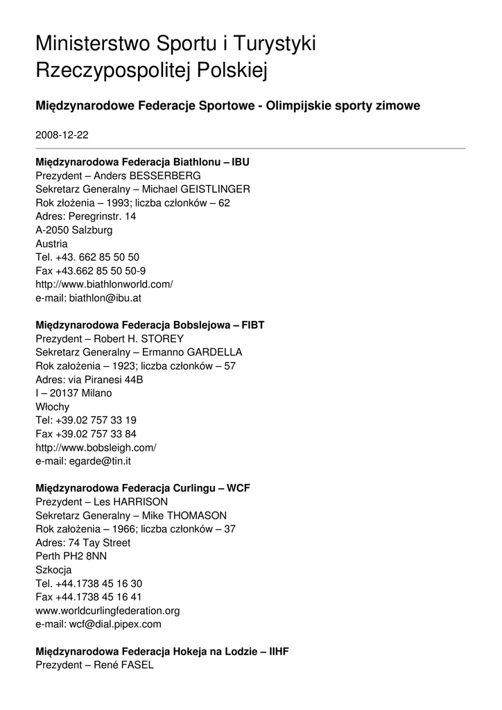 Ministerstwo Sportu i Turystyki Rzeczypospolitej Polskiej Międzynarodowe Federacje Sportowe - Olimpijskie sporty zimowe 2008-12-22 Międzynarodowa Federacja Biathlonu – IBU Prezydent – Anders BESSERBERG Sekretarz Generalny – Michael GEISTLINGER Rok złożenia – 1993; liczba członków – 62 Adres: Peregrinstr. 14 A-2050 Salzburg Austria Tel. +43. 662 85 50 50 Fax +43.662 85 50 50-9 http://www.biathlonworld.com/ e-mail: [email protected] Międzynarodowa Federacja Bobslejowa – FIBT Prezydent – Robert H. STOREY Sekretarz Generalny – Ermanno GARDELLA Rok założenia – 1923; liczba członków – 57 Adres: via Piranesi 44B I – 20137 Milano Włochy Tel: +39.02 757 33 19 Fax +39.02 757 33 84 http://www.bobsleigh.com/ e-mail: [email protected] Międzynarodowa Federacja Curlingu – WCF Prezydent – Les HARRISON Sekretarz Generalny – Mike THOMASON Rok założenia – 1966; liczba członków – 37 Adres: 74 Tay Street Perth PH2 8NN Szkocja Tel. +44.1738 45 16 30 Fax +44.1738 45 16 41 www.worldcurlingfederation.org e-mail: [email protected] Międzynarodowa Federacja Hokeja na Lodzie – IIHF Prezydent – René FASEL Sekretarz generalny – Horst LICHTNER Rok założenia – 1908; liczba członków – 63 Adres: Brandschenkestr. 50 Postfach CH- 8027 Zurich Szwajcaria Tel. +41.1 562 22 00 Fax +41.1 562 22 29 http://www.iihf.com/ e-mail: [email protected] Międzynarodowa Federacja Łyżwiarska – ISU Prezes – Ottavio CINQUANTA Dyrektor Generalny – Fredi SCHMID Rok założenia – 1892; liczba członków – 73 Adres: Chemin de Primerose 2 CH-1007 Lausanne Szwajcaria Tel. +41.21 612 66 66 Fax +41.21 612 66 77 http://www.isu.org/ e-mail: [email protected] Międzynarodowa Federacja Narciarska – FIS Prezes – Gian-Franco KASPER Sekretarz Generalny – Sarah LEWIS Rok założenia – 1924; liczba członków – 101 Adres: Marc Hodler House Blochstr. 2 CH – 3653 Oberhofen AM Thunersee Szwajcaria Tel. +41.33 244 61 61 Fax +41.33 244 61 71 http://www.fis-ski.com e-mail: [email protected] Międzynarodowa Federacja Saneczkowa – FIL Prezes – Josef FENDT Sekretarz Generalny – Svein ROMSTAD Rok założenia – 1957; liczba członków – 48 Adres: Rathausplatz 9 D-83471 Berchtesgaden Niemcy Tel. + 49.8652 669 60 Fax +49.8652 669 69 http://www.fil-luge.org/ e-mail: [email protected]
