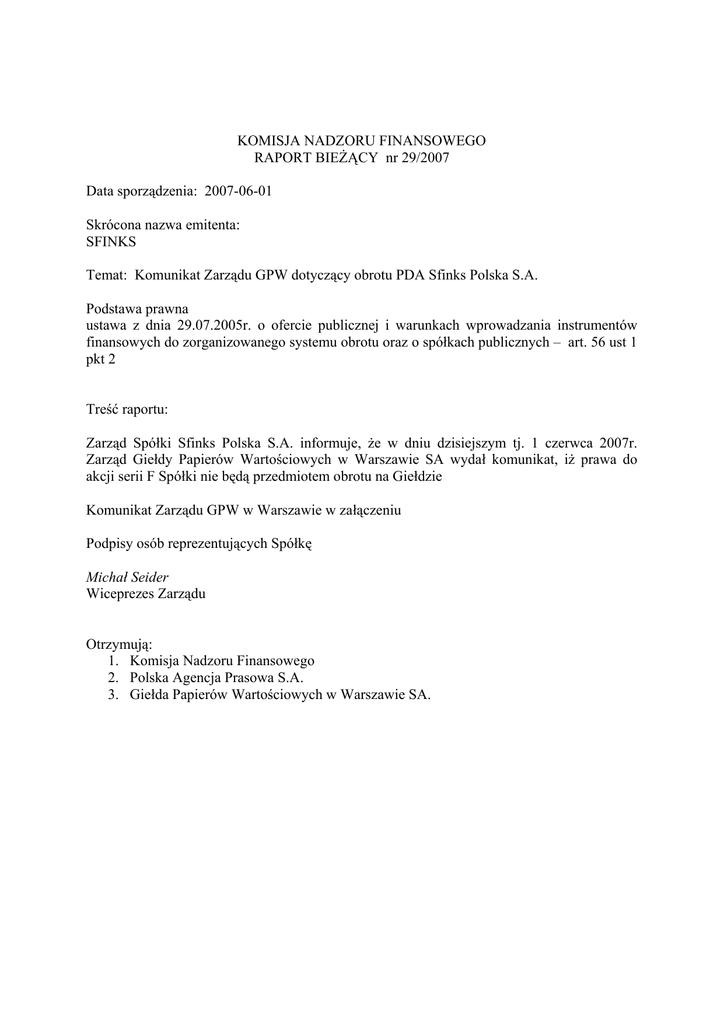 KOMISJA NADZORU FINANSOWEGO RAPORT BIEŻĄCY nr 29/2007 Data sporządzenia: 2007-06-01 Skrócona nazwa emitenta: SFINKS Temat: Komunikat Zarządu GPW dotyczący obrotu PDA Sfinks Polska S.A. Podstawa prawna ustawa z dnia 29.07.2005r. o ofercie publicznej i warunkach wprowadzania instrumentów finansowych do zorganizowanego systemu obrotu oraz o spółkach publicznych – art. 56 ust 1 pkt 2 Treść raportu: Zarząd Spółki Sfinks Polska S.A. informuje, że w dniu dzisiejszym tj. 1 czerwca 2007r. Zarząd Giełdy Papierów Wartościowych w Warszawie SA wydał komunikat, iż prawa do akcji serii F Spółki nie będą przedmiotem obrotu na Giełdzie Komunikat Zarządu GPW w Warszawie w załączeniu Podpisy osób reprezentujących Spółkę Michał Seider Wiceprezes Zarządu Otrzymują: 1. Komisja Nadzoru Finansowego 2. Polska Agencja Prasowa S.A. 3. Giełda Papierów Wartościowych w Warszawie SA.