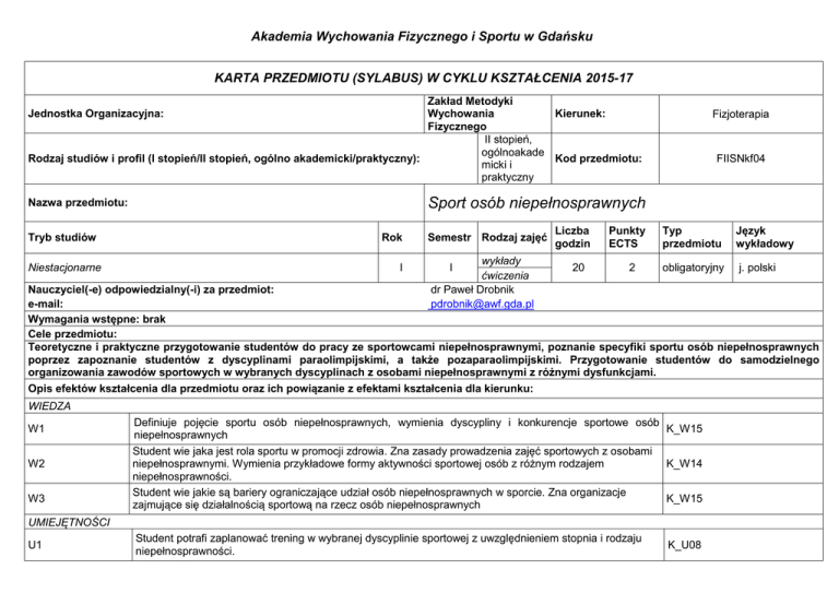 Akademia Wychowania Fizycznego i Sportu w Gdańsku KARTA PRZEDMIOTU (SYLABUS) W CYKLU KSZTAŁCENIA 2015-17 Zakład Metodyki Wychowania Kierunek: Fizycznego II stopień, ogólnoakade Rodzaj studiów i profil (I stopień/II stopień, ogólno akademicki/praktyczny): Kod przedmiotu: micki i praktyczny Jednostka Organizacyjna: Niestacjonarne FIISNkf04 Sport osób niepełnosprawnych Nazwa przedmiotu: Tryb studiów Fizjoterapia Rok I Semestr Rodzaj zajęć wykłady ćwiczenia dr Paweł Drobnik [email protected] I Liczba godzin 20 Punkty ECTS 2 Typ przedmiotu Język wykładowy obligatoryjny j. polski Nauczyciel(-e) odpowiedzialny(-i) za przedmiot: e-mail: Wymagania wstępne: brak Cele przedmiotu: Teoretyczne i praktyczne przygotowanie studentów do pracy ze sportowcami niepełnosprawnymi, poznanie specyfiki sportu osób niepełnosprawnych poprzez zapoznanie studentów z dyscyplinami paraolimpijskimi, a także pozaparaolimpijskimi. Przygotowanie studentów do samodzielnego organizowania zawodów sportowych w wybranych dyscyplinach z osobami niepełnosprawnymi z różnymi dysfunkcjami. Opis efektów kształcenia dla przedmiotu oraz ich powiązanie z efektami kształcenia dla kierunku: WIEDZA W1 W2 W3 Definiuje pojęcie sportu osób niepełnosprawnych, wymienia dyscypliny i konkurencje sportowe osób K_W15 niepełnosprawnych Student wie jaka jest rola sportu w promocji zdrowia. Zna zasady prowadzenia zajęć sportowych z osobami niepełnosprawnymi. Wymienia przykładowe formy aktywności sportowej osób z różnym rodzajem K_W14 niepełnosprawności. Student wie jakie są bariery ograniczające udział osób niepełnosprawnych w sporcie. Zna organizacje K_W15 zajmujące się działalnością sportową na rzecz osób niepełnosprawnych UMIEJĘTNOŚCI U1 Student potrafi zaplanować trening w wybranej dyscyplinie sportowej z uwzględnieniem stopnia i rodzaju niepełnosprawności. K_U08 U2 U3 KOMPETENCJE Student umie przygotować zawody sportowe dla osób niepełnosprawnych. Student potrafi wykonać poszczególne elementy techniczne w wybranej dyscyplinie sportowej K1 Student omawia błędy techniczne wynikające z przepisów w wybranej dyscyplinie sportowej. K2 Student współpracuje z kolegami, wymienia poglądy w grupie oraz z prowadzącym lub z trenerem K_U24 K_U22 K_K02 K_K08 KRYTERIA I METODY OCENY OSIĄGNIĘTYCH EFEKTÓW KSZTAŁCENIA -:PODSTAWOWE KRYTERIA U1-U3, K1-K2 - przygotowanie i prowadzenie fragmentu treningu w wybranej dyscyplinie sportu osób niepełnosprawnych - ocena eksperta składa się ze zgodności ze standardem, innowacyjności, przestrzegania zasad bezpieczeństwa oraz poprawności merytorycznej, wykonanie pracy zaliczeniowej: przygotowanie prezentacji w zespołach – oceniana według wyznaczonych kryteriów: zgodność treści z tematem, korzystanie z literatury przedmiotu (min. 5), oraz forma przedstawienia – ocena eksperta. Ustalenie oceny zaliczeniowej na podstawie ocen cząstkowych otrzymywanych w trakcie trwania semestru za określone wyżej wymienione działania pracy studenta. Studenci, którzy otrzymają ocenę bardzo dobrą z ćwiczeń oraz będą uczestniczyć w przynajmniej 80% wykładach zostaną zwolnieni ze sprawdzianu wiadomości (wiedzy) z treści wykładowej. W1-W3 - sprawdzian wiadomości w formie testu mieszanego, czyli jednokrotnego wyboru i uzupełnień. Zaliczenie otrzymają studenci, którzy udzielą 50% poprawnych odpowiedzi. Aby uzyskać zaliczenie przedmiotu na ocenę dostateczną student musi osiągnąć wszystkie wymienione przedmiotowe efekty kształcenia. Metody i formy realizacji przedmiotu: Wykłady z wykorzystaniem sprzętu audiowizualnego. Ćwiczenia: zajęcia o charakterze warsztatowym, praca indywidualna, w parach i zespołach kilkuosobowych, zajęcia praktyczne na sali gimnastycznej Treści kształcenia – ćwiczenia: 1. Sport osób niepełnosprawnych. Historia sportu osób niepełnosprawnych w Polsce i na świecie. 2 – 6. Charakterystyka wybranych dyscyplin letnich i zimowych sportu paraolimpijskiego, deflimpijskiego oraz Olimpiad Specjalnych. 7-8. Środki, metody i formy treningu w zależności od jednostki chorobowej, rodzaju i stopnia niepełnosprawności w wybranych dyscyplinach indywidualnych i zespołowych 9. Cele i zadania sportu osób niepełnosprawnych. 10. Klasyfikacja medyczna i funkcjonalna w sporcie niepełnosprawnych. 11. Pływanie osób niepełnosprawnych. 12. Sportowe gry zespołowe dla zawodników niedowidzących, niewidomych i ociemniałych na przykładzie goal balla. 13. Piłka siatkowa rozgrywana w pozycji siedzącej. 14. Lekkoatletyka dla osób niepełnosprawnych. Konkurencje biegów i wyścigów na wózkach, rzutów oraz skoków. 15. Piłka koszykowa na wózkach, dysfunkcje w obrębie narządu ruchu uprawniające do gry. 16. Rugby dla osób niepełnosprawnych, dysfunkcje uprawniające do gry. 17. Boccia dla osób niepełnosprawnych. 18. Tenis stołowy dla osób niepełnosprawnych. 19-20. Trening sportowy i organizacja zawodów dla niepełnosprawnych. Ćwiczenia: zaliczenie na ocenę Forma zaliczenia: Wykład: przedmiot kończy się zaliczeniem z ocenę Literatura: Literatura podstawowa: 1. Beck J., Sport w rehabilitacji inwalidów. AWF Warszawa 1977. 2. Bolach E., Sportowe gry zespołowe w usprawnianiu osób niewidomych i niedowidzących. AWF Wrocław 1999 3. Damentko M., IX Światowe Letnie Igrzyska Olimpiad Specjalnych - igrzyskami promocji i integracji "Szkoła Specjalna" - 1996,nr 2, s. 118-121. 5. Prystupa E., Bolach E., Prystupa T., Bolach B. Dyscypliny Sportowe i Tendencje Kształtowania Programów Zawodów Sportowych na Igrzyskach Paraolimpijskich. W: Aktywność ruchowa osób niepełnosprawnych. Monografia. Red. Migasiewicz J, Bolach E. Polskie Towarzystwo Walki z Kalectwem, Oddział Wrocław, AWF, Wrocław 2004, ss. 117 – 130 6. Ślężyński J. Sport w rehabilitacji niepełnosprawnych. PSON, Kraków 1999 7. Zespół redakcyjny Hady-Bartkowiak K., Vademecum Sport Niepełnosprawnych Przepisy i regulami