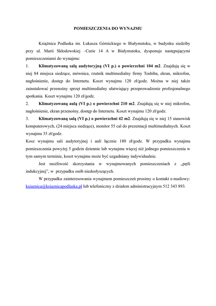 POMIESZCZENIA DO WYNAJMU Książnica Podlaska im. Łukasza Górnickiego w Białymstoku, w budynku siedziby przy ul. Marii Skłodowskiej –Curie 14 A w Białymstoku, dysponuje następującymi pomieszczeniami do wynajmu: 1. Klimatyzowaną salą audytoryjną (VI p.) o powierzchni 104 m2. Znajdują się w niej 84 miejsca siedzące, mównica, rzutnik multimedialny firmy Toshiba, ekran, mikrofon, nagłośnienie, dostęp do Internetu. Koszt wynajmu 120 zł/godz. Można w niej także zainstalować przenośny sprzęt multimedialny ułatwiający przeprowadzenie profesjonalnego spotkania. Koszt wynajmu 120 zł/godz. 2. Klimatyzowaną aulą (VI p.) o powierzchni 210 m2. Znajdują się w niej mikrofon, nagłośnienie, ekran przenośny, dostęp do Internetu. Koszt wynajmu 120 zł/godz. 3. Klimatyzowaną salą (VI p.) o powierzchni 42 m2. Znajdują się w niej 15 stanowisk komputerowych, (24 miejsca siedzące), monitor 55 cal do prezentacji multimedialnych. Koszt wynajmu 35 zł/godz. Kosz wynajmu sali audytoryjnej i auli łącznie 180 zł/godz. W przypadku wynajmu pomieszczenia powyżej 5 godzin dziennie lub wynajmu więcej niż jednego pomieszczenia w tym samym terminie, koszt wynajmu może być uzgadniany indywidualnie. Jest możliwość skorzystania w wynajmowanych pomieszczeniach z „pętli indukcyjnej”, w przypadku osób niedosłyszących. W przypadku zainteresowania wynajmem pomieszczeń prosimy o kontakt e-mailowy: [email protected] lub telefoniczny z działem administracyjnym 512 343 893.