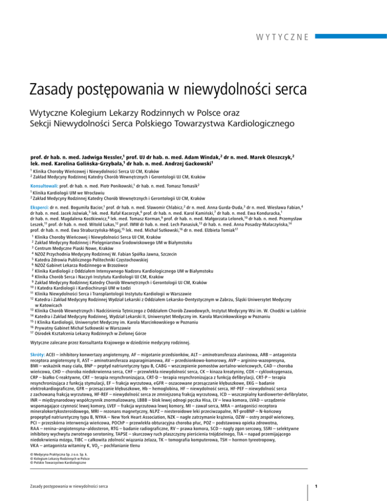 W Y T YCZNE Zasady postępowania w niewydolności serca Wytyczne Kolegium Lekarzy Rodzinnych w Polsce oraz Sekcji Niewydolności Serca Polskiego Towarzystwa Kardiologicznego prof. dr hab. n. med. Jadwiga Nessler,1 prof. UJ dr hab. n. med. Adam Windak, 2 dr n. med. Marek Oleszczyk, 2 lek. med. Karolina Golińska‑Grzybała,1 dr hab. n. med. Andrzej Gackowski1 1 2 Klinika Choroby Wieńcowej i Niewydolności Serca UJ CM, Kraków Zakład Medycyny Rodzinnej Katedry Chorób Wewnętrznych i Gerontologii UJ CM, Kraków Konsultowali: prof. dr hab. n. med. Piotr Ponikowski,1 dr hab. n. med. Tomasz Tomasik 2 Kardiologii UM we Wrocławiu 2 Zakład Medycyny Rodzinnej Katedry Chorób Wewnętrznych i Gerontologii UJ CM, Kraków 1 Klinika Eksperci: dr n. med. Bogumiła Bacior,1 prof. dr hab. n. med. Sławomir Chlabicz,2 dr n. med. Anna Gurda‑Duda,3 dr n. med. Wiesława Fabian,4 dr hab. n. med. Jacek Joźwiak,5 lek. med. Rafał Kacorzyk,6 prof. dr hab. n. med. Karol Kamiński,7 dr hab. n. med. Ewa Konduracka,1 dr hab. n. med. Magdalena Kostkiewicz,8 lek. med. Tomasz Korman,9 prof. dr hab. n. med. Małgorzata Lelonek,10 dr hab. n. med. Przemysław Leszek,11 prof. dr hab. n. med. Witold Lukas,12 prof. IMW dr hab. n. med. Lech Panasiuk,13 dr hab. n. med. Anna Posadzy‑Małaczyńska,14 prof. dr hab. n. med. Ewa Straburzyńska‑Migaj,15 lek. med. Michał Sutkowski,16 dr n. med. Elżbieta Tomiak17 1Klinika Choroby Wieńcowej i Niewydolności Serca UJ CM, Kraków 2Zakład Medycyny Rodzinnej i Pielęgniarstwa Środowiskowego UM w Białymstoku 3Centrum Medyczne Piaski Nowe, Kraków 4NZOZ Przychodnia Medycyny Rodzinnej W. Fabian Spółka Jawna, Szczecin 5Katedra Zdrowia Publicznego Politechniki Częstochowskiej 6NZOZ Gabinet Lekarza Rodzinnego w Brzozówce 7Klinika Kardiologii z Oddziałem Intensywnego Nadzoru Kardiologicznego UM w Białymstoku 8Klinika Chorób Serca i Naczyń Instytutu Kardiologii UJ CM, Kraków 9Zakład Medycyny Rodzinnej Katedry Chorób Wewnętrznych i Gerontologii UJ CM, Kraków 10I Katedra Kardiologii i Kardiochirurgii UM w Łodzi 11Klinika Niewydolności Serca i Transplantologii Instytutu Kardiologii w Warszawie 12K atedra i Zakład Medycyny Rodzinnej Wydział Lekarski z Oddziałem Lekarsko‑Dentystycznym w Zabrzu, Śląski Uniwersytet Medyczny w Katowicach 13K linika Chorób Wewnętrznych i Nadciśnienia Tętniczego z Oddziałem Chorób Zawodowych, Instytut Medycyny Wsi im. W. Chodźki w Lublinie 14Katedra i Zakład Medycyny Rodzinnej, Wydział Lekarski II, Uniwersytet Medyczny im. Karola Marcinkowskiego w Poznaniu 15I Klinika Kardiologii, Uniwersytet Medyczny im. Karola Marcinkowskiego w Poznaniu 16Prywatny Gabinet Michał Sutkowski w Warszawie 17Ośrodek Kształcenia Lekarzy Rodzinnych w Zielonej Górze Wytyczne zalecane przez Konsultanta Krajowego w dziedzinie medycyny rodzinnej. Skróty: ACEI – inhibitory konwertazy angiotensyny, AF – migotanie przedsionków, ALT – aminotransferaza alaninowa, ARB – antagonista receptora angiotensyny II, AST – aminotransferaza asparaginianowa, AV – przedsionkowo‑komorowy, AVP – arginino‑wazopresyna, BMI – wskaźnik masy ciała, BNP – peptyd natriuretyczny typu B, CABG – wszczepienie pomostów aortalno‑wieńcowych, CAD – choroba wieńcowa, CHD – choroba niedokrwienna serca, CHF – przewlekła niewydolność serca, CK – kinaza kreatyniny, COX – cyklooksygenaza, CRP – białko C‑reaktywne, CRT – terapia resynchronizująca, CRT‑D – terapia resynchronizująca z funkcją defibrylacji, CRT‑P – terapia resynchronizująca z funkcją stymulacji, EF – frakcja wyrzutowa, eGFR – oszacowane przesączanie kłębuszkowe, EKG – badanie elektrokardiograficzne, GFR – przesączanie kłębuszkowe, Hb – hemoglobina, HF – niewydolność serca, HF‑PEF – niewydolność serca z zachowaną frakcją wyrzutową, HF‑REF – niewydolność serca ze zmniejszoną frakcją wyrzutową, ICD – wszczepialny kardiowerter‑defibrylator, INR – międzynarodowy współczynnik znormalizowany, LBBB – blok lewej odnogi pęczka Hisa, LV – lewa komora, LVAD – urządzenie wspomagające czynność lewej komory, LVEF – frakcja wyrzutowa lewej komory, MI – zawał serca, MRA – antagoniści receptora mineralokortykosteroidowego, MRI – rezonans magnetyczny, NLPZ – niesteroidowe leki przeciwzapalne, NT‑proBNP – N‑końcowy propeptyd natriuretyczny typu B, NYHA – New York Heart Association, NZK – nagłe zatrzymanie krążenia, OZW – ostry zespół wieńcowy, PCI – przezskórna interwencja wieńcowa, POChP – przewlekła obturacyjna choroba płuc, POZ – podstawowa opieka zdrowotna, RAA – renina–angiotensyna–aldosteron, RTG – badanie radiograficzne, RV – prawa komora, SCD – nagły zgon sercowy, SSRI – selektywne inhibitory wychwytu zwrotnego serotoniny, TAPSE – skurczowy ruch płaszczyzny pierścienia trójdzielnego, TIA – napad przemijającego niedokrwienia mózgu, TIBC – całkowita zdolność wiązania żelaza, TK – tomografia komputerowa, TSH – hormon tyreotropowy, VKA – antagonista witaminy K, VO2 – pochłanianie tlenu © Medycyna Praktyczna Sp. z o.o. Sp. k. © Kolegium Lekarzy Rodzinnych w Polsce © Polskie Towarzystwo Kardiologiczne Zasady postępowania w niewydolności serca 1 W Y T YCZNE Tabela 1.Klasy zaleceń Klasa Definicja Sugestia stosowania I dowody z badań naukowych i/lub powszechna zgodność opinii, że dane leczenie albo zabieg są korzystne, przydatne, skuteczne zaleca się/jest wskazane II sprzeczne dowody z badań naukowych i/lub rozbieżność opinii na temat przydatności/skuteczności danego leczenia albo zabiegu IIa dowody/opinie przemawiające w większości za przydatnością/ skutecznością danego leczenia albo zabiegu należy rozważyć IIb przydatność/skuteczność danego leczenia albo zabiegu jest gorzej potwierdzona przez dowody/opinie można rozważyć III dowody z badań naukowych lub powszechna zgodność opinii, że dane leczenie albo za