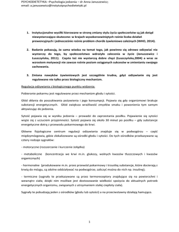 PSYCHODIETETYKA –Psychologia jedzenia – dr Anna Januszewicz; email: [email protected] 1. Instytucjonalne wysiłki kierowane w stronę zmiany stylu życia społeczeństw są jak dotąd niewystarczająco skuteczne: w krajach wysokorozwiniętych rośnie liczba działań prewencyjnych i jednocześnie rośnie problem chorób żywieniowo zależnych (WHO, 2014). 2. Badanie pokazują, że sama wiedza na temat tego, jak powinno się zdrowo odżywiać nie wystarczy do tego, by społeczeństwo wdrożyło zalecenia w życie (Januszewicz i Łuszczyńska, 2011). Często też nie wystarczą dobre chęci (Łuszczyńska,2004) a wraz ze wzrostem motywacji nie zawsze rośnie poziom osiąganych sukcesów w zmienianiu swojego zachowania. 3. Zmiana nawyków żywieniowych jest szczególnie trudna, gdyż odżywianie się jest regulowane nie tylko przez biologiczny mechanizm. Regulacja odżywiania z biologicznego punktu widzenia: Pobieranie pokarmu jest regulowane przez mechanizm głodu i sytości. Głód skłania do poszukiwania pożywienia i jego konsumpcji. Pojawia się gdy organizmowi brakuje substancji energetycznych. Głód zwiększa wrażliwość zmysłów smaku i powonienia tym samym aktywizując do jedzenia. Sytość pojawia się w wyniku jedzenia – prowadzi do zaprzestania posiłku. Pojawienie się sytości wiąże się z uczuciem przyjemności. Sytość pojawia się około 30 minut po posiłku – gdy substancje energetyczne dotrą z przewodu pokarmowego do krwi. Główne fizjologiczne centrum regulacji odżywiania znajduje się w podwzgórzu – część międzymózgowia, gdzie zlokalizowane są ośrodki głodu i sytości. Do tych ośrodków przekazywane są cztery rodzaje sygnałów: - motoryczne (rozszerzanie i kurczenie żołądka) - metaboliczne organicznych) (koncentracja we krwi m.in. glukozy, wolnych kwasów tłuszczowych i kwasów - hormonalne (produkowane m.in. przez przewód pokarmowy i trzustkę substancje, które docierają z krwią do mózgu, są zdolne oddziaływać na podwzgórze; zaliczyć można do nich np. insulinę); - termiczne (sygnały te przekazywane są przez termoreceptory znajdujące się na powierzchni i wewnątrz ciała; dzięki nim możliwe jest dostosowanie wielkości spożycia do aktualnych potrzeb energetycznych organizmu, związanych z utrzymaniem stałej ciepłoty ciała). Sygnały te pobudzają jeden z ośrodków (głodu lub sytości) a na przeciwstawny działają hamująco. 1 PSYCHODIETETYKA –Psychologia jedzenia – dr Anna Januszewicz; email: [email protected] Regulacja jedzenia z psychologicznego punktu widzenia: - Pokusy zwiększają łaknienie: głód nie jest jedyną pobudką do rozpoczęcia jedzenia… Można nie być głodnym ale mieć APETYT na dany produkt. - Nasza świadomość i przekonania mogą wpływać na odczuwany głód i sytość, np. pokarm nieznany może zostać zignorowany przez człowieka głodnego. - W krajach wysokorozwiniętych rzadziej głód jest przyczyną sięgania po pokarm – częściej jest to przyzwyczajenie, nawyk, potrzeba odczuwania przyjemności. 4. Psychospołeczne funkcje jedzenia Czynności związane z odżywianiem się spełniają szereg psychospołecznych ról – szczególnie w krajach wysokorozwiniętych, gdzie głód przestał być problemem: - Jedzenie jako forma okazywania uczuć. Np. zapraszanie na kolację - Jedzenie jako sposób na regulowanie uczuć i reduktor napięcia. Np. podjadanie w stresie - Nieodpowiedni sposób odżywiania się i jego konsekwencje jako sposób na uniknięcie odpowiedzialności. Np. „To wszystko przez to, że jestem gruba” - Jedzenie jako nagroda lub kara. Np. nagradzanie dzieci lizakiem. - Jedzenie lub niejedzenie jako sposób zdobycia kontroli. Np. Poczucie władzy nad swoim życiem w czasie diety –„Od dziś zmieniam swoje życie” - Jedzenie jako element sztuki uwodzenia. „Przez żołądek do serca” - Jedzenie jako substytut więzi. Pocieszanie w razie odczuwanej samotności - Jedzenie jest kojarzone z bliskością już od czasu karmienia dziecka piersią. - Jedzenie jako sposób na zaspokajanie potrzeb seksualnych. Przyjemność płynąca z jedzenia jako kompensacja przyjemności płynącej z seksu. - Jedzenie jako sposób na uniknięcie kontaktów seksualnych. Np. zniechęcanie partnera przez nieatrakcyjny wygląd. - Jedzenie jako sposób wyrażania poglądów: np. wegetarianizm - Niejedzenie – forma zahamowania rozwoju seksualnego (Wychudzenie – dziecięce kształty) - Jedzenie jako sposób wyrażania wiary: posty, Komunia Święta, grzech nieumiarkowania w jedzeniu i piciu… - Jedzenie jako sposób podtrzymywania tradycji: tradycyjne potrawy - Jedzenie jako sposób na podtrzymywanie poczucia tożsamości narodowej, przynależności do grupy: jedzenie potraw narodowych, regionalnych 2 PSYCHODIETETYKA –Psychologia jedzenia – dr Anna Januszewicz; email: [email protected] Za pomocą jedzenia, ludzie zaspokajają różne swoje potrzeby uwzględnione w piramidzie Maslowa (1954): REALIZOWANIE NIEKTÓRYCH POTRZEB PSYCHICZNYCH LUB REGULOWANIE EMOCJI ZA POMOCĄ ODŻYWIANIA NIE JEST SAMO W SOBIE OBJAWEM PATOLOGII – MOŻE BYĆ JEDNAK SYMPTOMEM CHOROBY KIEDY STANIE SIĘ GŁÓWNYM ALBO JEDYNYM SPOSOBEM ZASPOKAJANIA DANYCH POTRZEB PSYCHOLOGICZNYCH. W toku życia uczymy się zaspokajać psychologiczne potrzeby za pomocą jedzenia: - Karmienie piersią =bliskość. - Posiłki w towarzystwie = radość, akceptacja innych, bliskość. 5. Niepowodzenie w regulowaniu odżywiania – szczególnie częste u osób odchudzających się Duże badania przeprowadzone przez Uniwersytet w Harwardzie pokazały, że okresy obżerania się, postrzegane jako kłopotliwe, występują u co piątej kobiety (Heatherton, 1993b). Wielu ludzi z nadwaga ma problemy z przejadaniem się, bo próbują się odchudzać… Odchudzanie się i ucztowanie to klasyczny przykład załamania samoregulacji. Stosowanie diety jako sposobu na schudnięcie jest z reguły nieskuteczne. Badania pokazują, że 9